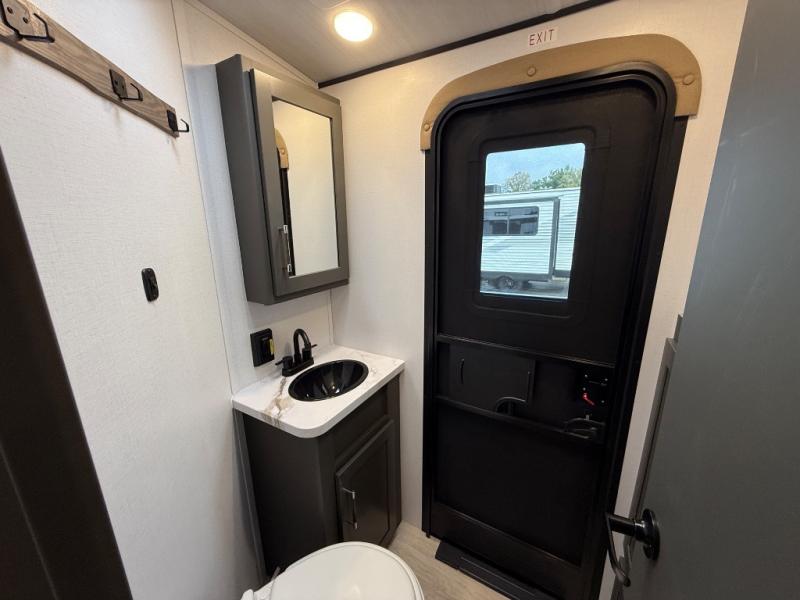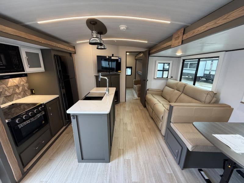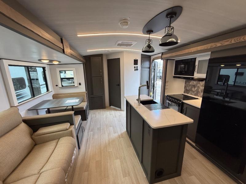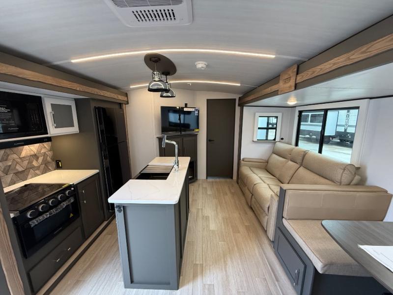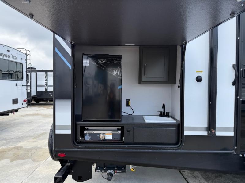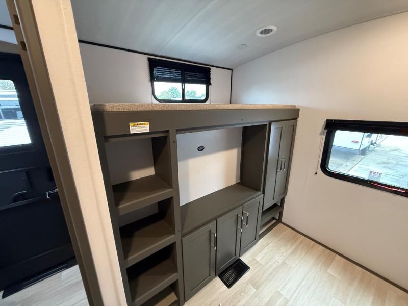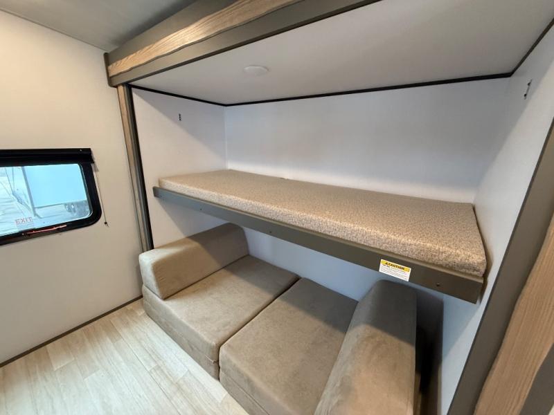 This travel trailer is one the whole gang will love! There is a rear private bunkhouse suite for your guests or the kids, plus a front master bedroom for you. The bunkhouse includes a tri-fold sofa with a flip-up bunk across from a second bunk, plus there is a half bath with its own exterior entry door! The full walk-through bath leads into the front bedroom where you'll find a queen bed and dual wardrobes to keep your room tidy. Dual opposing slides in the combined living area and kitchen will provide ample space to move about, and you will find comfy seating on the tri-fold sofa and Do-More dinette table. There is even a fireplace and an entertainment center!