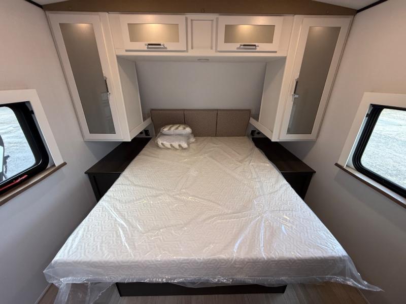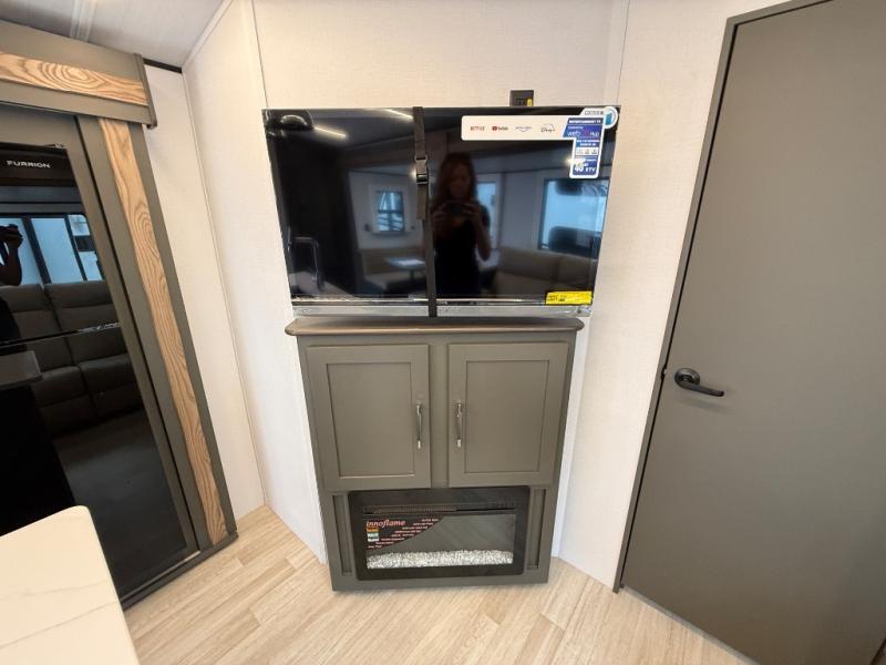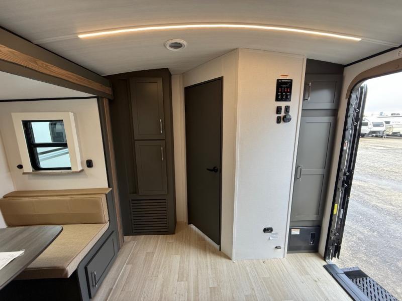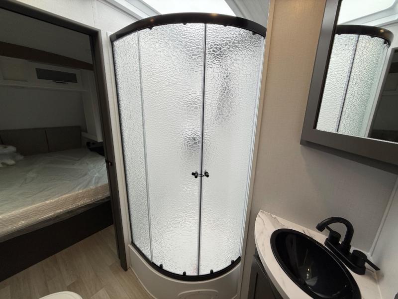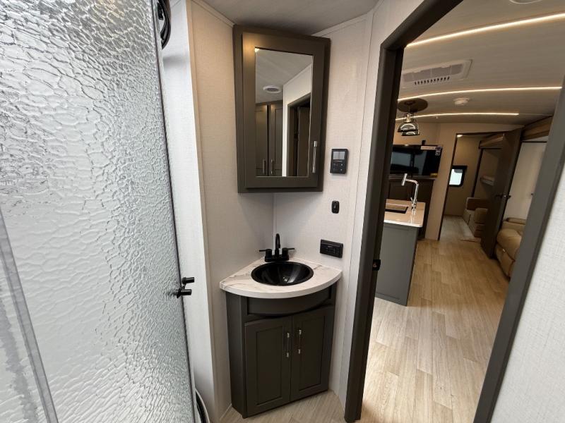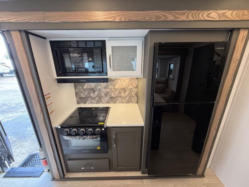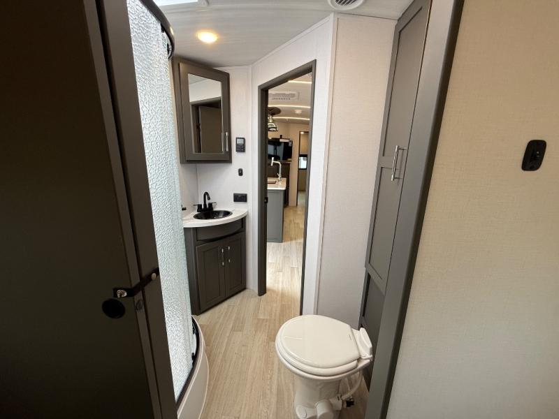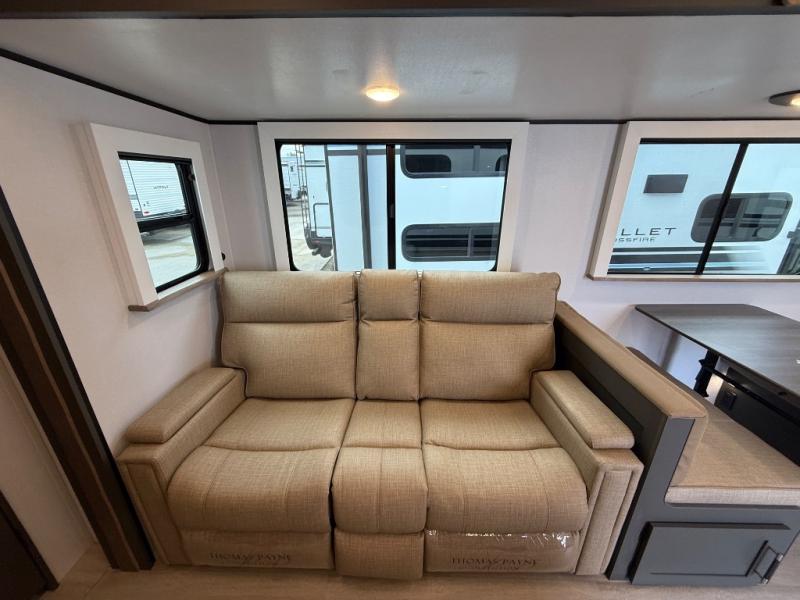 This travel trailer is one the whole gang will love! There is a rear private bunkhouse suite for your guests or the kids, plus a front master bedroom for you. The bunkhouse includes a tri-fold sofa with a flip-up bunk across from a second bunk, plus there is a half bath with its own exterior entry door! The full walk-through bath leads into the front bedroom where you'll find a queen bed and dual wardrobes to keep your room tidy. Dual opposing slides in the combined living area and kitchen will provide ample space to move about, and you will find comfy seating on the tri-fold sofa and Do-More dinette table. There is even a fireplace and an entertainment center!