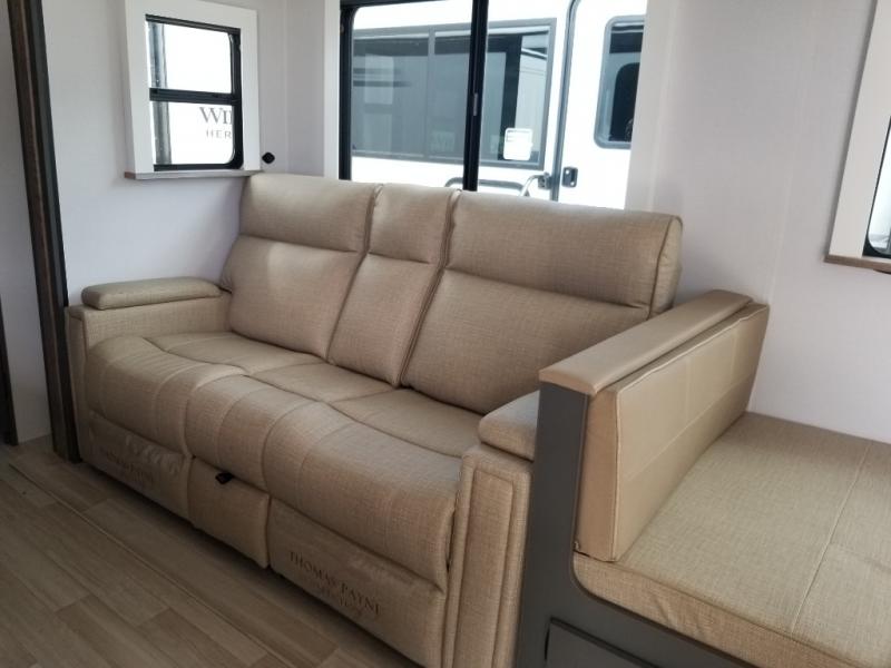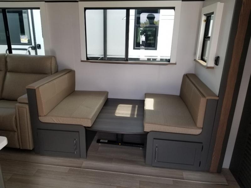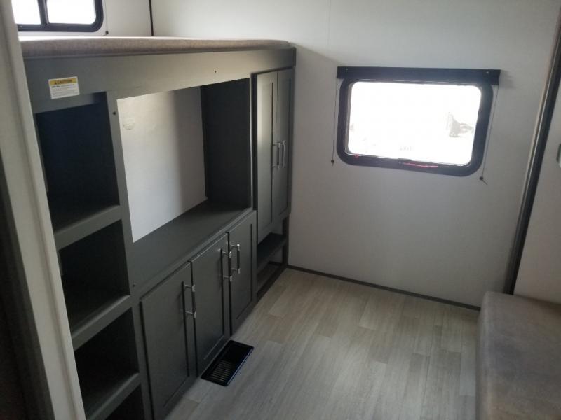 This travel trailer is one the whole gang will love! There is a rear private bunkhouse suite for your guests or the kids, plus a front master bedroom for you. The bunkhouse includes a tri-fold sofa with a flip-up bunk across from a second bunk, plus there is a half bath with its own exterior entry door! The full walk-through bath leads into the front bedroom where you'll find a queen bed and dual wardrobes to keep your room tidy. Dual opposing slides in the combined living area and kitchen will provide ample space to move about, and you will find comfy seating on the tri-fold sofa and Do-More dinette table. There is even a fireplace and an entertainment center!
