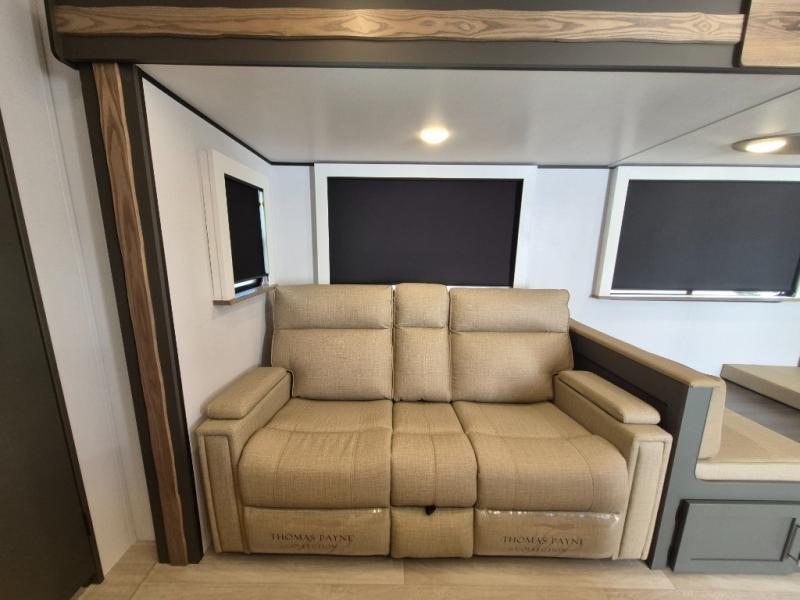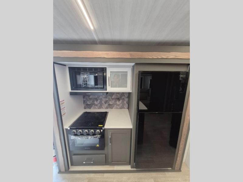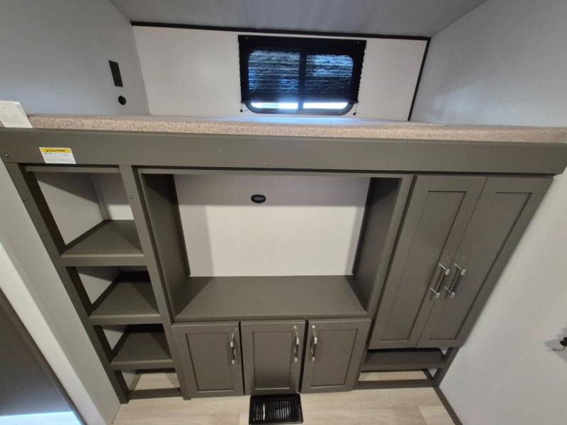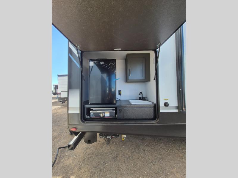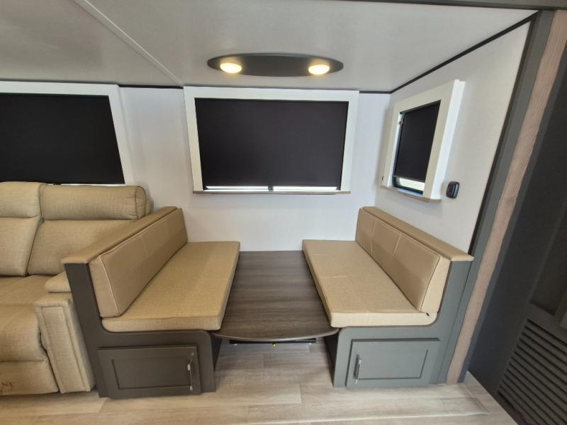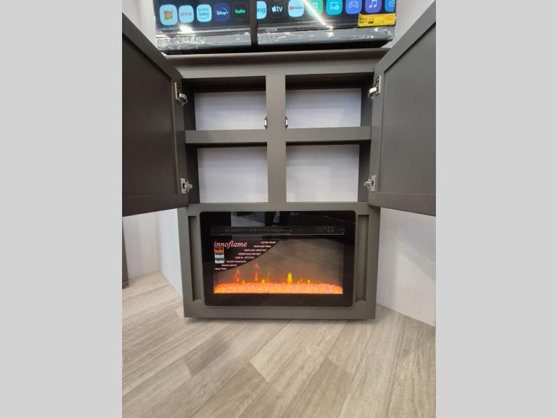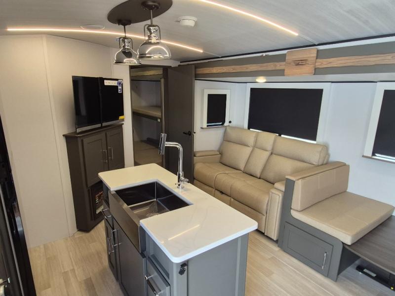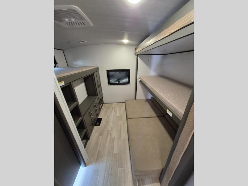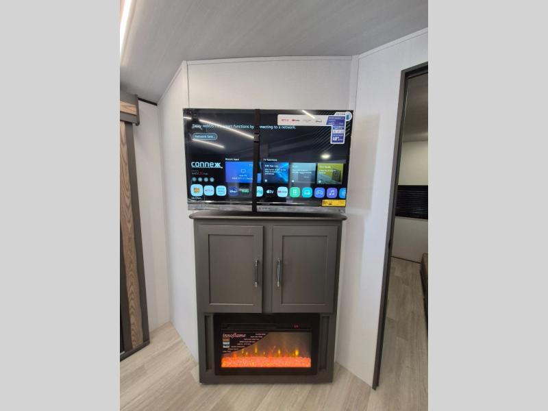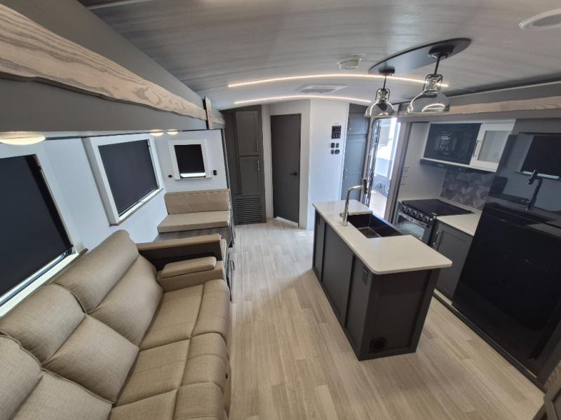 This travel trailer is one the whole gang will love! There is a rear private bunkhouse suite for your guests or the kids, plus a front master bedroom for you. The bunkhouse includes a tri-fold sofa with a flip-up bunk across from a second bunk, plus there is a half bath with its own exterior entry door! The full walk-through bath leads into the front bedroom where you'll find a queen bed and dual wardrobes to keep your room tidy. Dual opposing slides in the combined living area and kitchen will provide ample space to move about, and you will find comfy seating on the tri-fold sofa and Do-More dinette table. There is even a fireplace and an entertainment center!