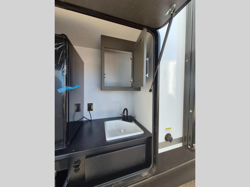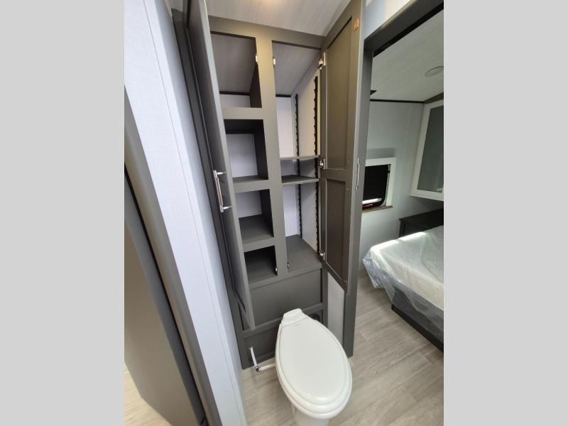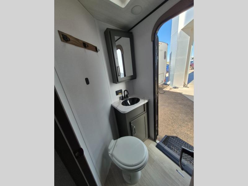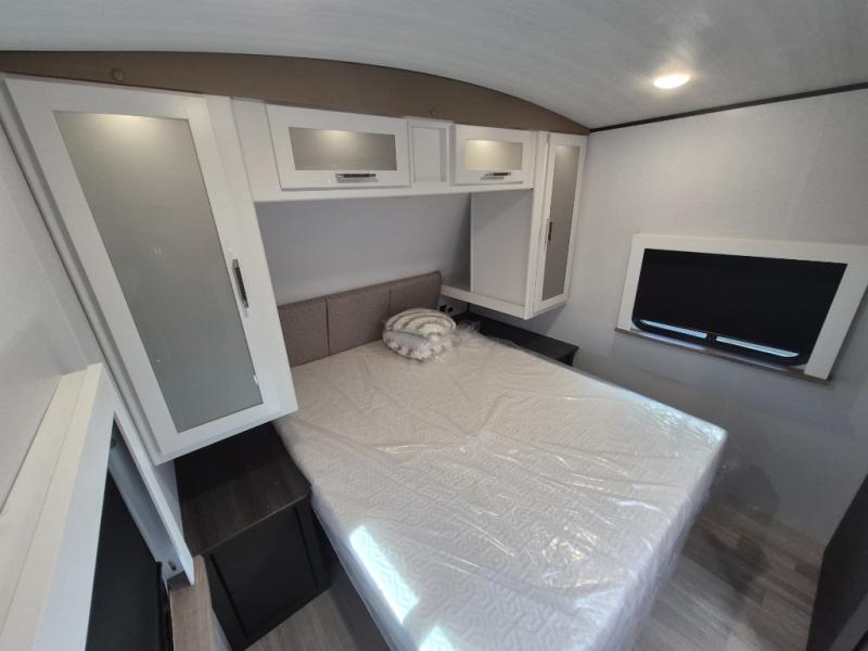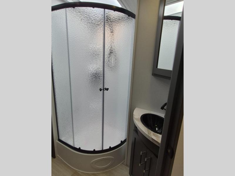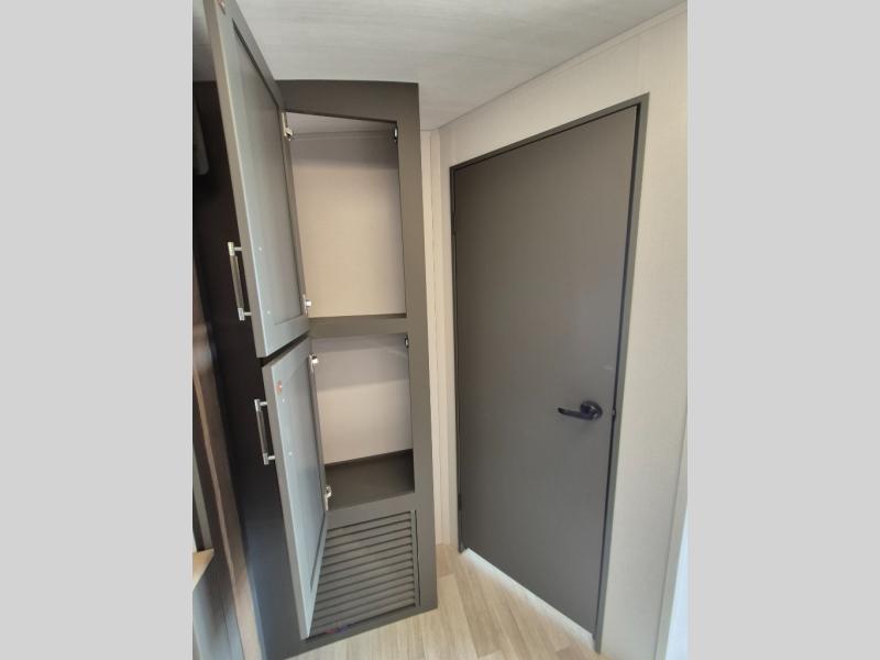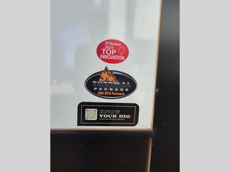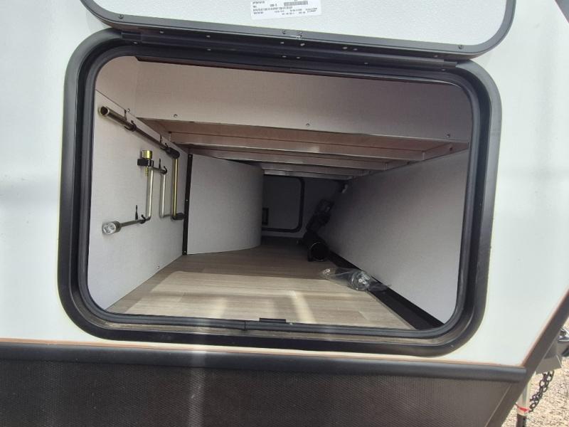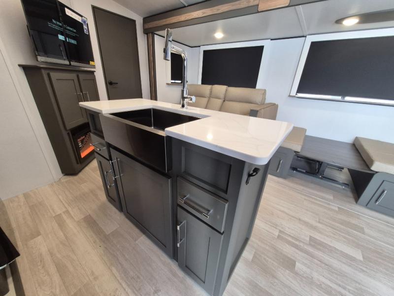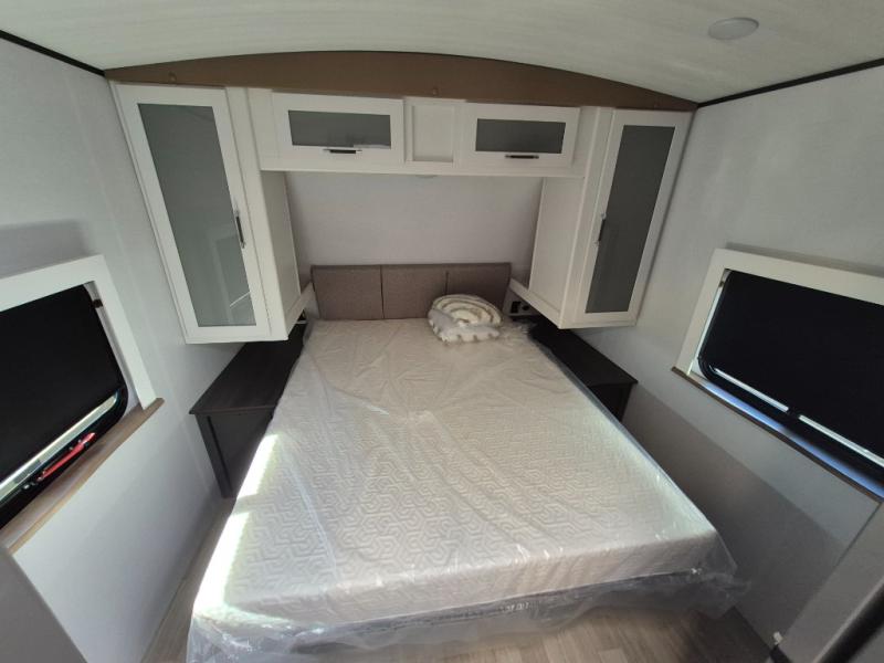This travel trailer is one the whole gang will love! There is a rear private bunkhouse suite for your guests or the kids, plus a front master bedroom for you. The bunkhouse includes a tri-fold sofa with a flip-up bunk across from a second bunk, plus there is a half bath with its own exterior entry door! The full walk-through bath leads into the front bedroom where you'll find a queen bed and dual wardrobes to keep your room tidy. Dual opposing slides in the combined living area and kitchen will provide ample space to move about, and you will find comfy seating on the tri-fold sofa and Do-More dinette table. There is even a fireplace and an entertainment center!