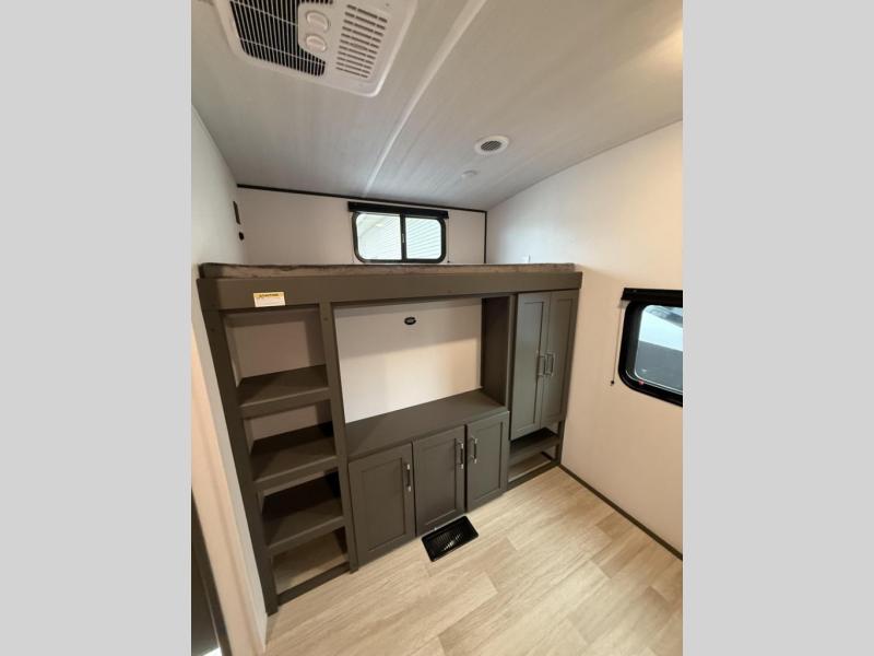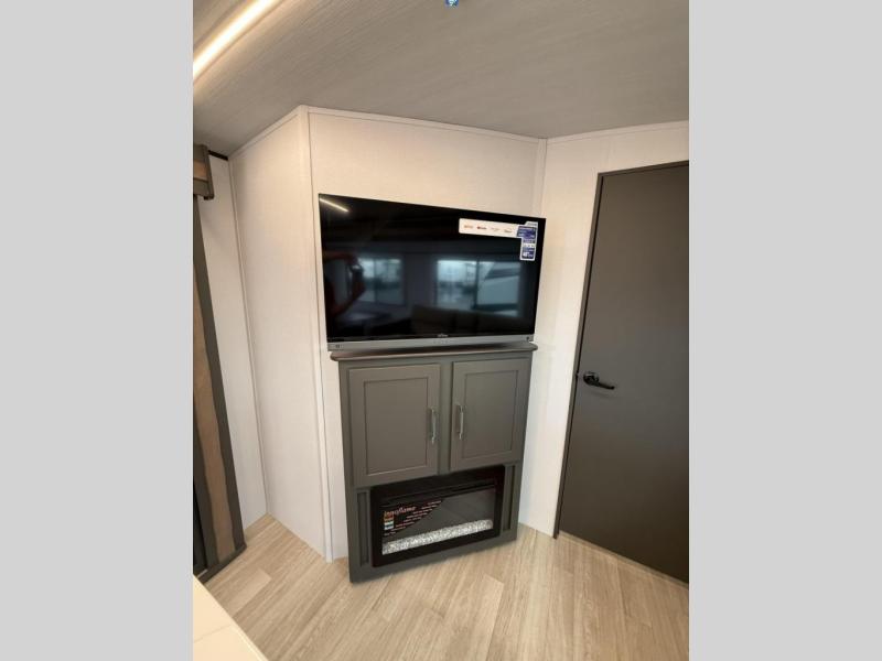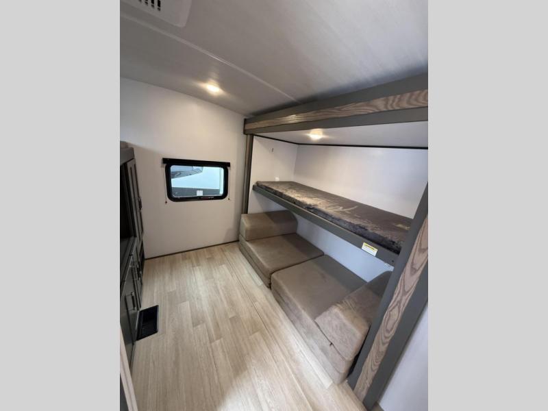 This travel trailer is one the whole gang will love! There is a rear private bunkhouse suite for your guests or the kids, plus a front master bedroom for you. The bunkhouse includes a tri-fold sofa with a flip-up bunk across from a second bunk, plus there is a half bath with its own exterior entry door! The full walk-through bath leads into the front bedroom where you'll find a queen bed and dual wardrobes to keep your room tidy. Dual opposing slides in the combined living area and kitchen will provide ample space to move about, and you will find comfy seating on the tri-fold sofa and Do-More dinette table. There is even a fireplace and an entertainment center!