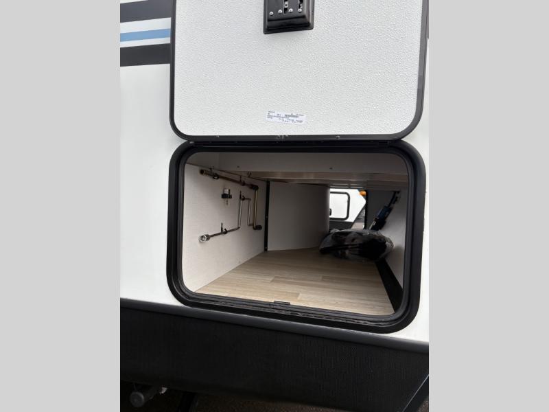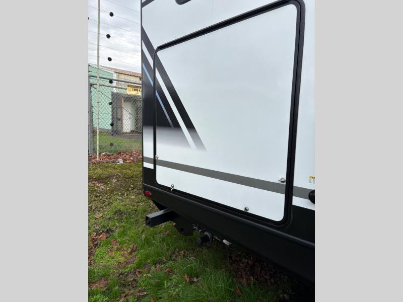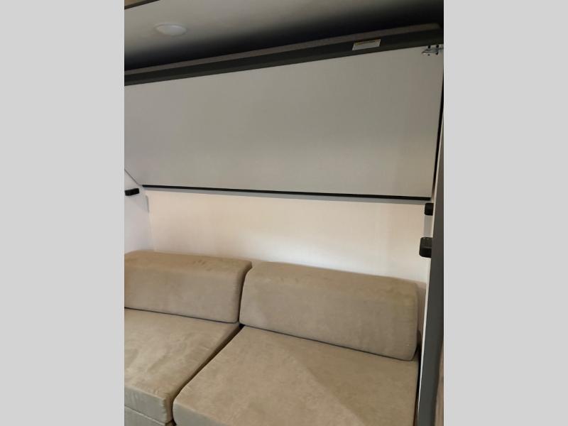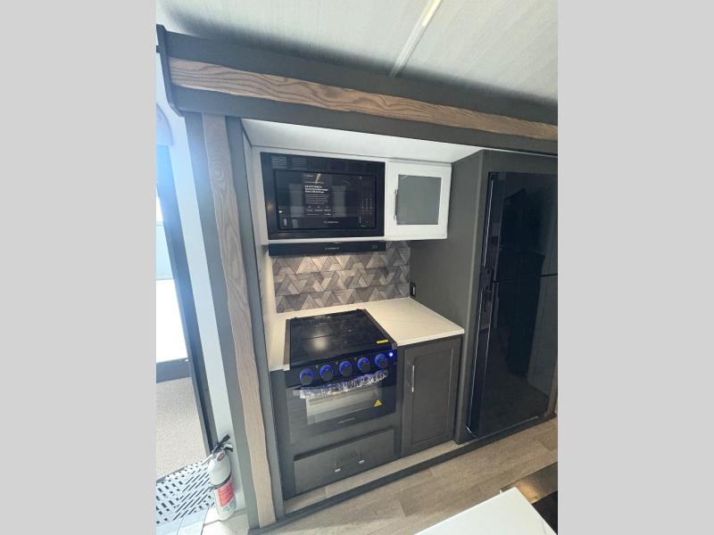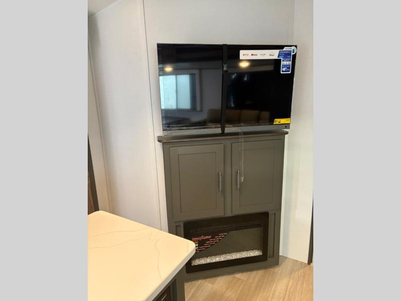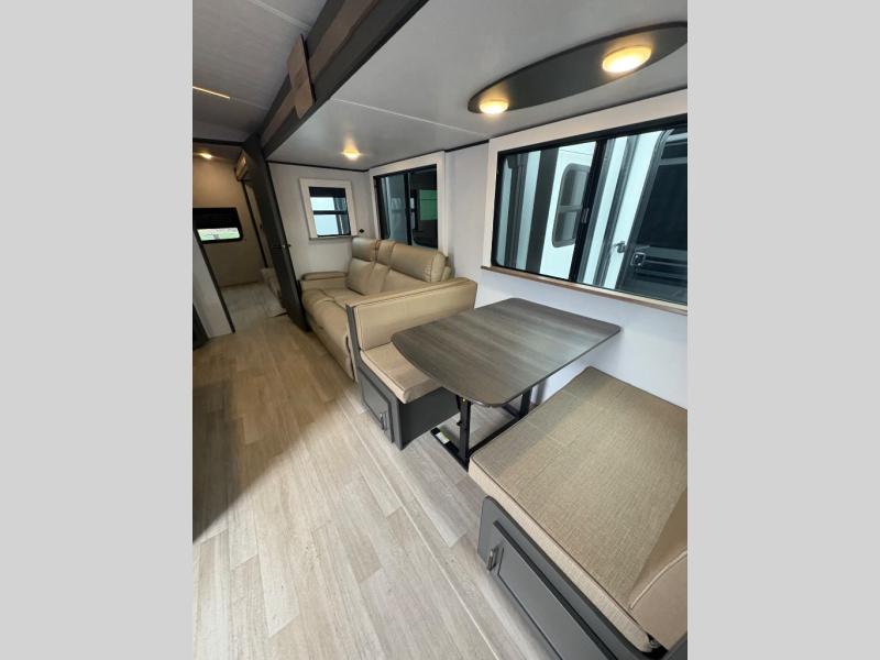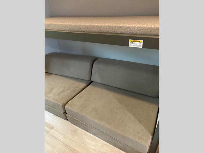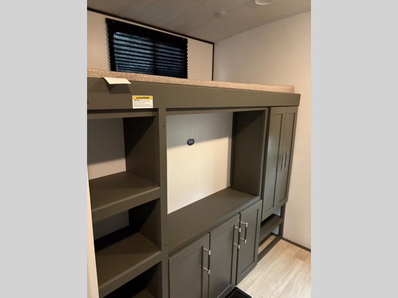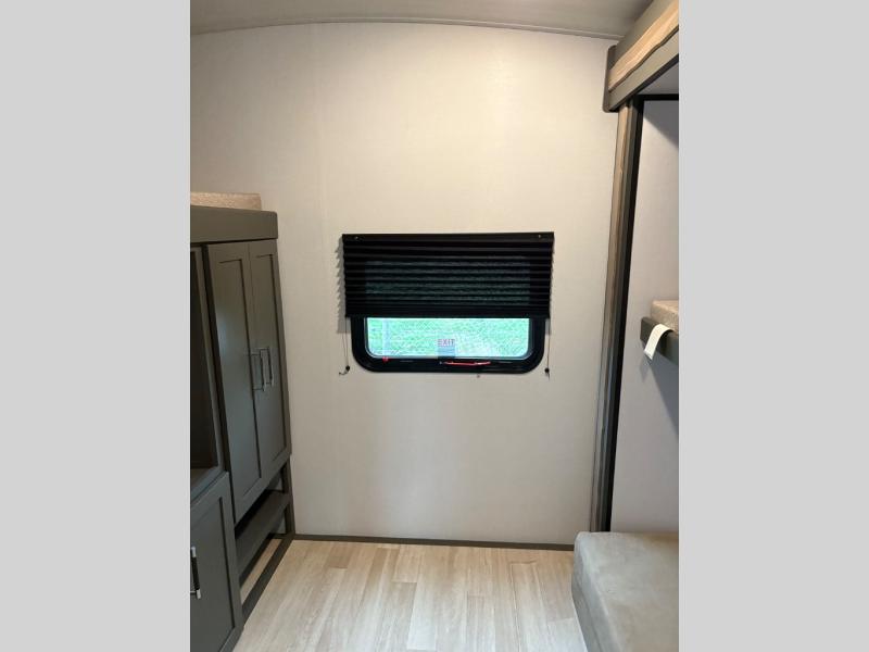 This travel trailer is one the whole gang will love! There is a rear private bunkhouse suite for your guests or the kids, plus a front master bedroom for you. The bunkhouse includes a tri-fold sofa with a flip-up bunk across from a second bunk, plus there is a half bath with its own exterior entry door! The full walk-through bath leads into the front bedroom where you'll find a queen bed and dual wardrobes to keep your room tidy. Dual opposing slides in the combined living area and kitchen will provide ample space to move about, and you will find comfy seating on the tri-fold sofa and Do-More dinette table. There is even a fireplace and an entertainment center!