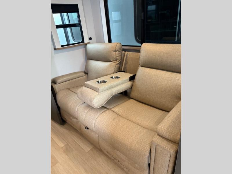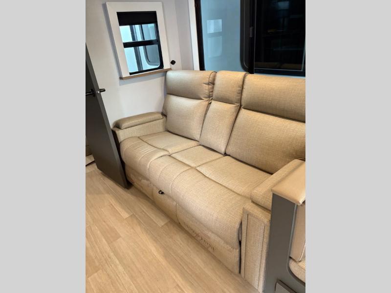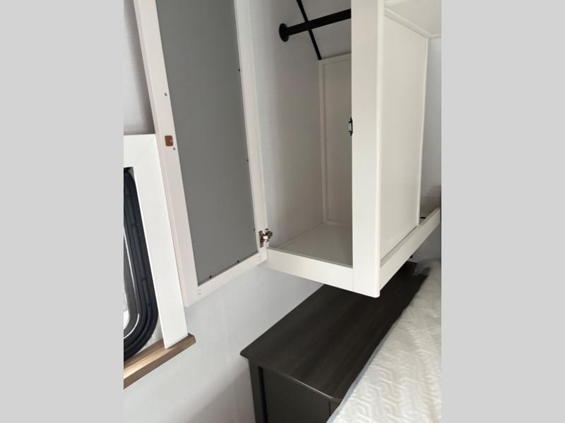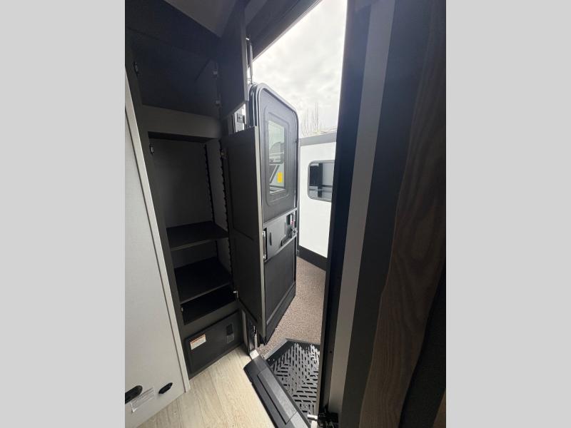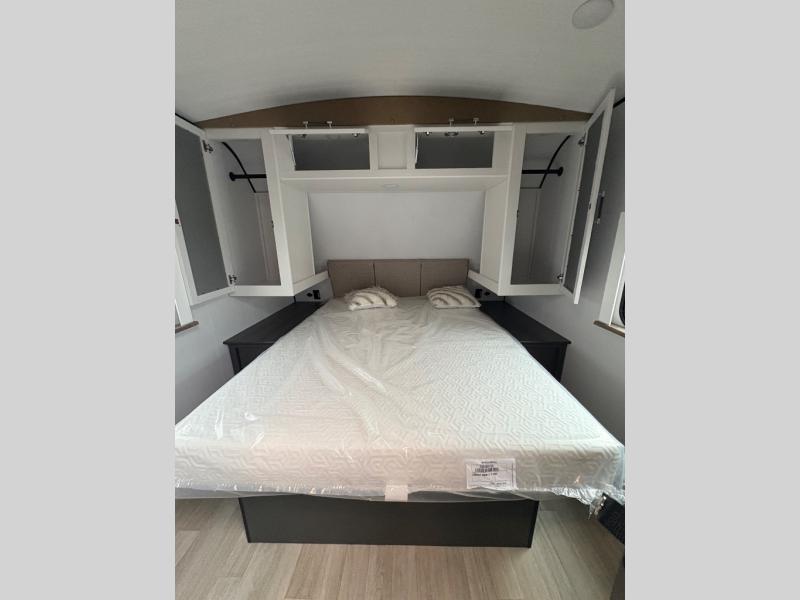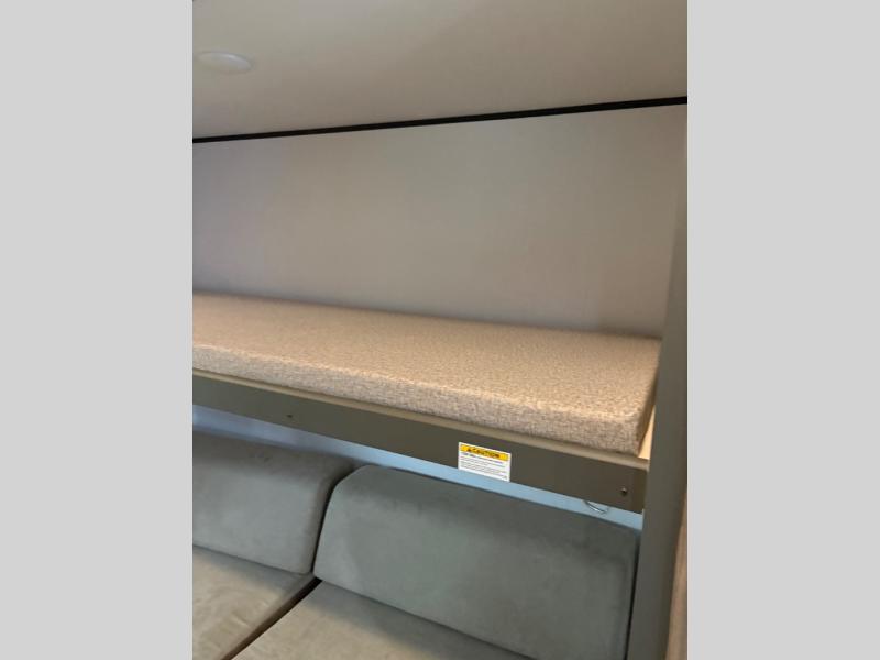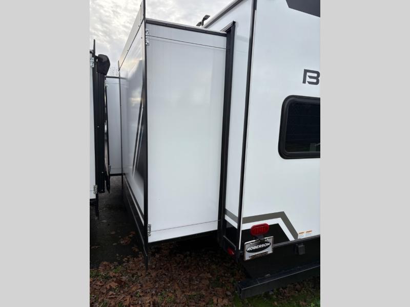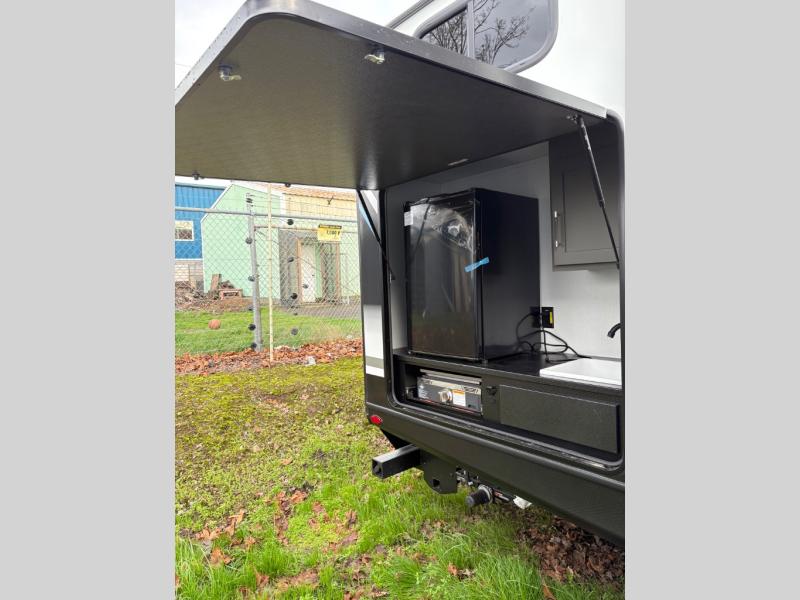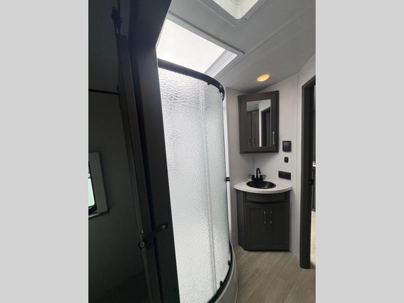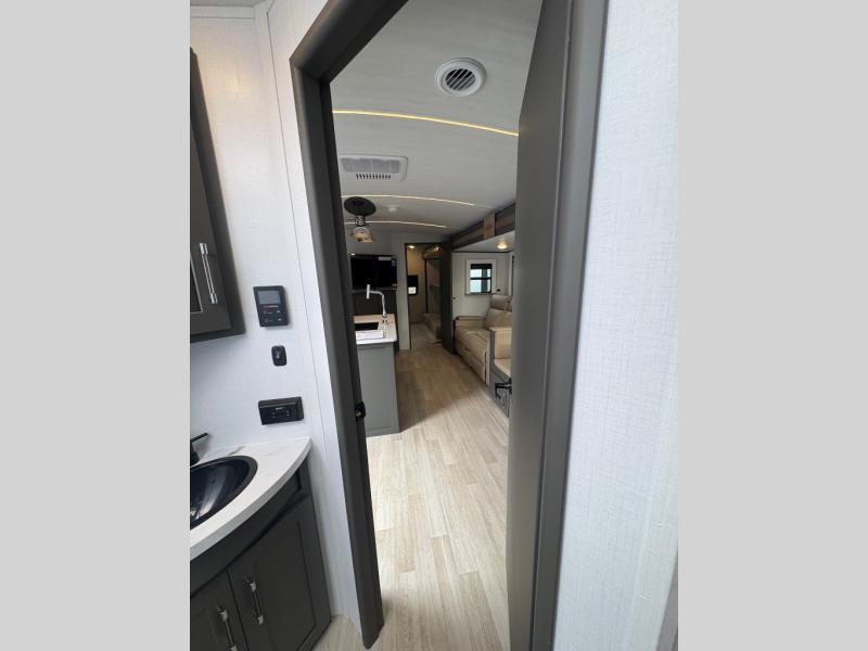 This travel trailer is one the whole gang will love! There is a rear private bunkhouse suite for your guests or the kids, plus a front master bedroom for you. The bunkhouse includes a tri-fold sofa with a flip-up bunk across from a second bunk, plus there is a half bath with its own exterior entry door! The full walk-through bath leads into the front bedroom where you'll find a queen bed and dual wardrobes to keep your room tidy. Dual opposing slides in the combined living area and kitchen will provide ample space to move about, and you will find comfy seating on the tri-fold sofa and Do-More dinette table. There is even a fireplace and an entertainment center!