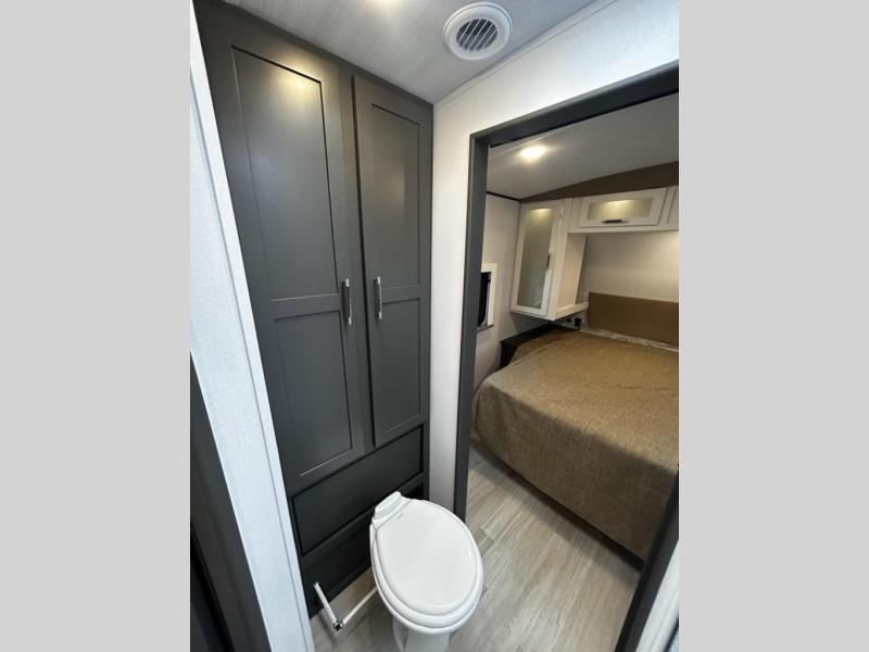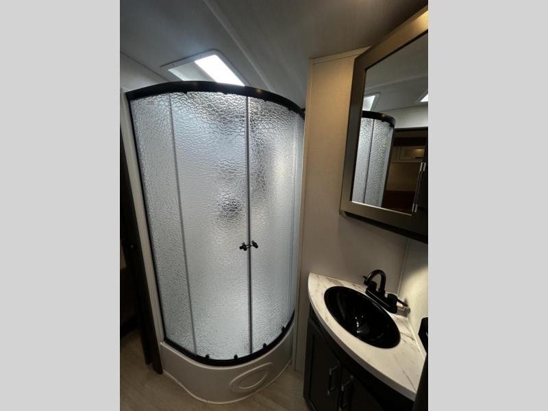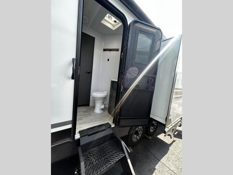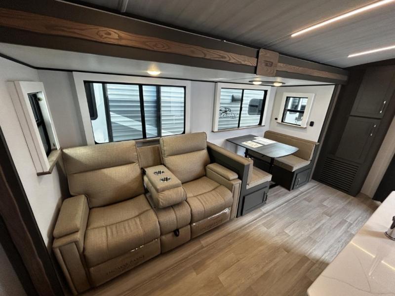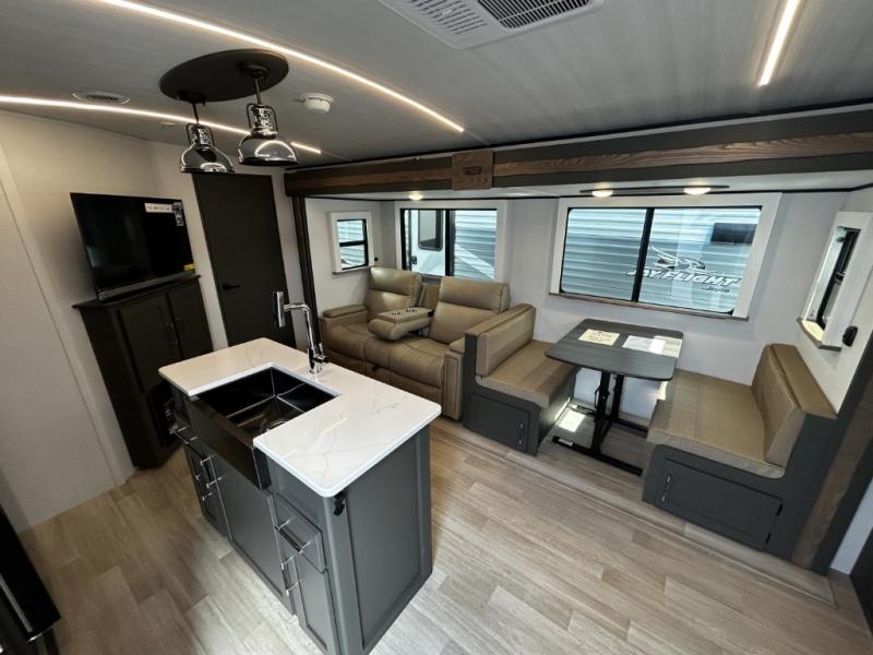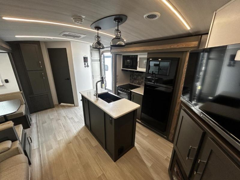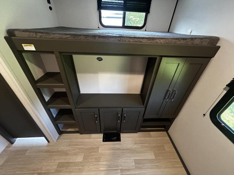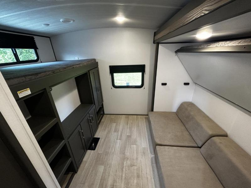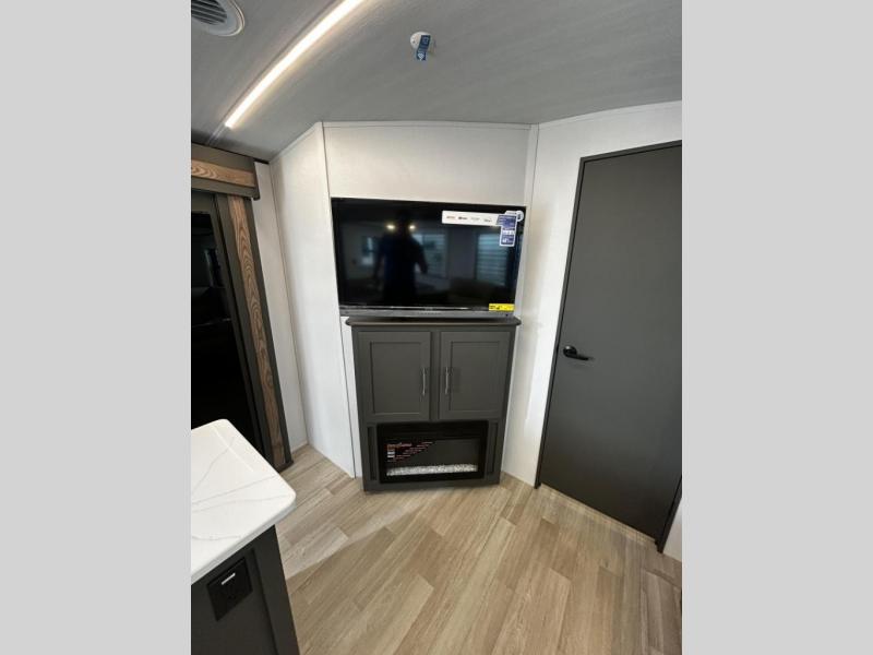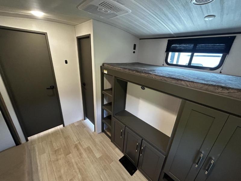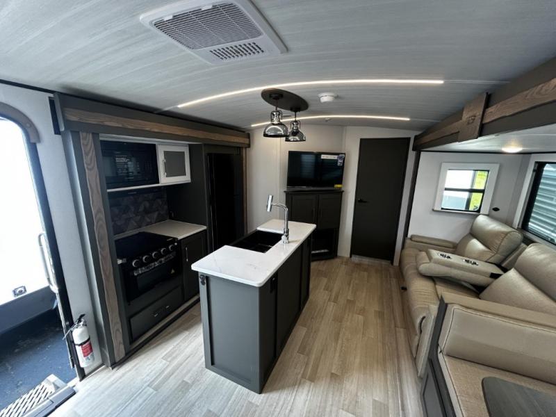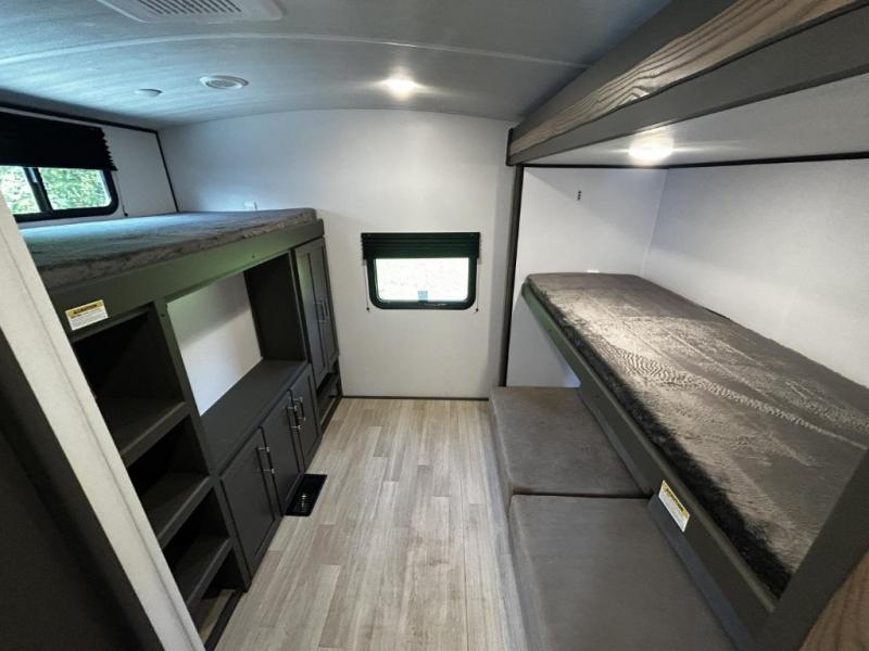 This travel trailer is one the whole gang will love! There is a rear private bunkhouse suite for your guests or the kids, plus a front master bedroom for you. The bunkhouse includes a tri-fold sofa with a flip-up bunk across from a second bunk, plus there is a half bath with its own exterior entry door! The full walk-through bath leads into the front bedroom where you'll find a queen bed and dual wardrobes to keep your room tidy. Dual opposing slides in the combined living area and kitchen will provide ample space to move about, and you will find comfy seating on the tri-fold sofa and Do-More dinette table. There is even a fireplace and an entertainment center!