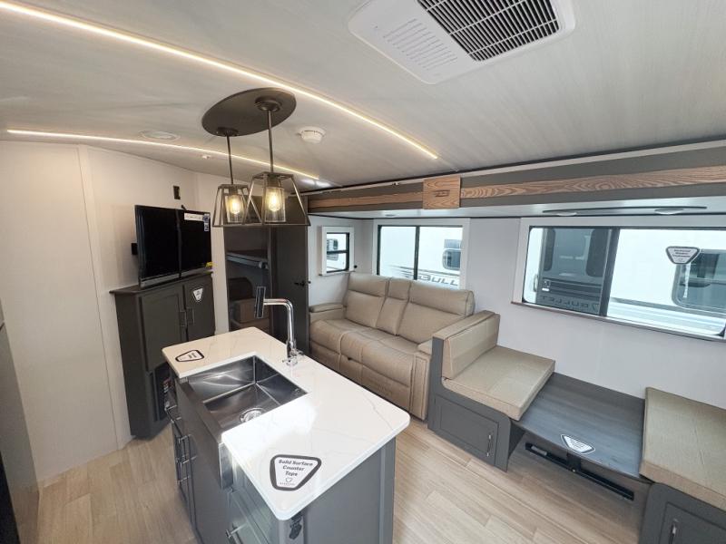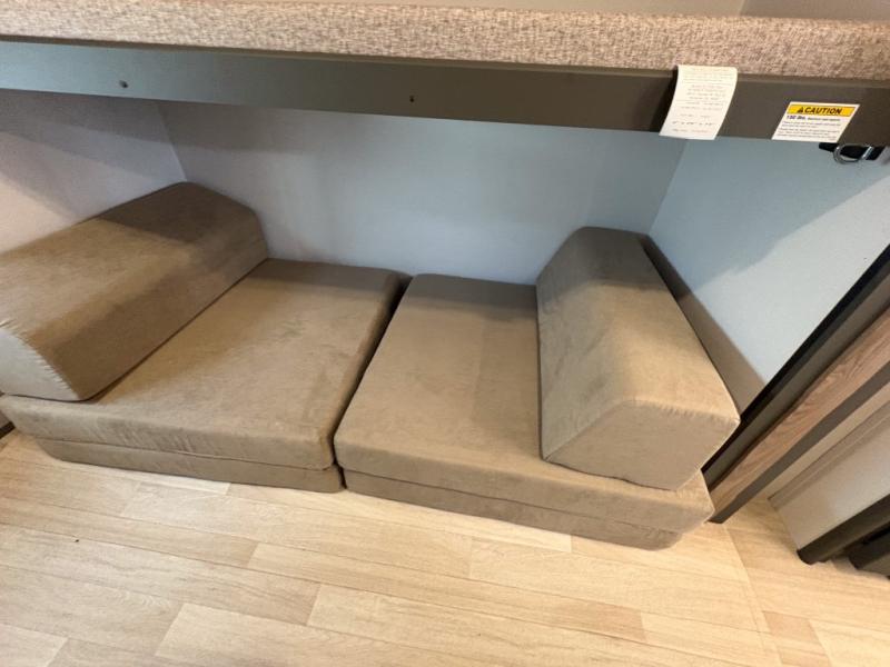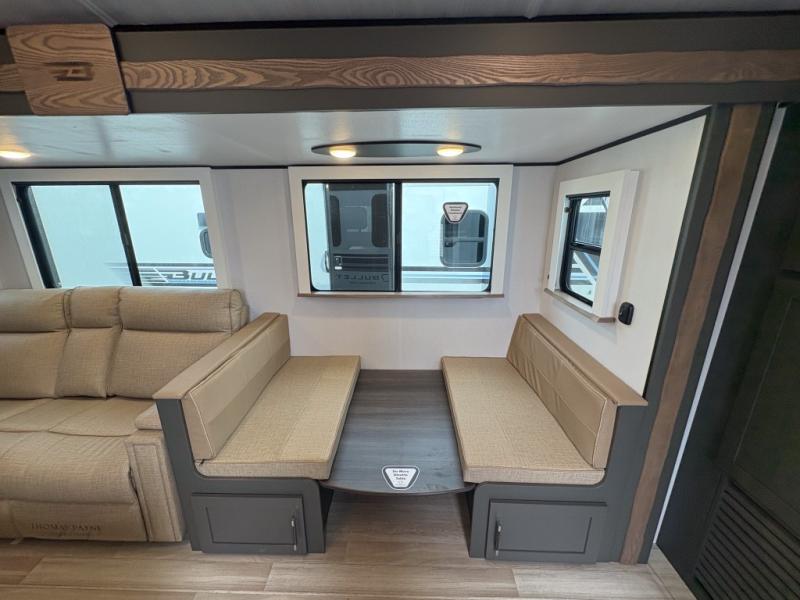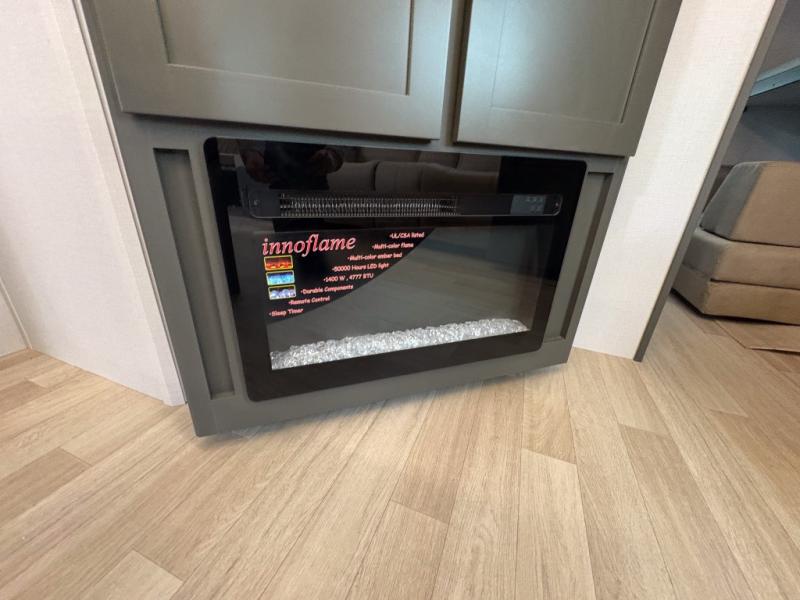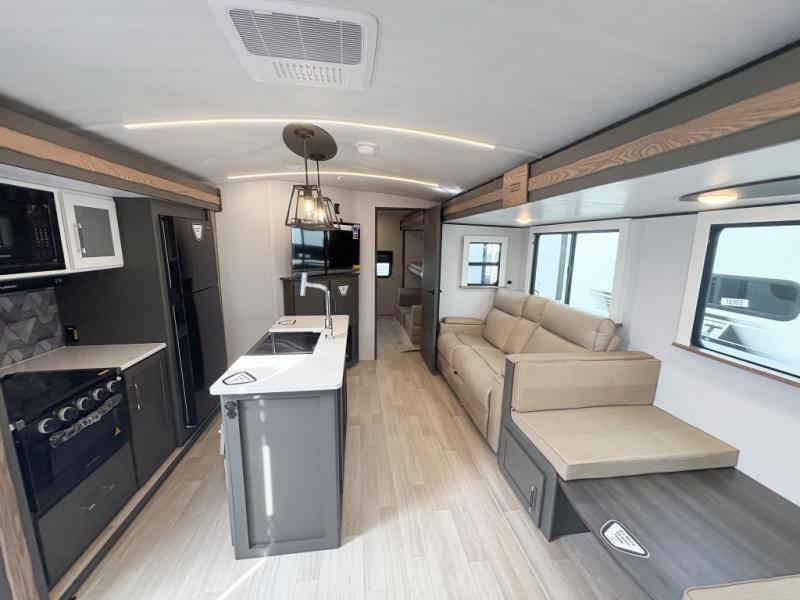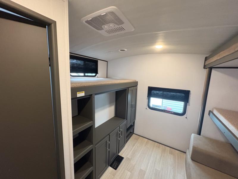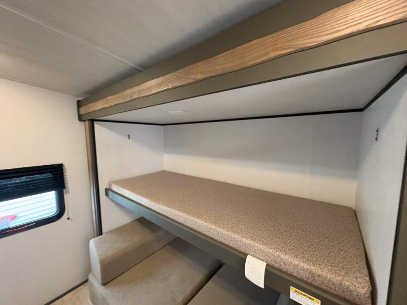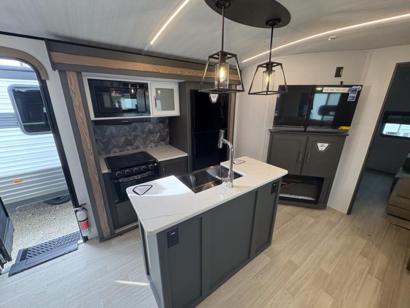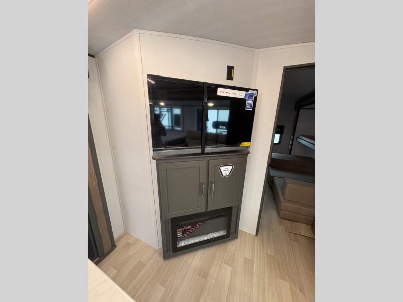 This travel trailer is one the whole gang will love! There is a rear private bunkhouse suite for your guests or the kids, plus a front master bedroom for you. The bunkhouse includes a tri-fold sofa with a flip-up bunk across from a second bunk, plus there is a half bath with its own exterior entry door! The full walk-through bath leads into the front bedroom where you'll find a queen bed and dual wardrobes to keep your room tidy. Dual opposing slides in the combined living area and kitchen will provide ample space to move about, and you will find comfy seating on the tri-fold sofa and Do-More dinette table. There is even a fireplace and an entertainment center!