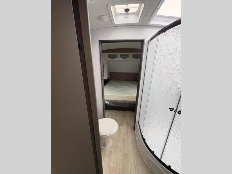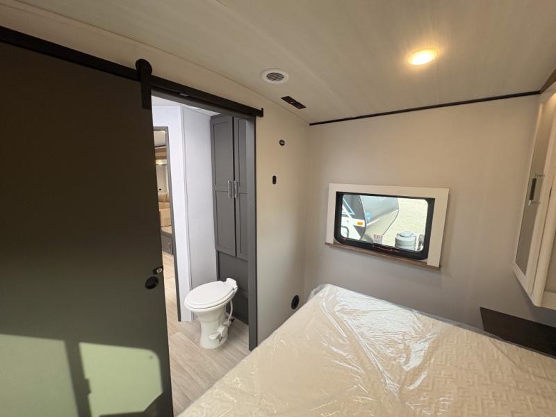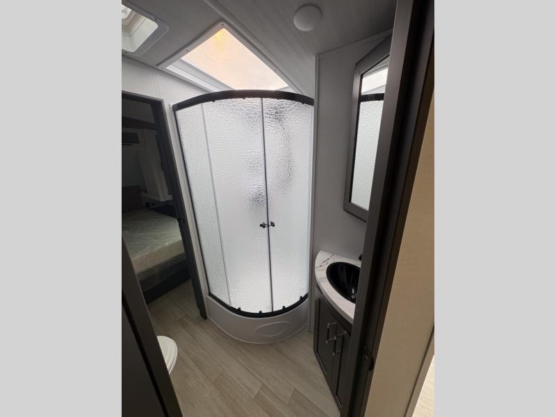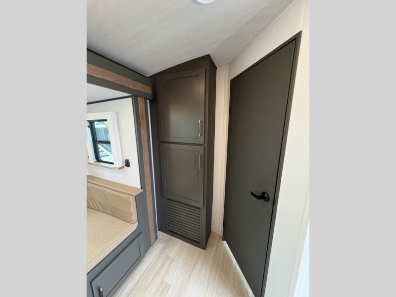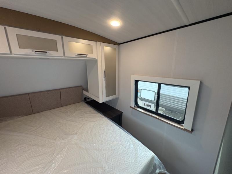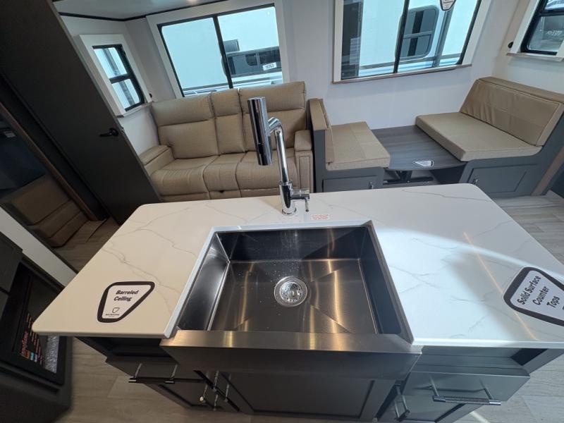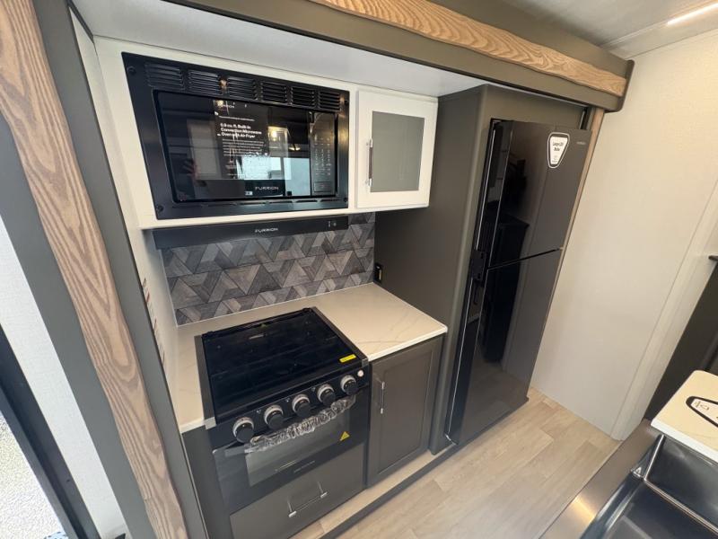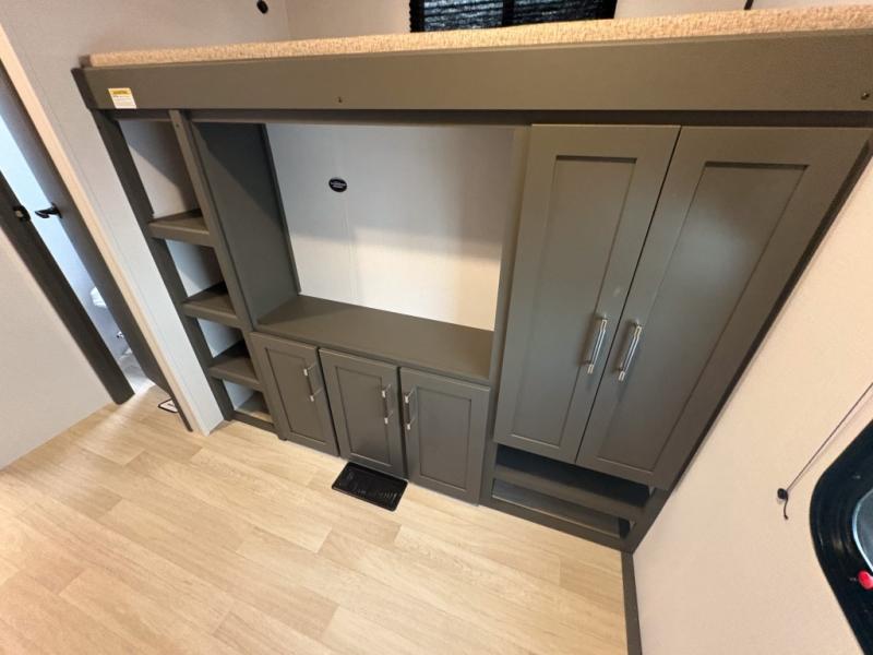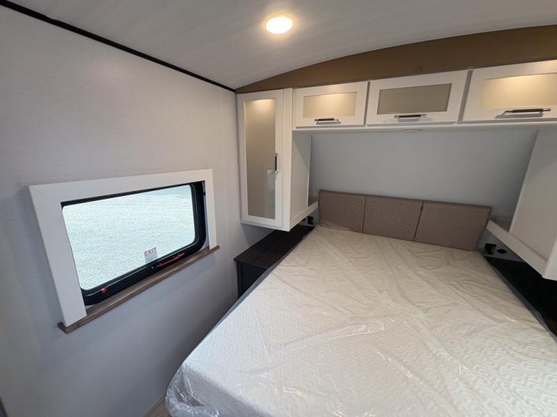 This travel trailer is one the whole gang will love! There is a rear private bunkhouse suite for your guests or the kids, plus a front master bedroom for you. The bunkhouse includes a tri-fold sofa with a flip-up bunk across from a second bunk, plus there is a half bath with its own exterior entry door! The full walk-through bath leads into the front bedroom where you'll find a queen bed and dual wardrobes to keep your room tidy. Dual opposing slides in the combined living area and kitchen will provide ample space to move about, and you will find comfy seating on the tri-fold sofa and Do-More dinette table. There is even a fireplace and an entertainment center!