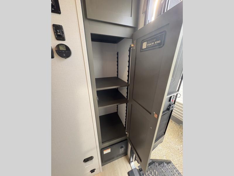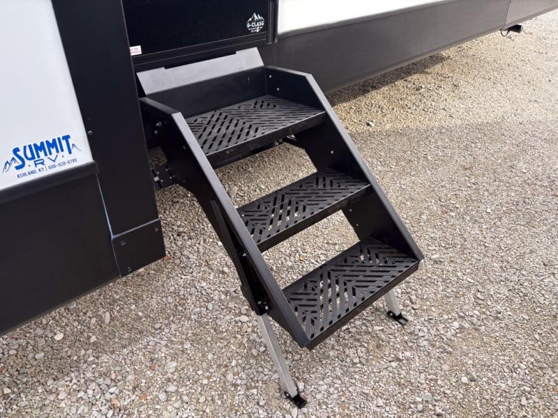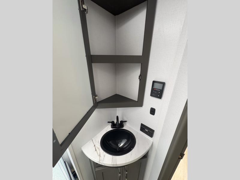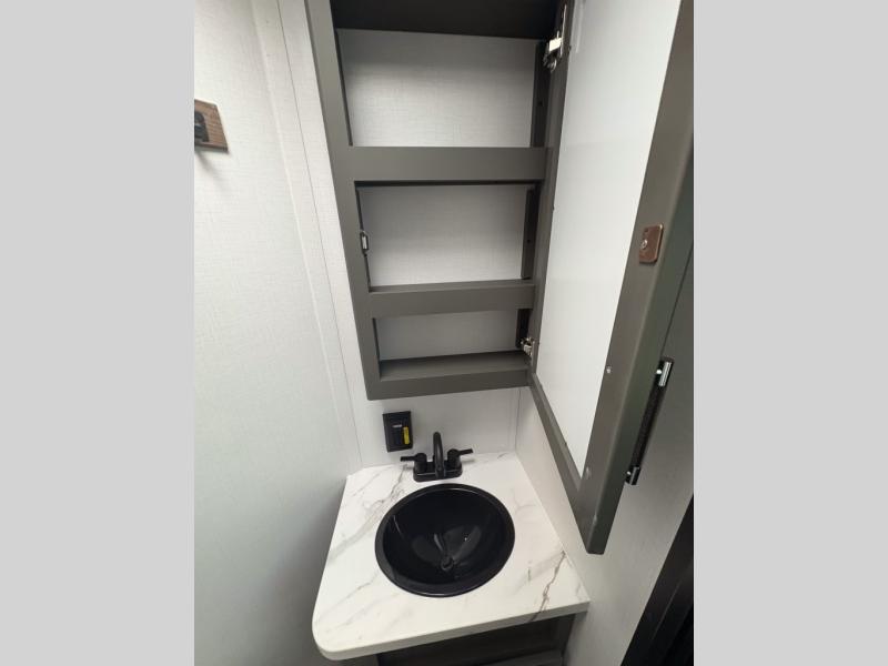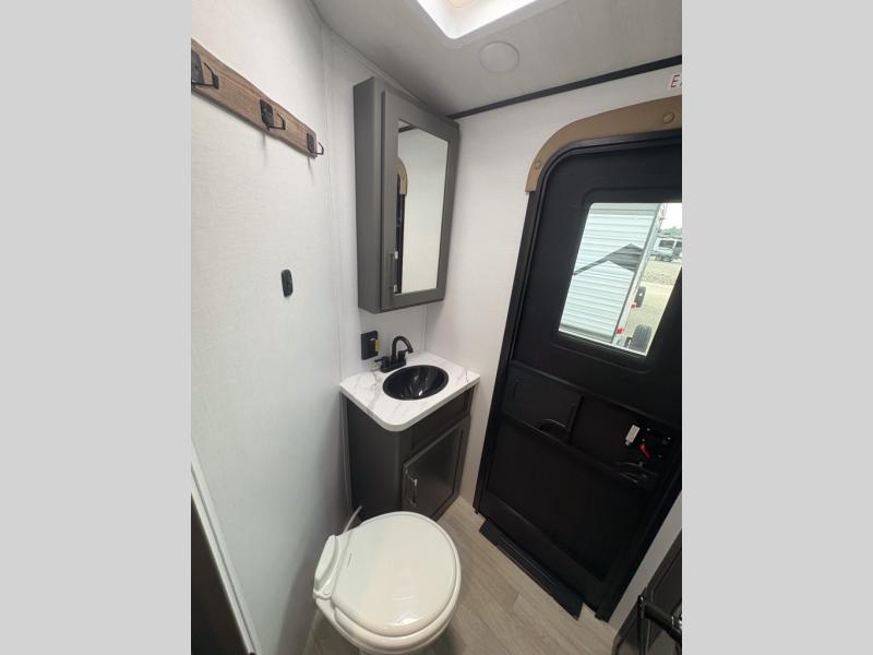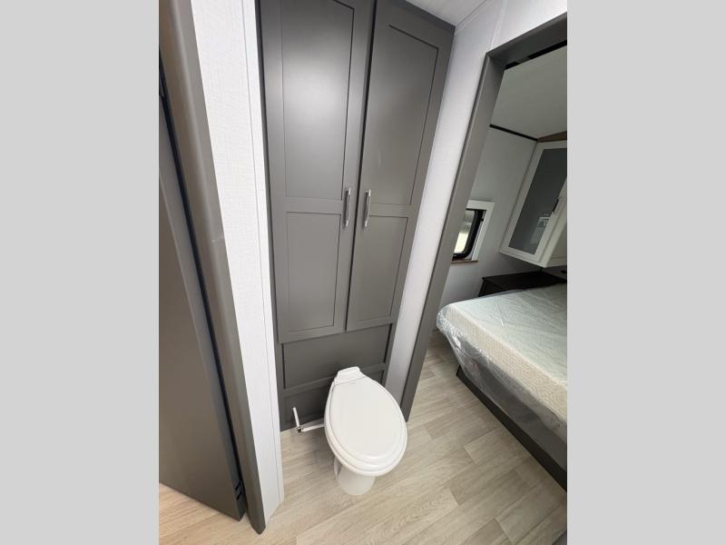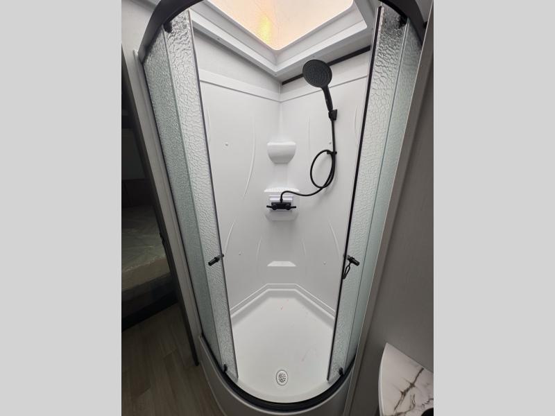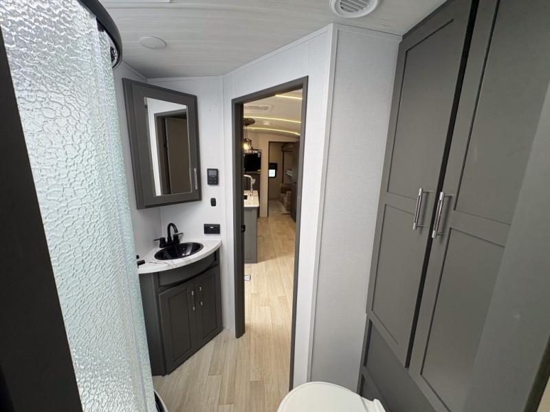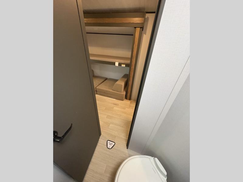 This travel trailer is one the whole gang will love! There is a rear private bunkhouse suite for your guests or the kids, plus a front master bedroom for you. The bunkhouse includes a tri-fold sofa with a flip-up bunk across from a second bunk, plus there is a half bath with its own exterior entry door! The full walk-through bath leads into the front bedroom where you'll find a queen bed and dual wardrobes to keep your room tidy. Dual opposing slides in the combined living area and kitchen will provide ample space to move about, and you will find comfy seating on the tri-fold sofa and Do-More dinette table. There is even a fireplace and an entertainment center!