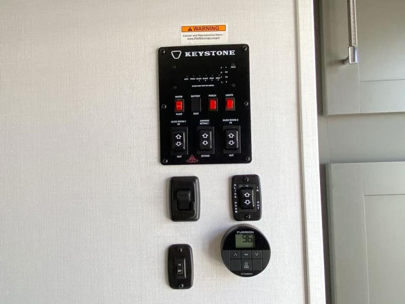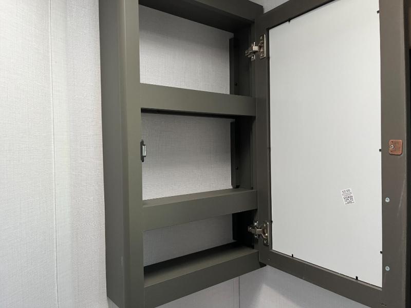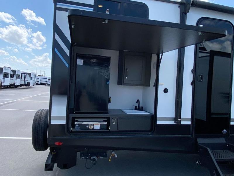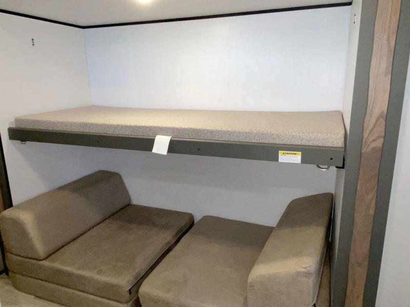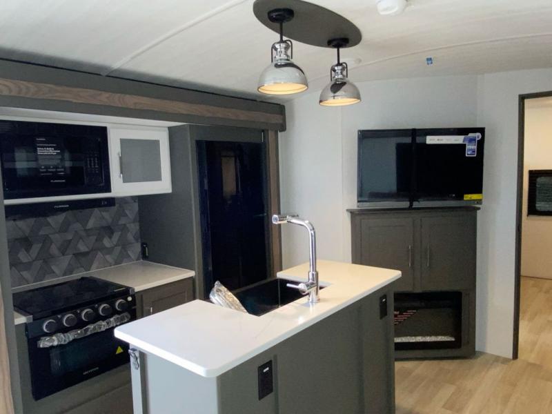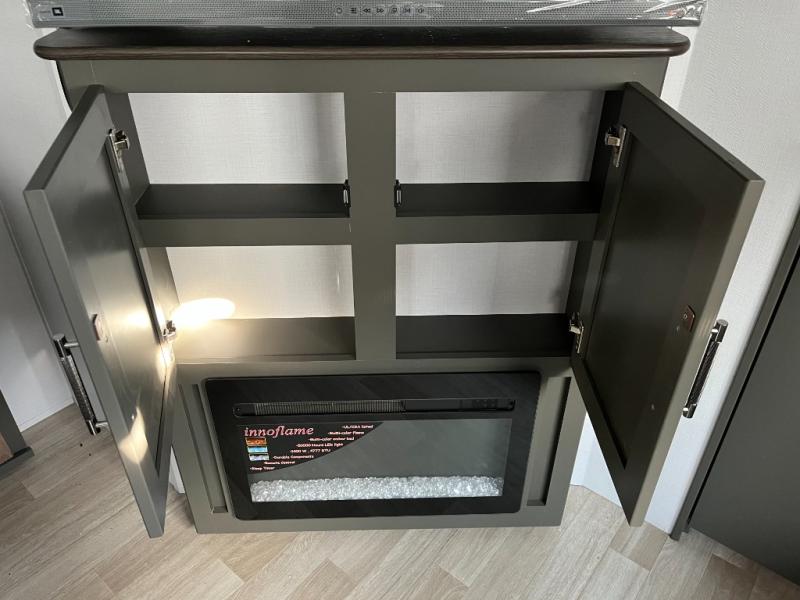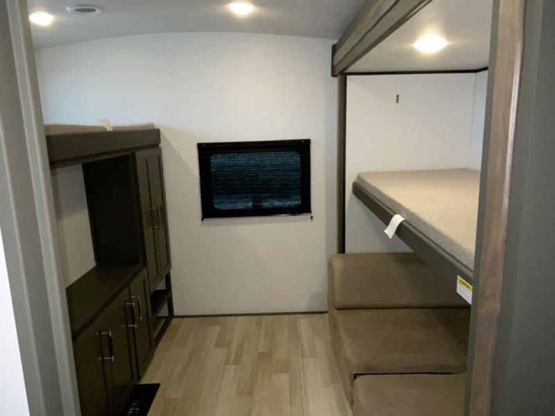 This travel trailer is one the whole gang will love! There is a rear private bunkhouse suite for your guests or the kids, plus a front master bedroom for you. The bunkhouse includes a tri-fold sofa with a flip-up bunk across from a second bunk, plus there is a half bath with its own exterior entry door! The full walk-through bath leads into the front bedroom where you'll find a queen bed and dual wardrobes to keep your room tidy. Dual opposing slides in the combined living area and kitchen will provide ample space to move about, and you will find comfy seating on the tri-fold sofa and Do-More dinette table. There is even a fireplace and an entertainment center!