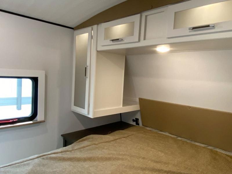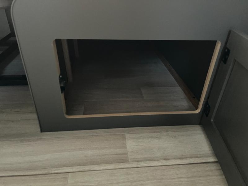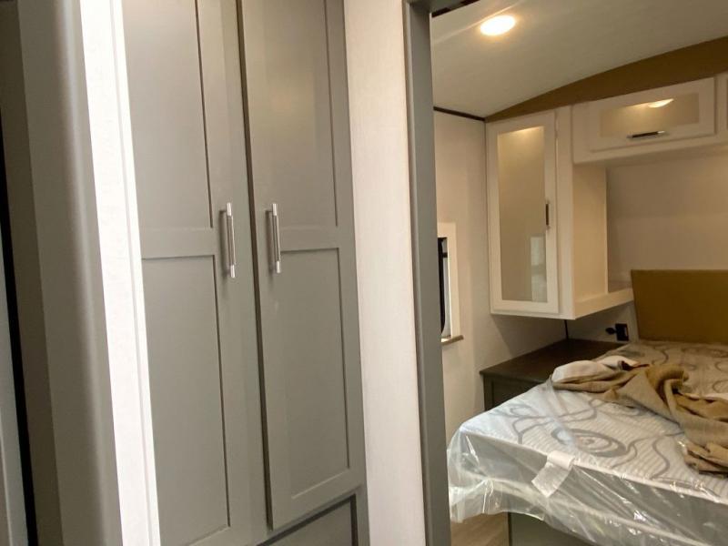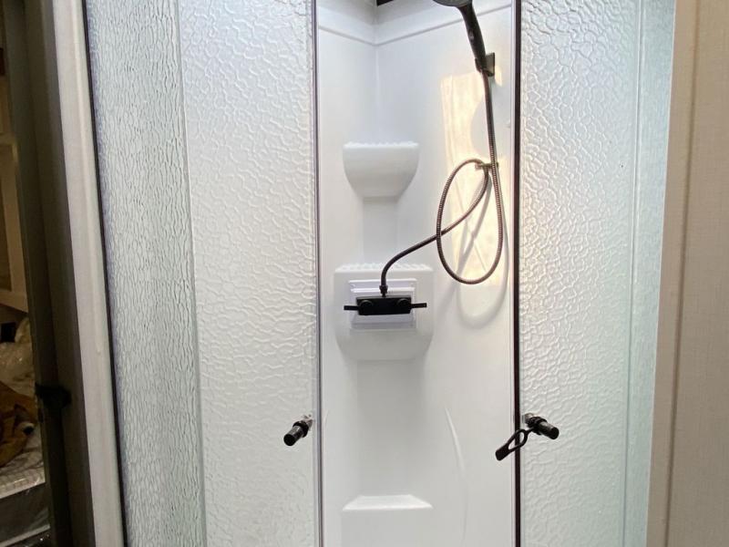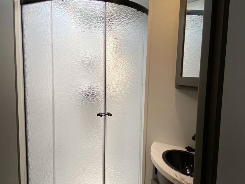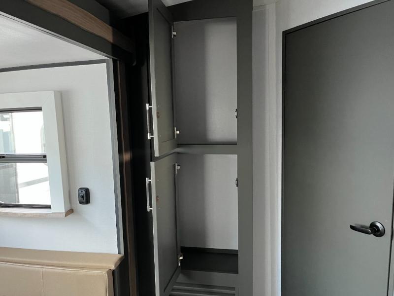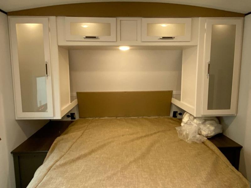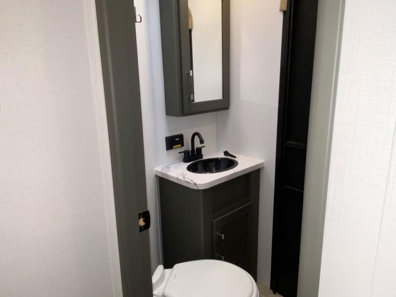 This travel trailer is one the whole gang will love! There is a rear private bunkhouse suite for your guests or the kids, plus a front master bedroom for you. The bunkhouse includes a tri-fold sofa with a flip-up bunk across from a second bunk, plus there is a half bath with its own exterior entry door! The full walk-through bath leads into the front bedroom where you'll find a queen bed and dual wardrobes to keep your room tidy. Dual opposing slides in the combined living area and kitchen will provide ample space to move about, and you will find comfy seating on the tri-fold sofa and Do-More dinette table. There is even a fireplace and an entertainment center!