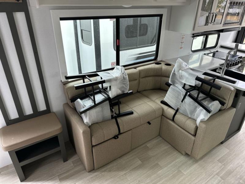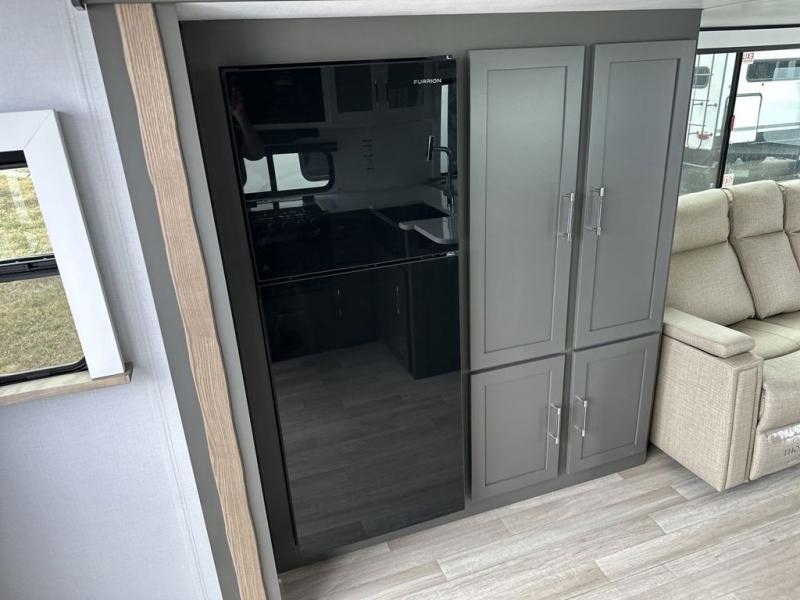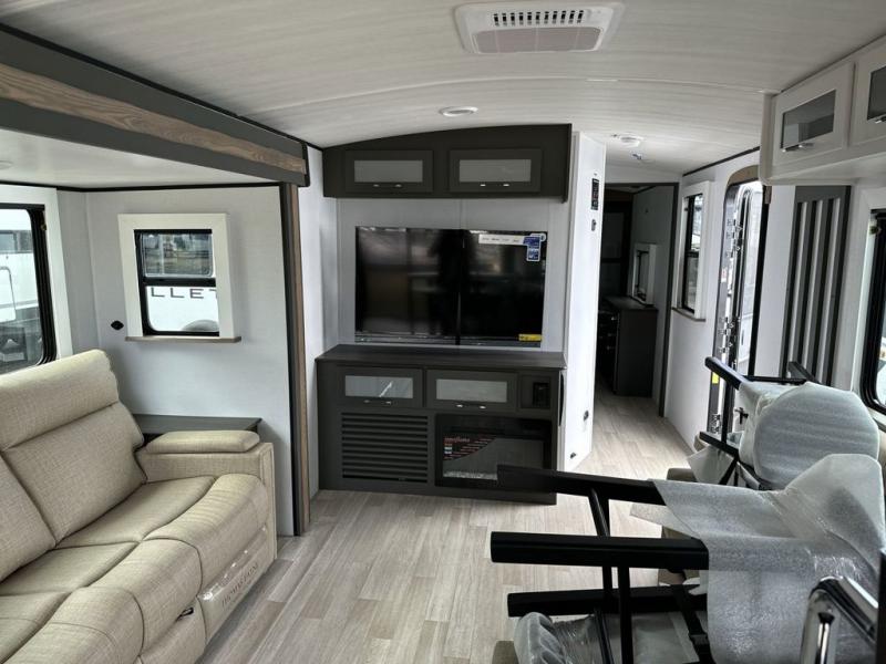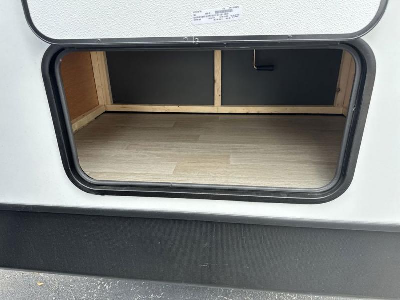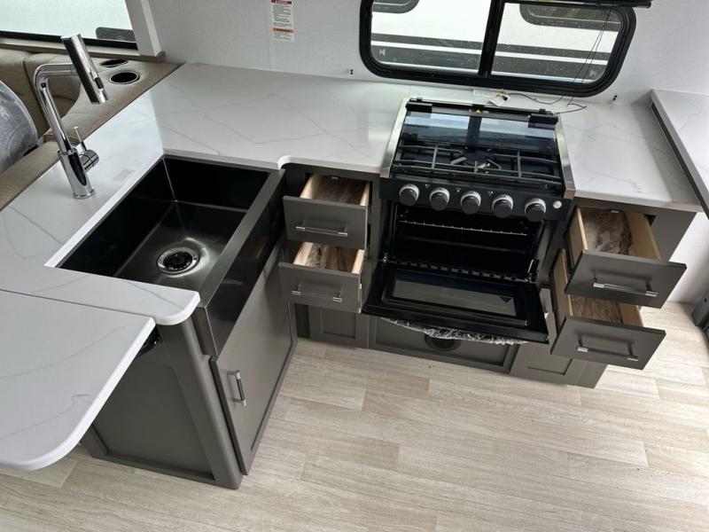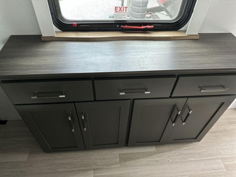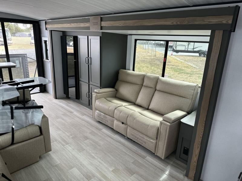 If you're looking for the perfect travel trailer to entertain guests, this is the one! The rear kitchen features a bartop with stools and a rear fold-down balcony where you can enjoy great outdoor views. The flip-up counter extension will provide the chef with more space to prep food, and there is a spacious refrigerator and pantry for food storage. Your crew can get comfy on the theater seating or L-shaped section sofa, and there is a 50" Smart TV and fireplace to make it a movie night! A full bath onboard lets you clean up after a day outdoors, and the front private bedroom with a king bed slide provides all the comfort you need. You'll also find two closets, washer and dryer prep, and a dresser with a flip-up top to keep your things neat and organized.