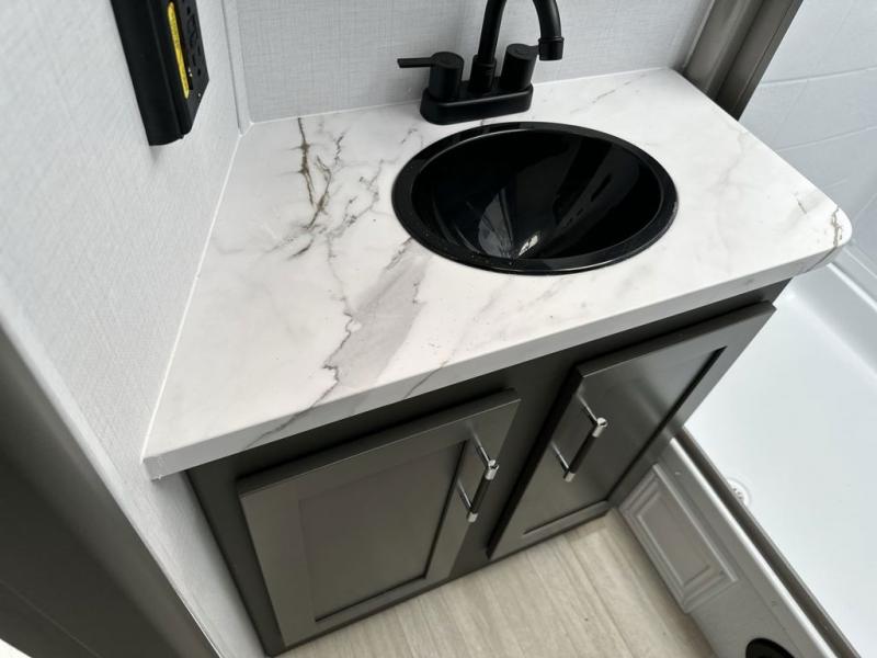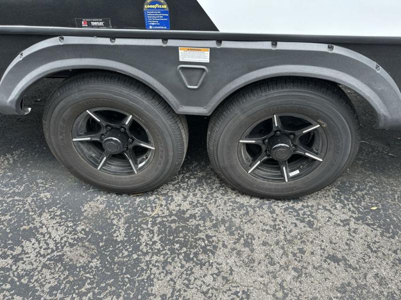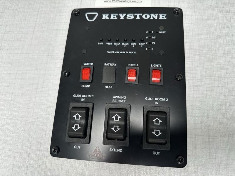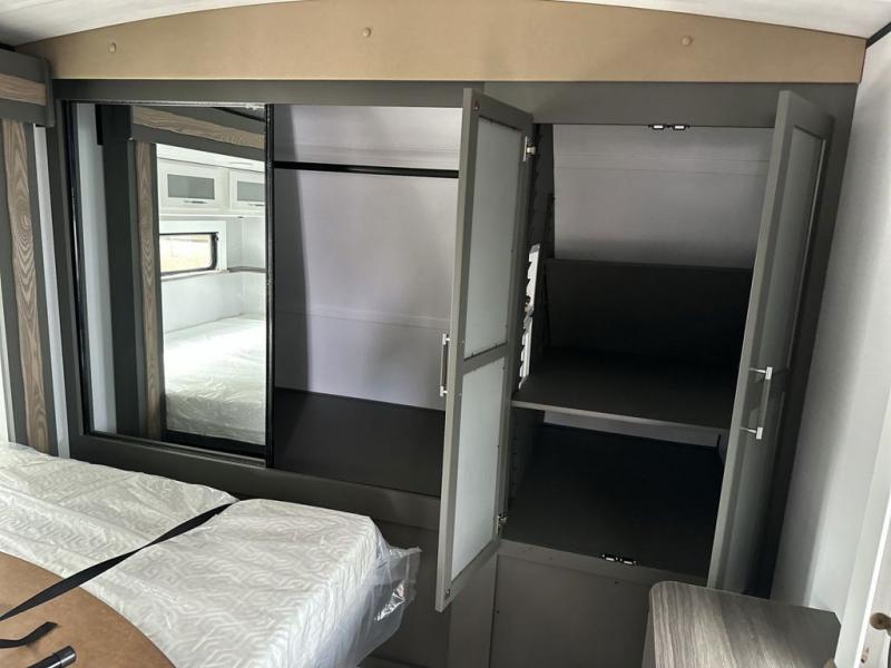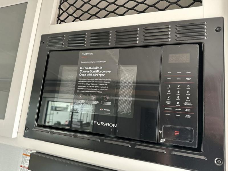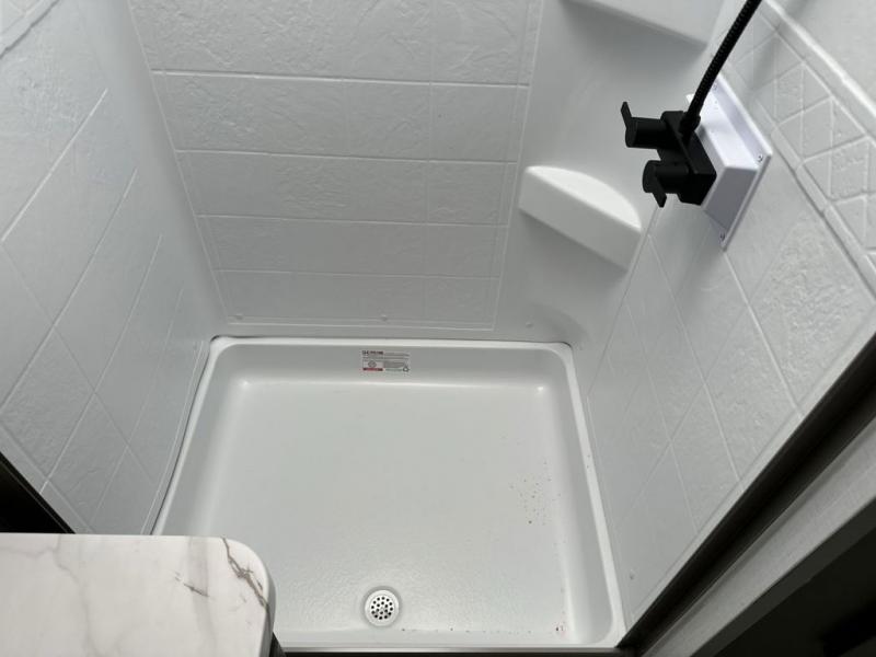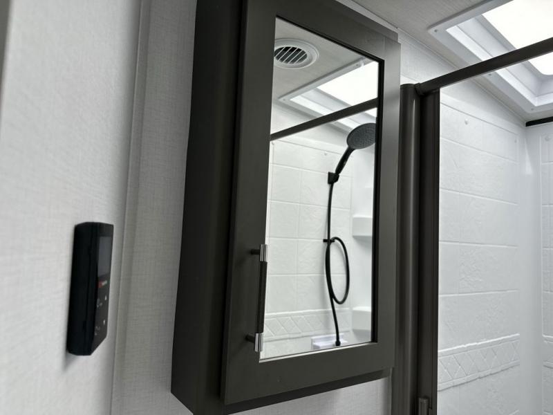 If you're looking for the perfect travel trailer to entertain guests, this is the one! The rear kitchen features a bartop with stools and a rear fold-down balcony where you can enjoy great outdoor views. The flip-up counter extension will provide the chef with more space to prep food, and there is a spacious refrigerator and pantry for food storage. Your crew can get comfy on the theater seating or L-shaped section sofa, and there is a 50" Smart TV and fireplace to make it a movie night! A full bath onboard lets you clean up after a day outdoors, and the front private bedroom with a king bed slide provides all the comfort you need. You'll also find two closets, washer and dryer prep, and a dresser with a flip-up top to keep your things neat and organized.