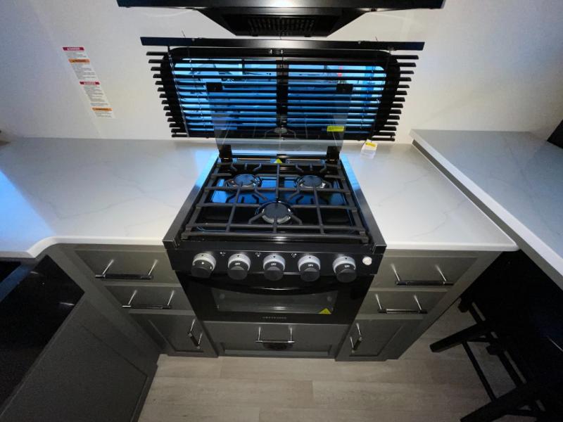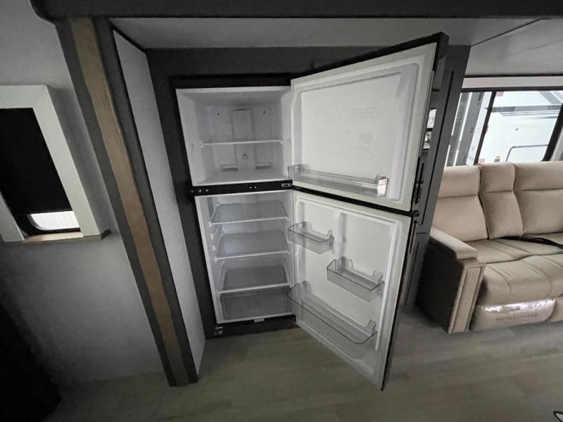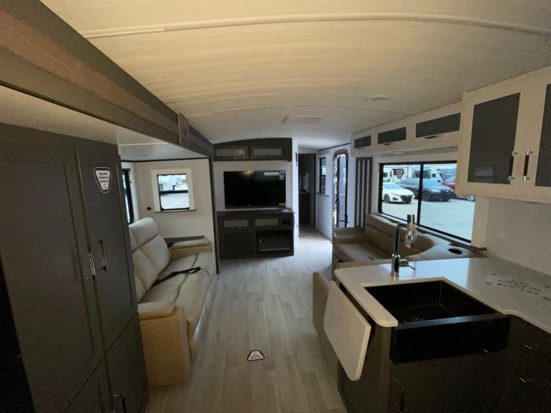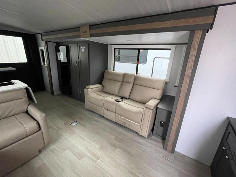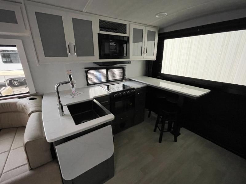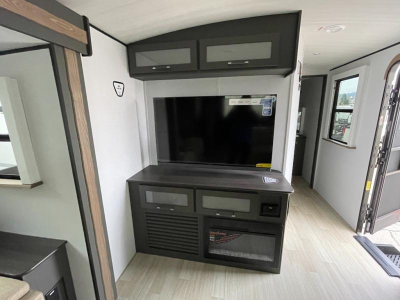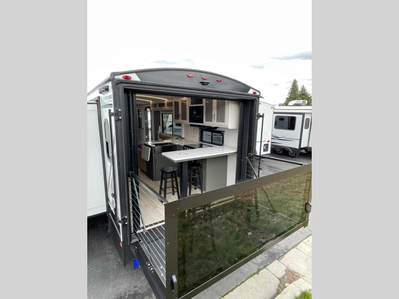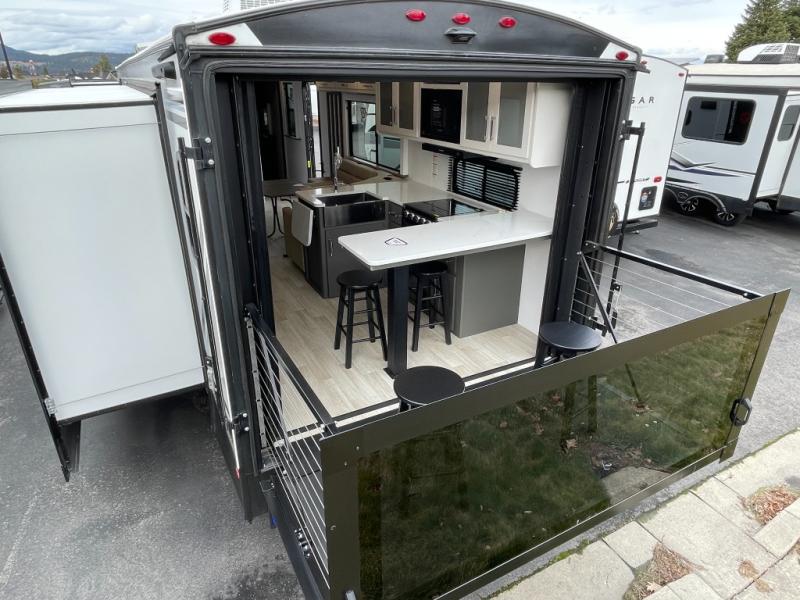 If you're looking for the perfect travel trailer to entertain guests, this is the one! The rear kitchen features a bartop with stools and a rear fold-down balcony where you can enjoy great outdoor views. The flip-up counter extension will provide the chef with more space to prep food, and there is a spacious refrigerator and pantry for food storage. Your crew can get comfy on the theater seating or L-shaped section sofa, and there is a 50" Smart TV and fireplace to make it a movie night! A full bath onboard lets you clean up after a day outdoors, and the front private bedroom with a king bed slide provides all the comfort you need. You'll also find two closets, washer and dryer prep, and a dresser with a flip-up top to keep your things neat and organized.