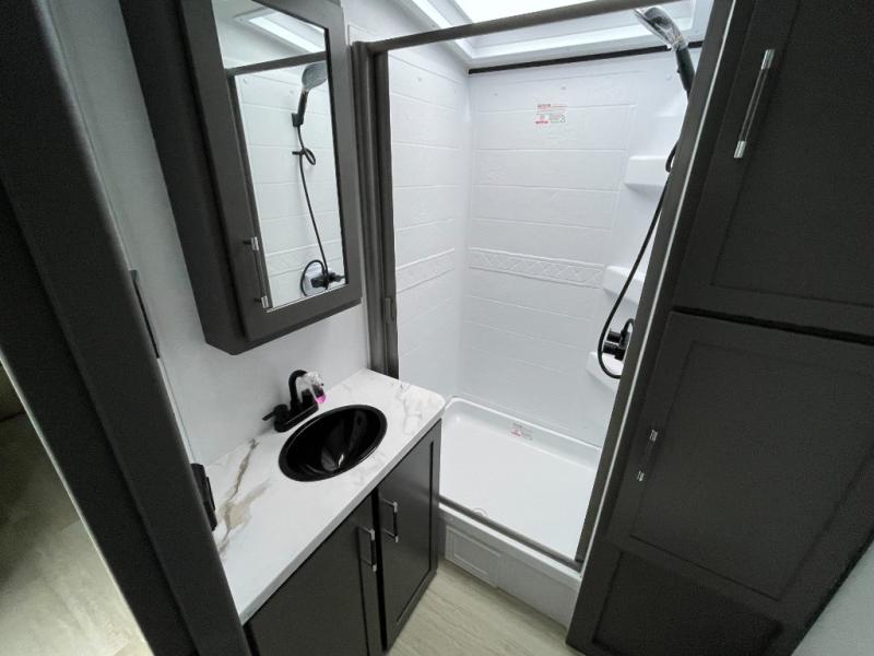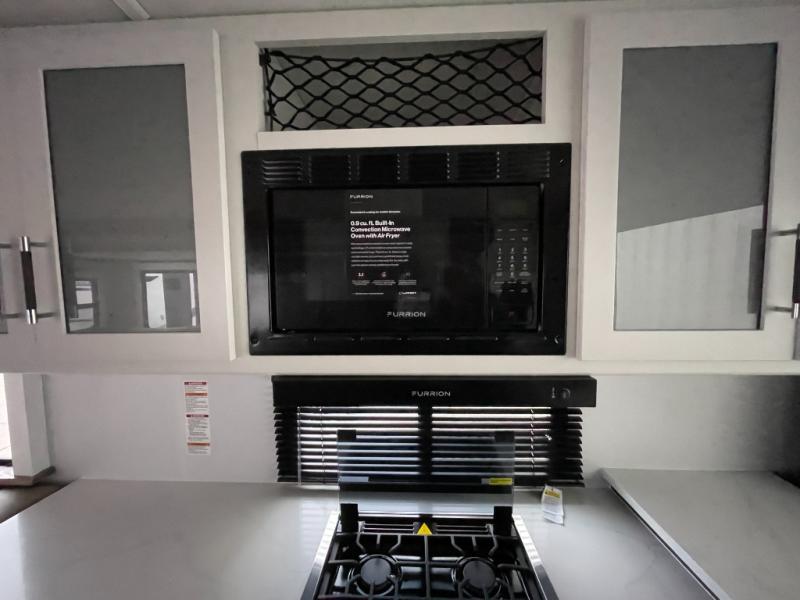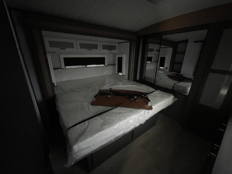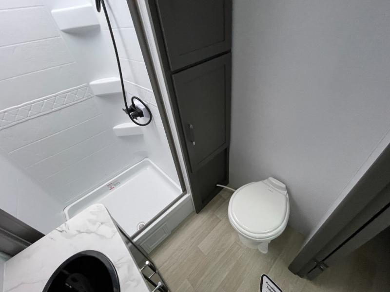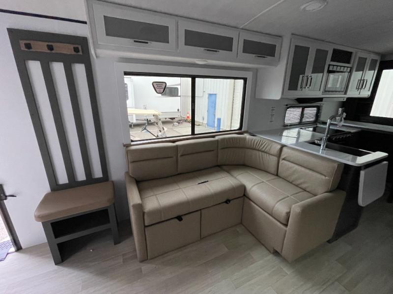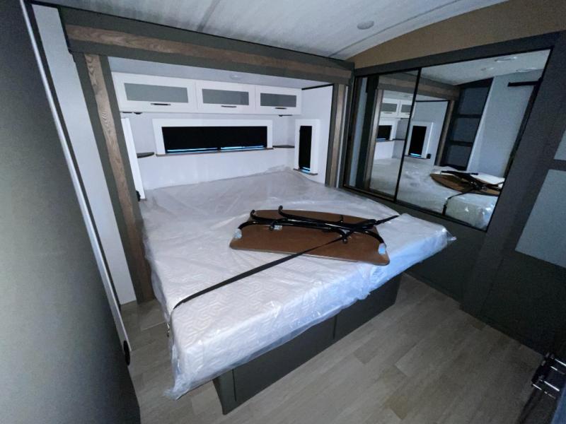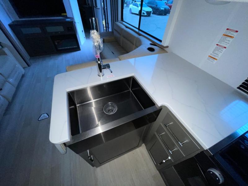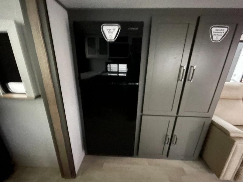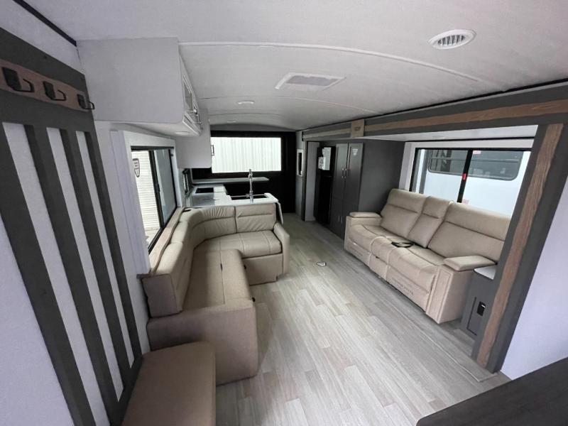If you're looking for the perfect travel trailer to entertain guests, this is the one! The rear kitchen features a bartop with stools and a rear fold-down balcony where you can enjoy great outdoor views. The flip-up counter extension will provide the chef with more space to prep food, and there is a spacious refrigerator and pantry for food storage. Your crew can get comfy on the theater seating or L-shaped section sofa, and there is a 50" Smart TV and fireplace to make it a movie night! A full bath onboard lets you clean up after a day outdoors, and the front private bedroom with a king bed slide provides all the comfort you need. You'll also find two closets, washer and dryer prep, and a dresser with a flip-up top to keep your things neat and organized.