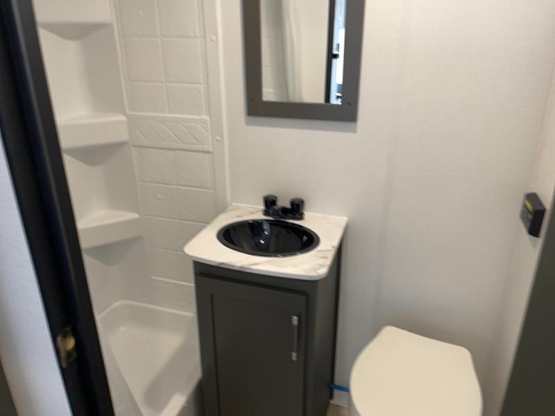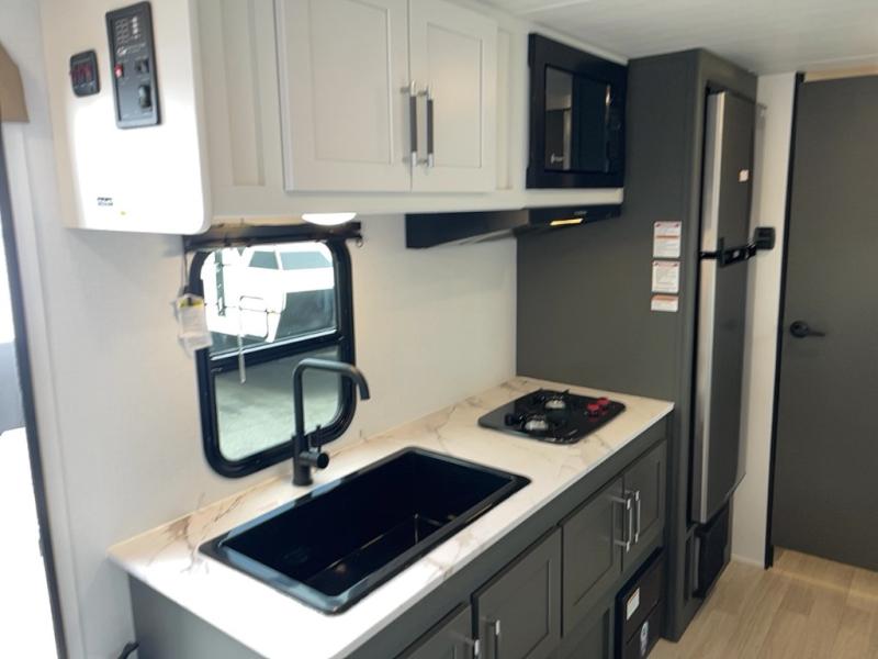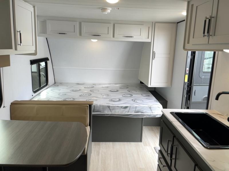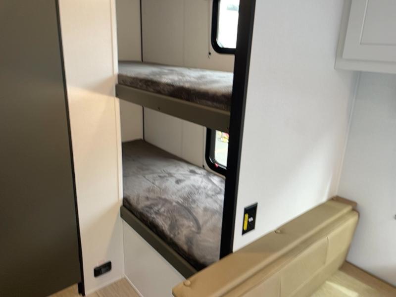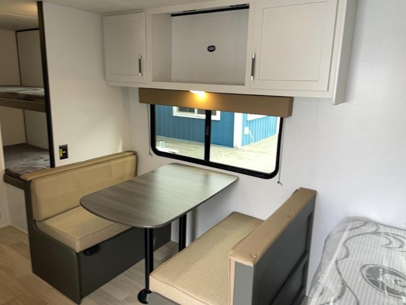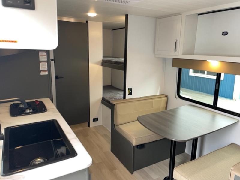 Trips to the Grand Canyon are made comfortable in this travel trailer for five. You will enjoy your own queen bed up front with a wardrobe for your clothes. The kids or your guests will love the bunk beds right next to the full bath, and there is also a booth dinette that can serve as both dining and sleeping space. Prepare all your meals in the microwave oven or use the cooktop, and the 8 cu. ft. refrigerator will be perfect for all your perishables.