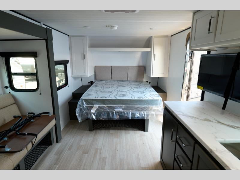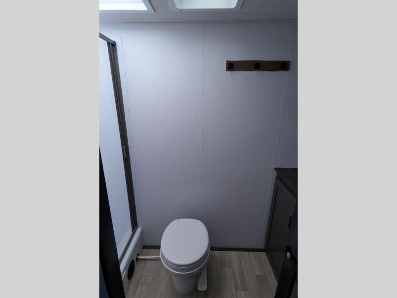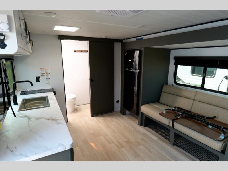 Designed for the modern adventurer, offering a stylish and functional space for couples and solo travelers, this travel trailer features a kitchen equipped with a refrigerator, a microwave for quick reheating and a two-burner cooktop for preparing delicious meals. Overhead cabinets provide ample storage for cookware and dishes. Further, the foldable table provides a convenient spot for meals and snacks, while the jackknife sofa offers a comfortable seating area that can be converted into a cozy sleeping space. The rear bathroom is thoughtfully designed and equipped with everything you need for a comfortable trip. And last but not least, the front bedroom boasts a plush queen-sized bed with spacious wardrobes on each side, providing plenty of storage for clothes and personal items.