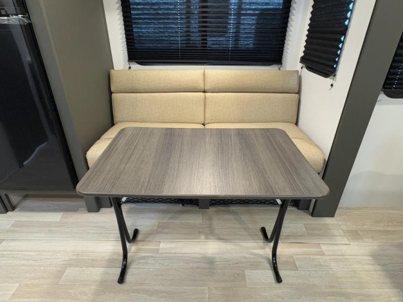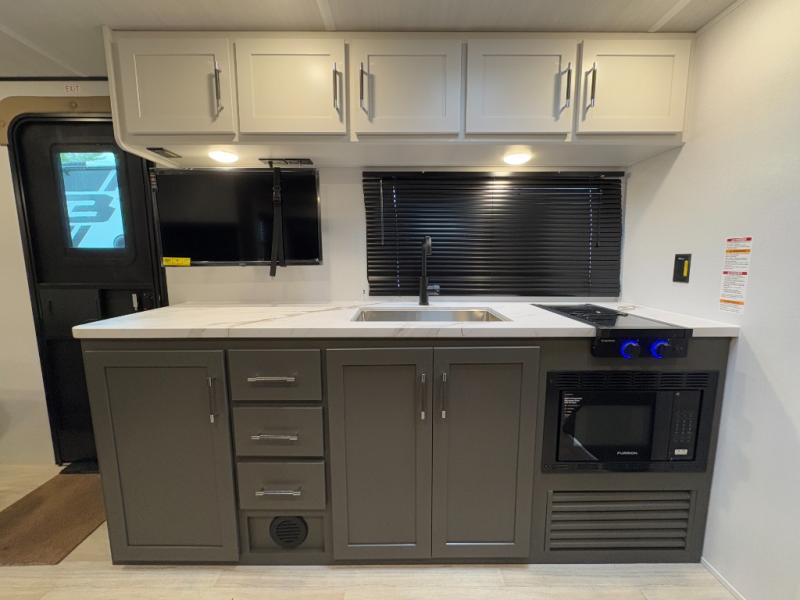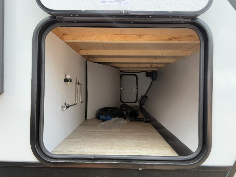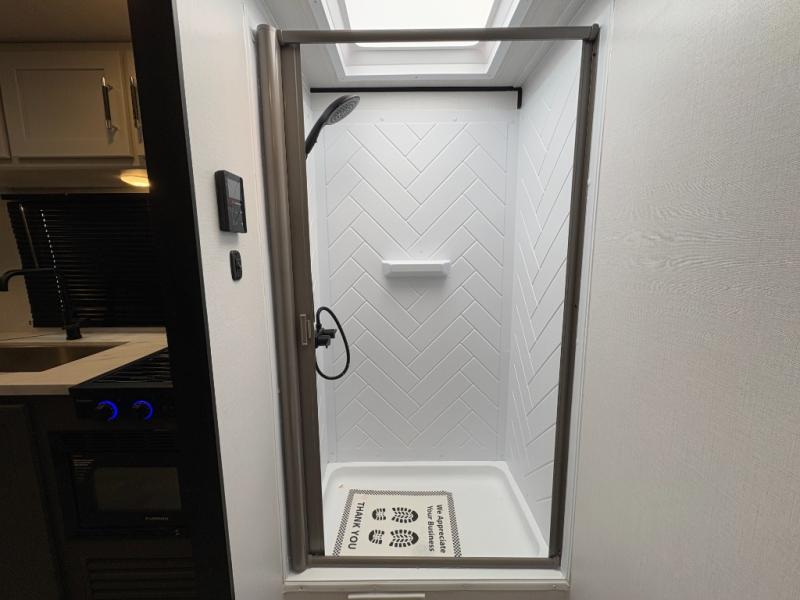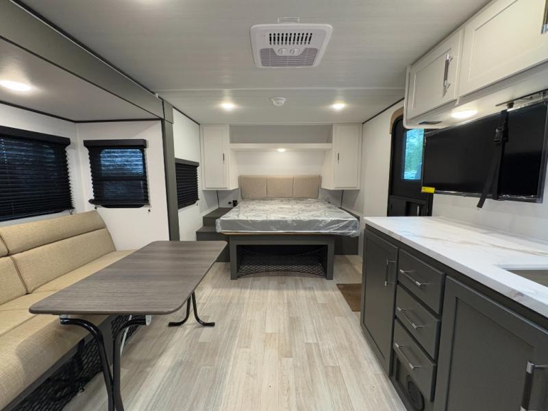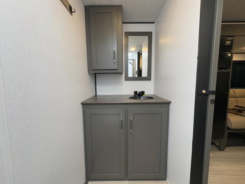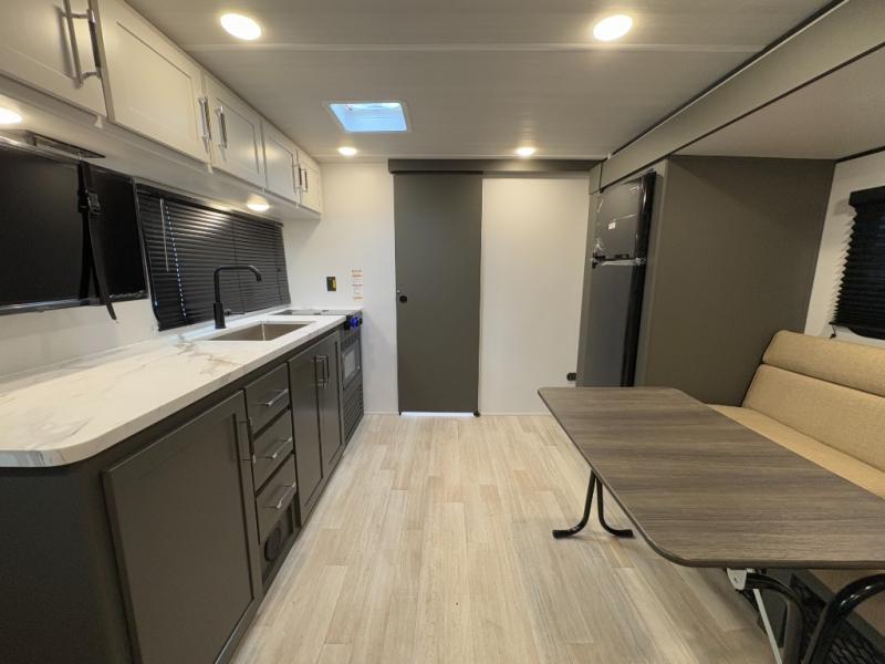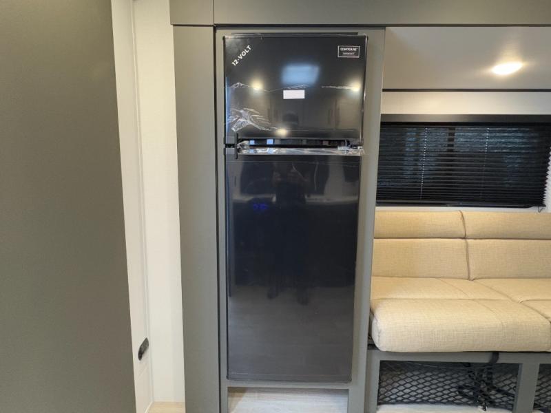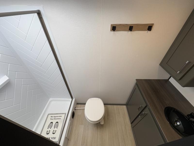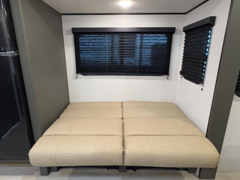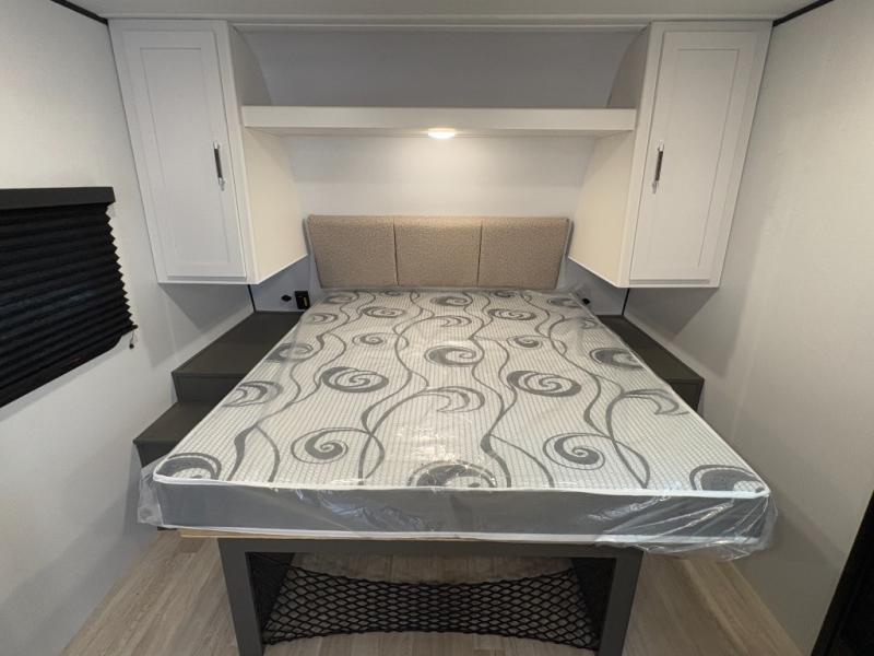 Designed for the modern adventurer, offering a stylish and functional space for couples and solo travelers, this travel trailer features a kitchen equipped with a refrigerator, a microwave for quick reheating and a two-burner cooktop for preparing delicious meals. Overhead cabinets provide ample storage for cookware and dishes. Further, the foldable table provides a convenient spot for meals and snacks, while the jackknife sofa offers a comfortable seating area that can be converted into a cozy sleeping space. The rear bathroom is thoughtfully designed and equipped with everything you need for a comfortable trip. And last but not least, the front bedroom boasts a plush queen-sized bed with spacious wardrobes on each side, providing plenty of storage for clothes and personal items.
