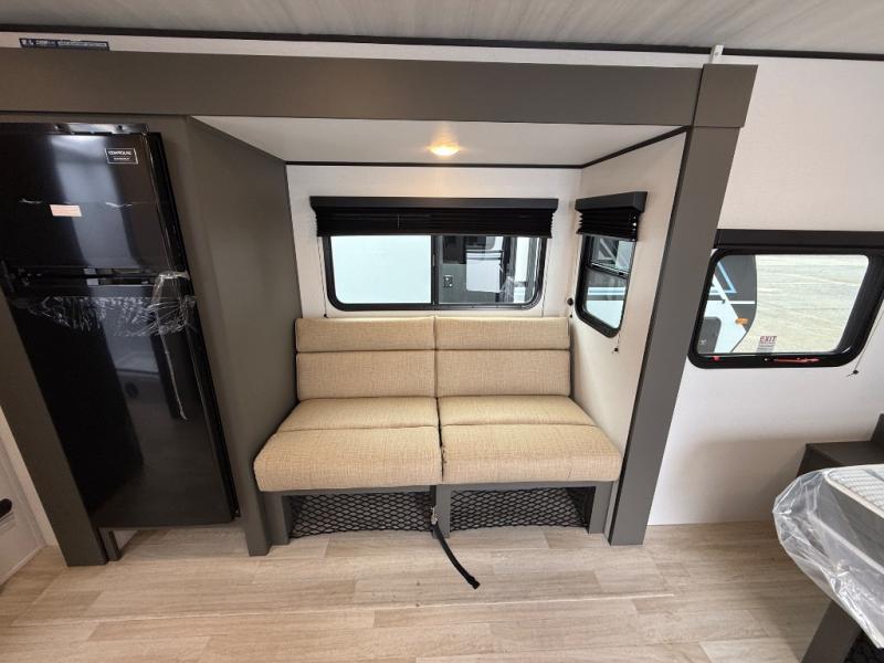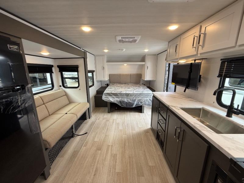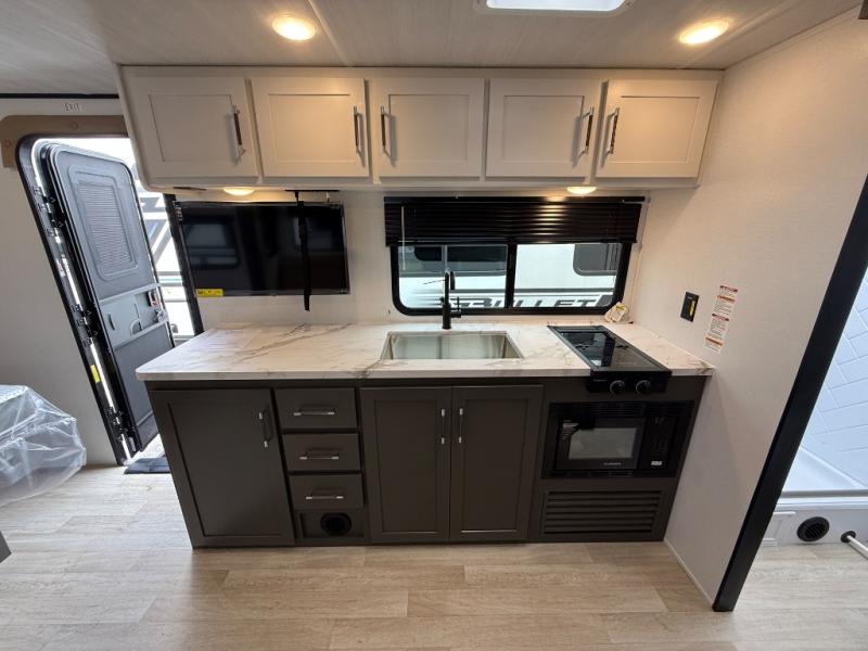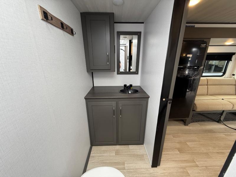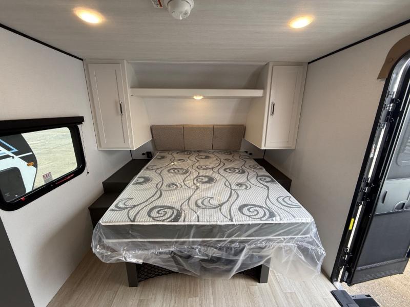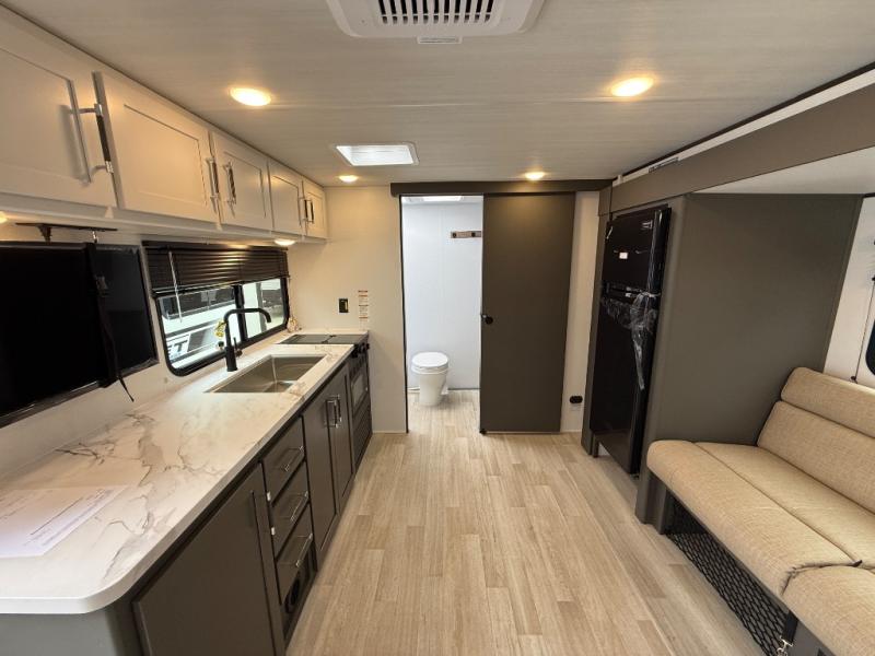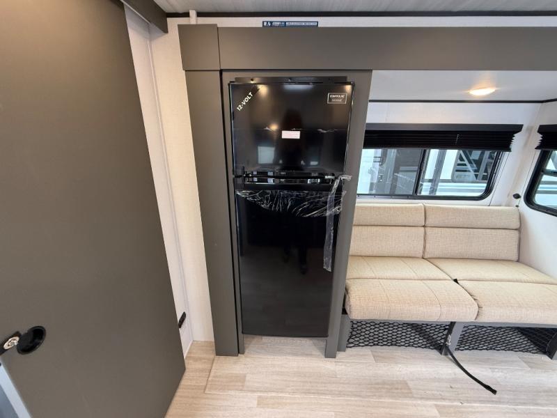 Designed for the modern adventurer, offering a stylish and functional space for couples and solo travelers, this travel trailer features a kitchen equipped with a refrigerator, a microwave for quick reheating and a two-burner cooktop for preparing delicious meals. Overhead cabinets provide ample storage for cookware and dishes. Further, the foldable table provides a convenient spot for meals and snacks, while the jackknife sofa offers a comfortable seating area that can be converted into a cozy sleeping space. The rear bathroom is thoughtfully designed and equipped with everything you need for a comfortable trip. And last but not least, the front bedroom boasts a plush queen-sized bed with spacious wardrobes on each side, providing plenty of storage for clothes and personal items.