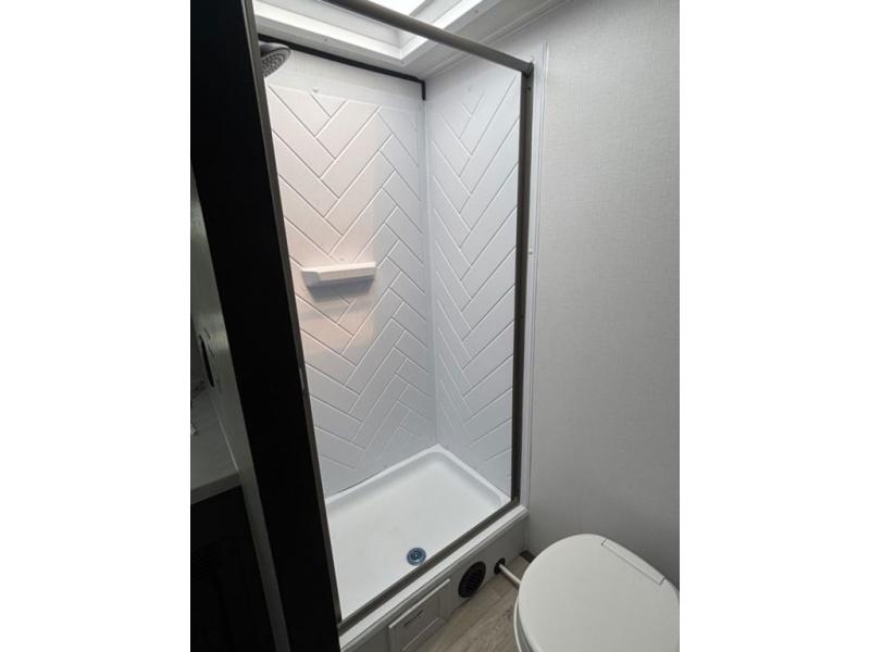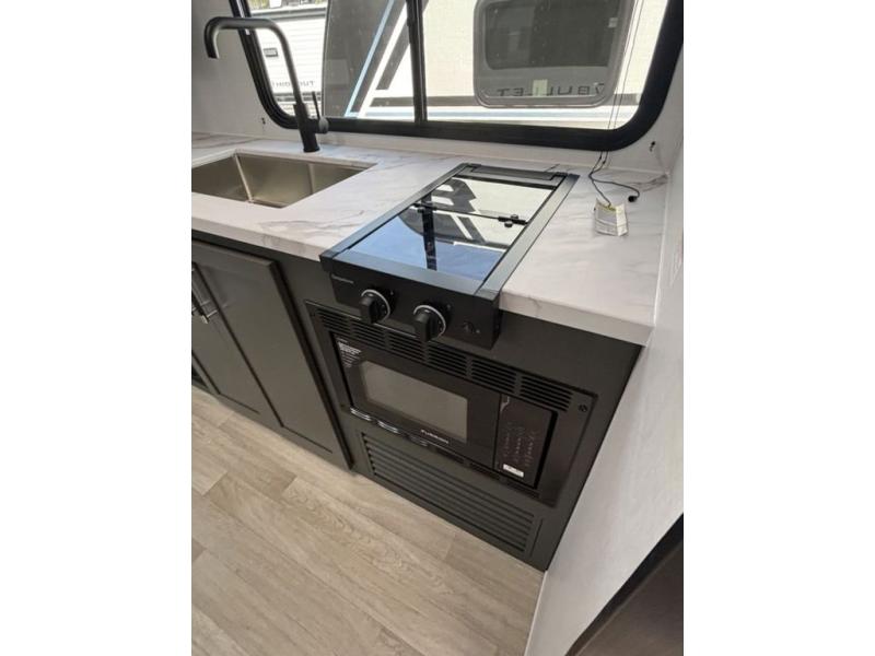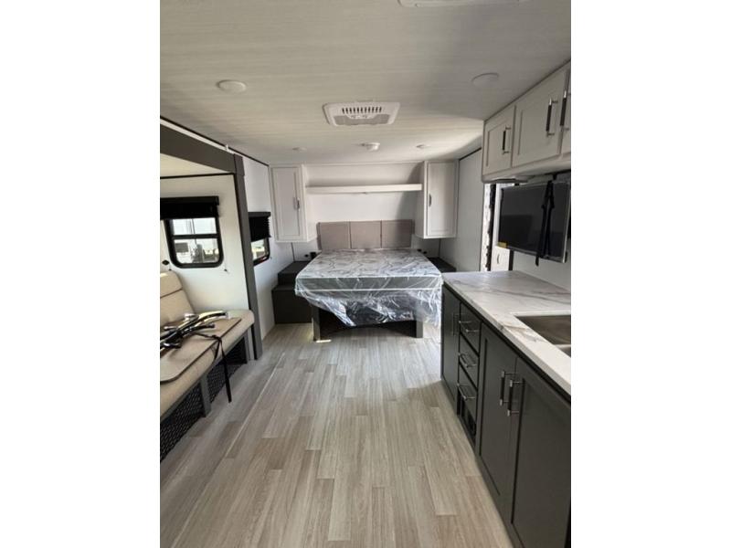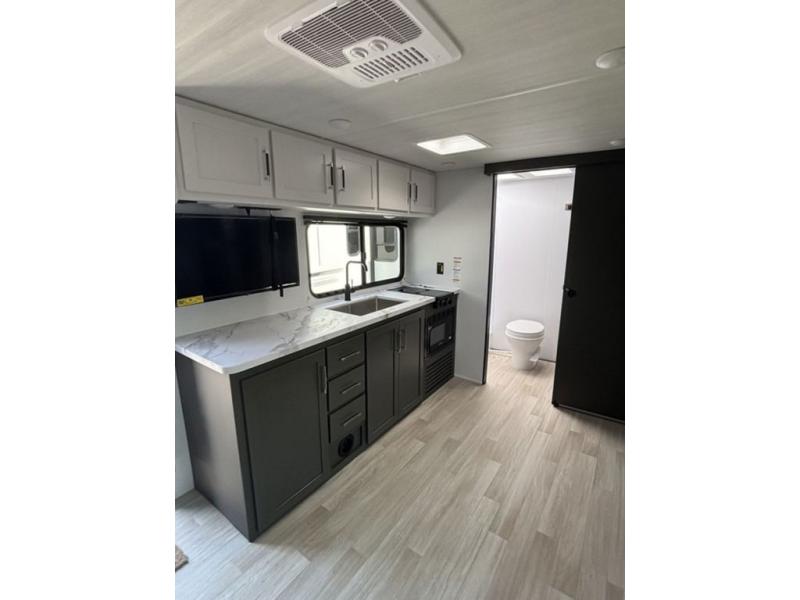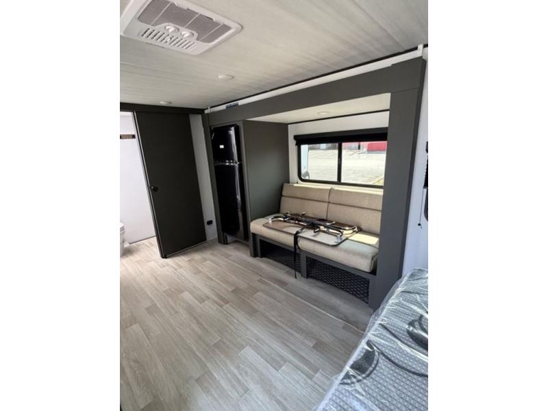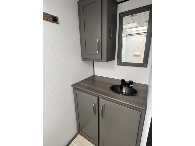 Designed for the modern adventurer, offering a stylish and functional space for couples and solo travelers, this travel trailer features a kitchen equipped with a refrigerator, a microwave for quick reheating and a two-burner cooktop for preparing delicious meals. Overhead cabinets provide ample storage for cookware and dishes. Further, the foldable table provides a convenient spot for meals and snacks, while the jackknife sofa offers a comfortable seating area that can be converted into a cozy sleeping space. The rear bathroom is thoughtfully designed and equipped with everything you need for a comfortable trip. And last but not least, the front bedroom boasts a plush queen-sized bed with spacious wardrobes on each side, providing plenty of storage for clothes and personal items.
