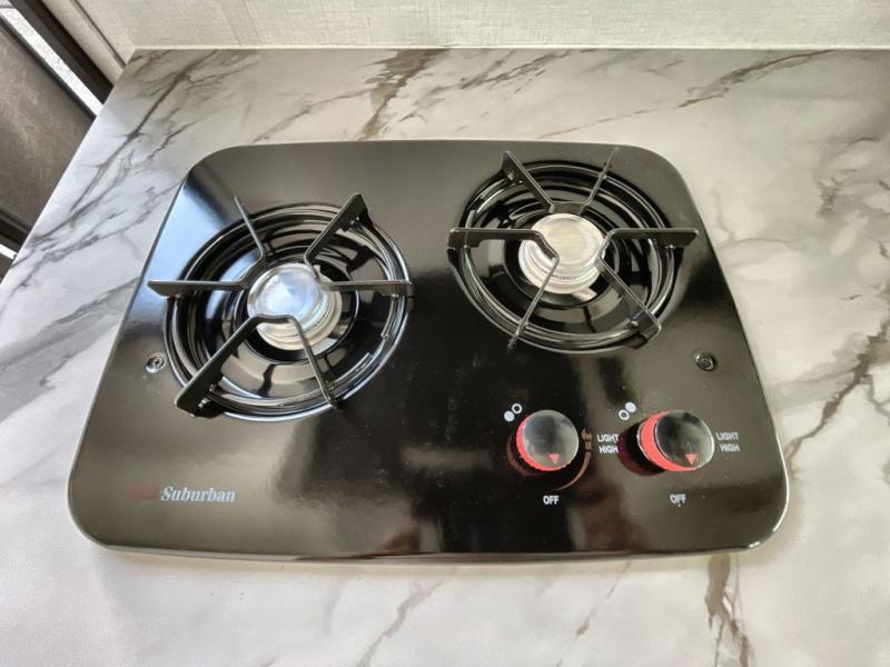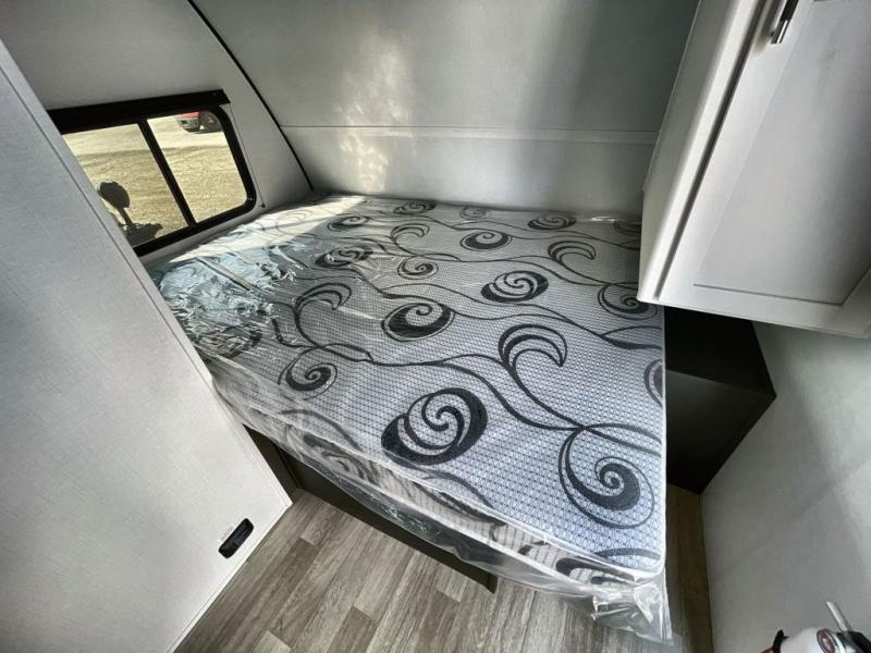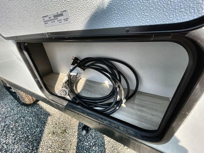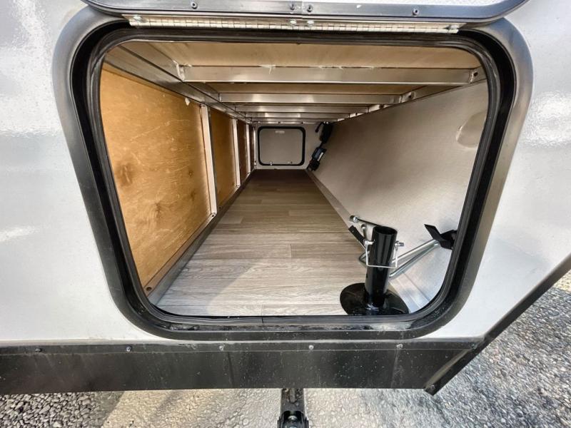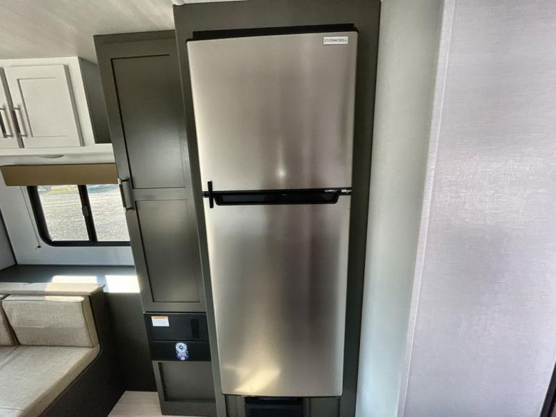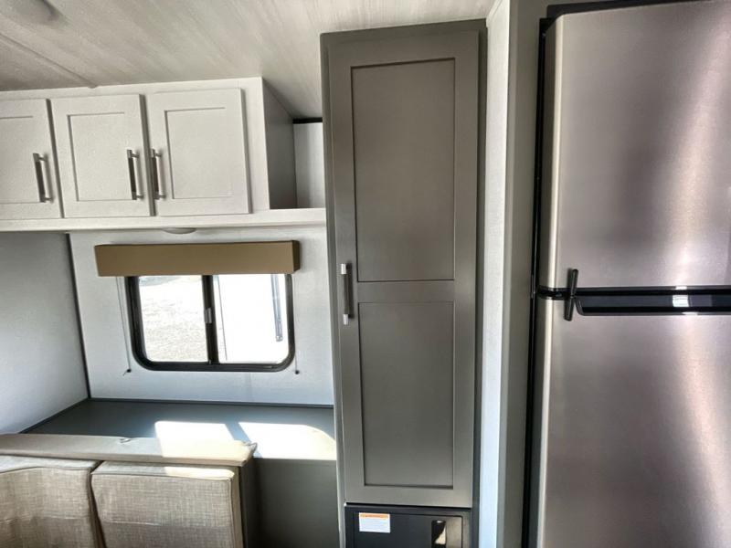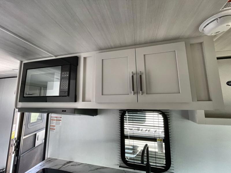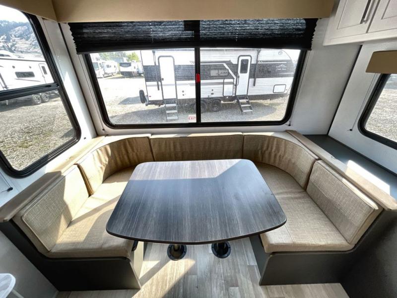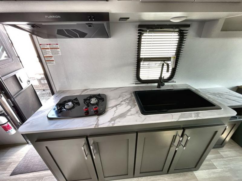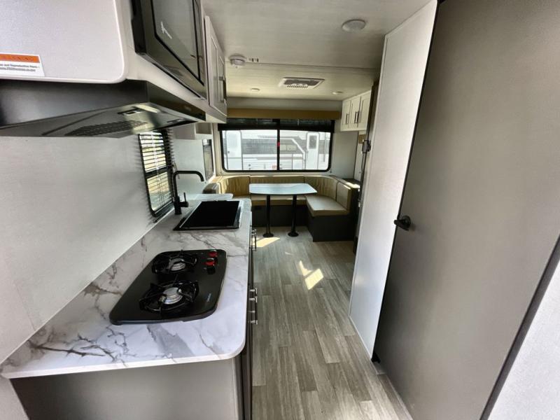 Simple and lightweight, this travel trailer is the unit you've been searching for! Once you arrive at your destination, unload the pass-thru storage, then head inside to start lunch in the full kitchen. Here, you'll find a cooktop and microwave to cook meals on and an 8 cu. ft. refrigerator for perishables. The rear U-shaped dinette can serve as dining and sleeping space for your guests, while you take the front corner queen bed. Don't let this travel trailer slip away!