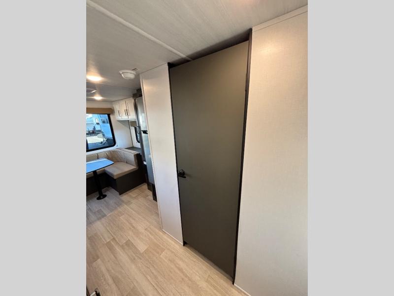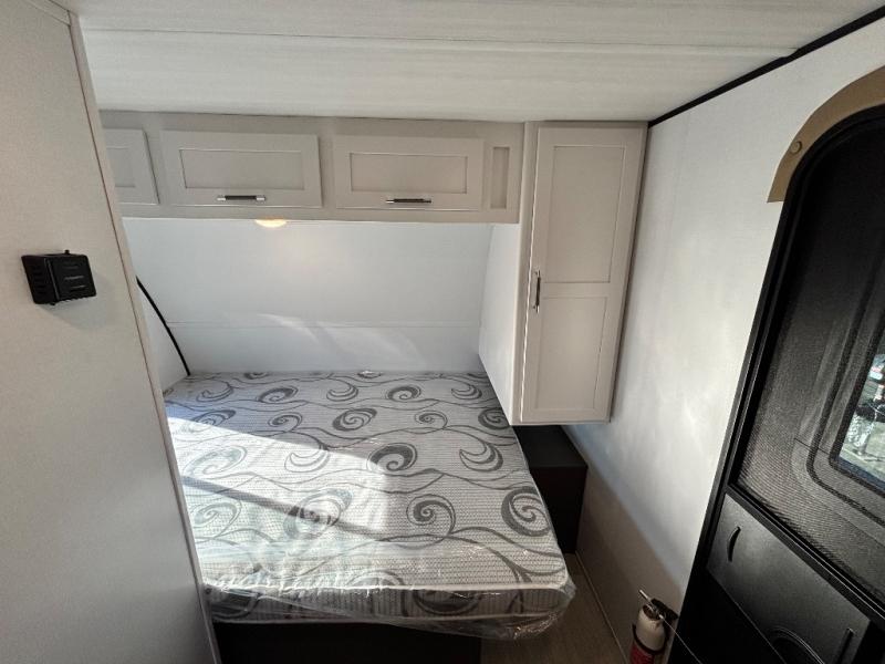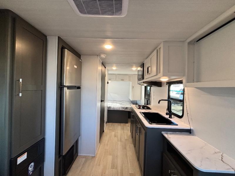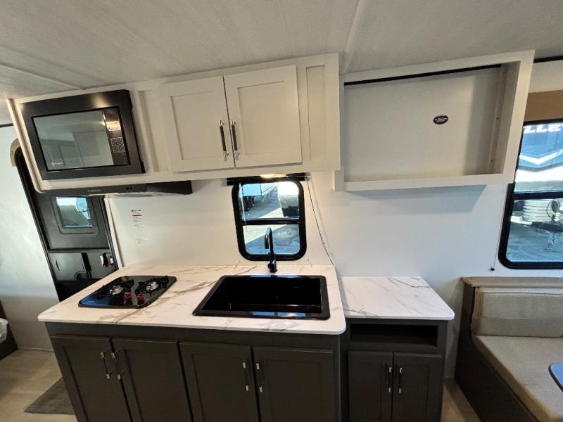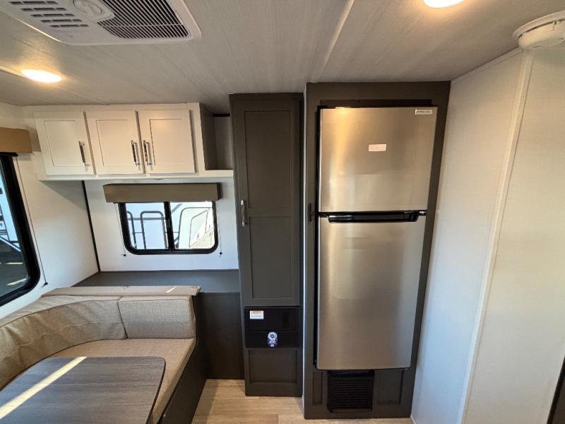 Simple and lightweight, this travel trailer is the unit you've been searching for! Once you arrive at your destination, unload the pass-thru storage, then head inside to start lunch in the full kitchen. Here, you'll find a cooktop and microwave to cook meals on and an 8 cu. ft. refrigerator for perishables. The rear U-shaped dinette can serve as dining and sleeping space for your guests, while you take the front corner queen bed. Don't let this travel trailer slip away!