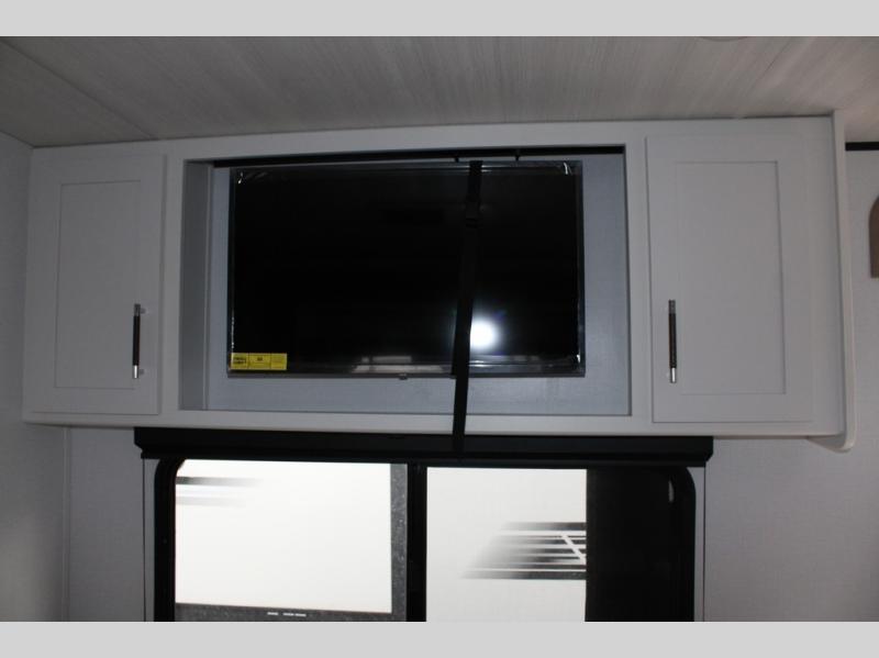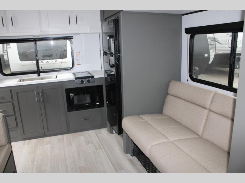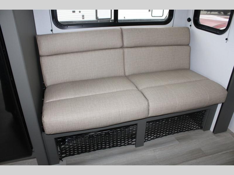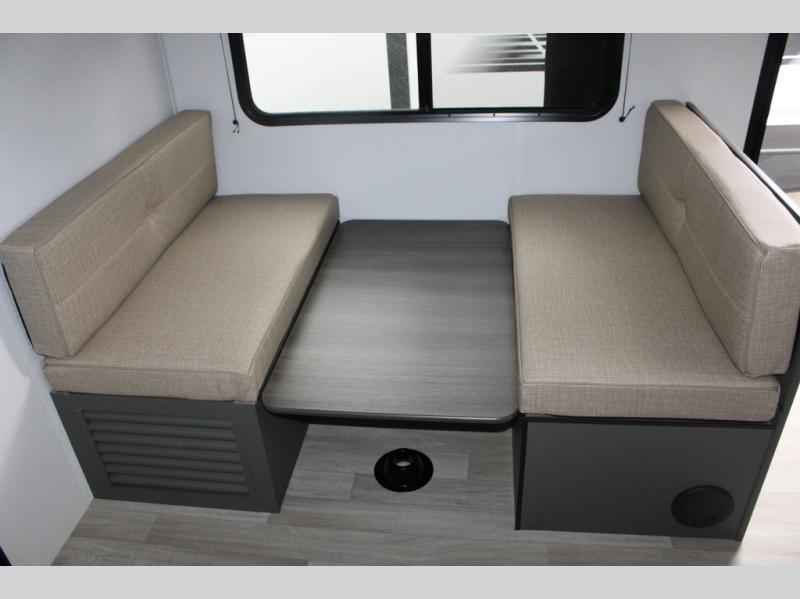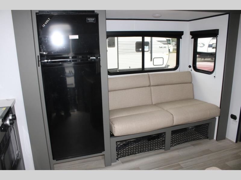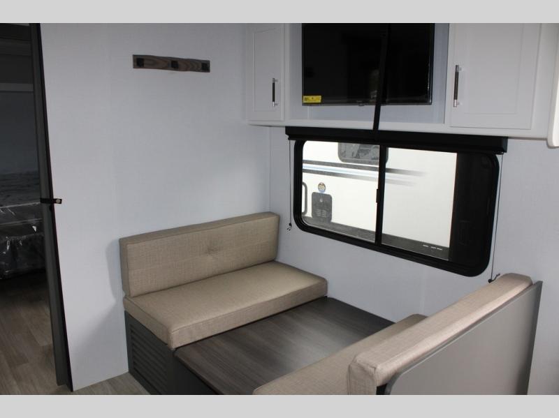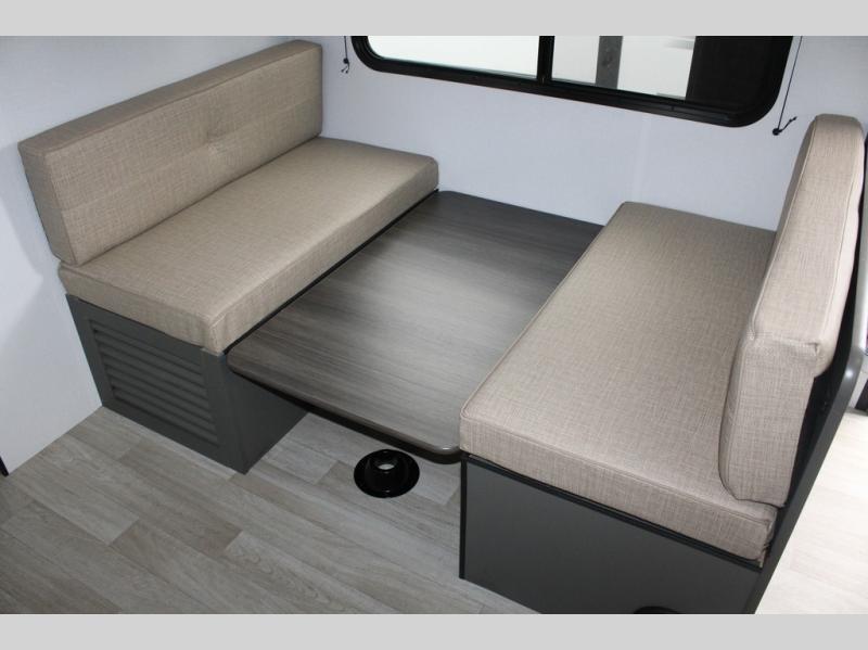 Perfect for road trips or camping excursions, this travel trailer is the safest bet! The rear kitchen is a highlight of the trailer, featuring a two-burner cooktop for preparing meals and a 12V refrigerator for keeping drinks and snacks fresh. Ample counter space and storage make meal prep a breeze. The booth dinette provides a cozy spot for meals and snacks, while the jackknife sofa offers a comfortable seating area that can be converted into a sleeping space. Enjoy your favorite shows on TV. In the heart of this RV, the walk-through bathroom is conveniently located and equipped with everything you need for a comfortable stay. And after a long day of adventures, sleep in the plush queen-sized bed and store all your personal items in the wardrobes and nightstands provided.