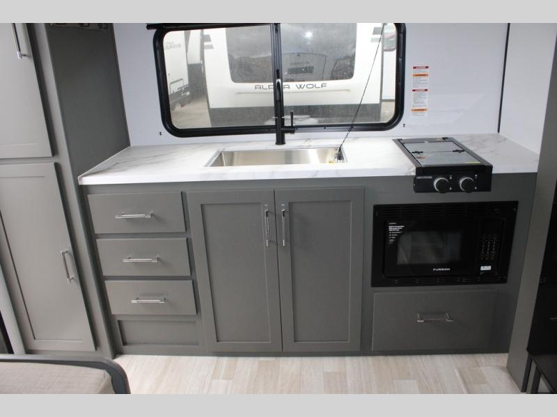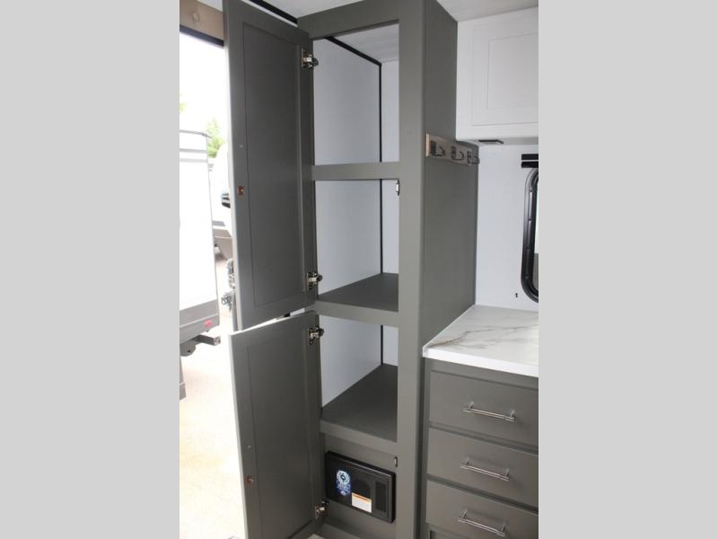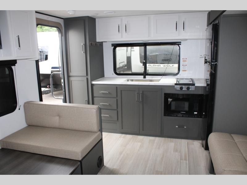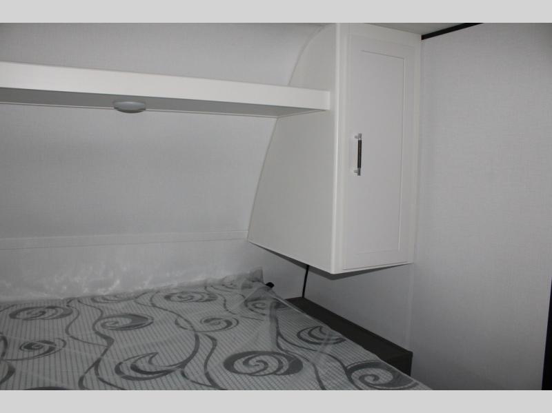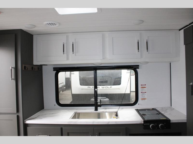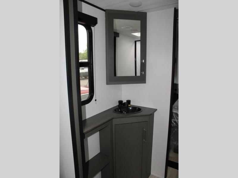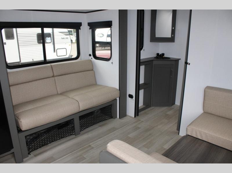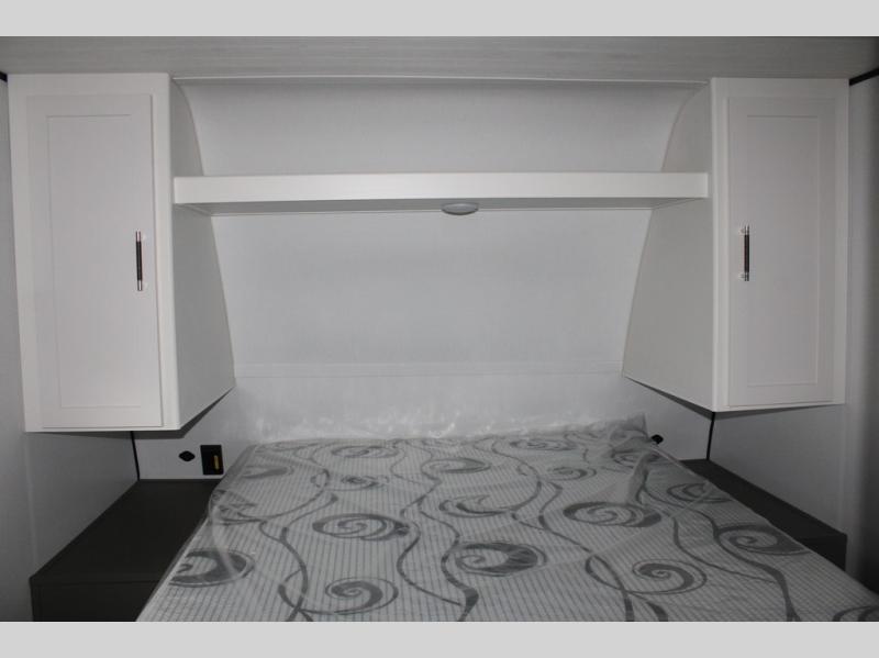 Perfect for road trips or camping excursions, this travel trailer is the safest bet! The rear kitchen is a highlight of the trailer, featuring a two-burner cooktop for preparing meals and a 12V refrigerator for keeping drinks and snacks fresh. Ample counter space and storage make meal prep a breeze. The booth dinette provides a cozy spot for meals and snacks, while the jackknife sofa offers a comfortable seating area that can be converted into a sleeping space. Enjoy your favorite shows on TV. In the heart of this RV, the walk-through bathroom is conveniently located and equipped with everything you need for a comfortable stay. And after a long day of adventures, sleep in the plush queen-sized bed and store all your personal items in the wardrobes and nightstands provided.