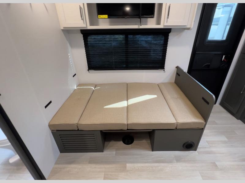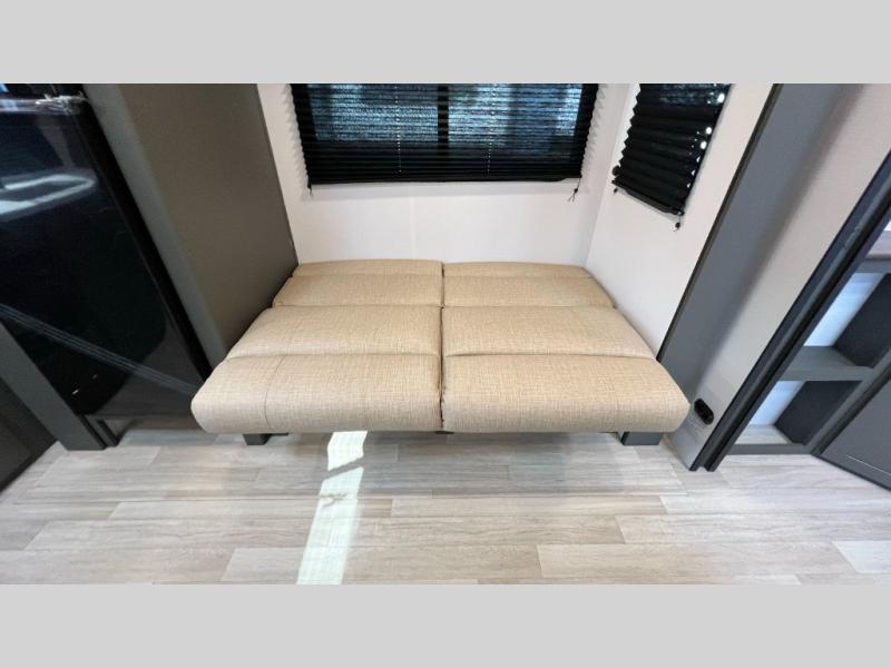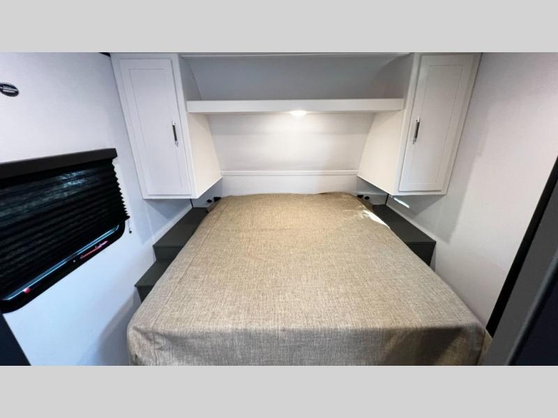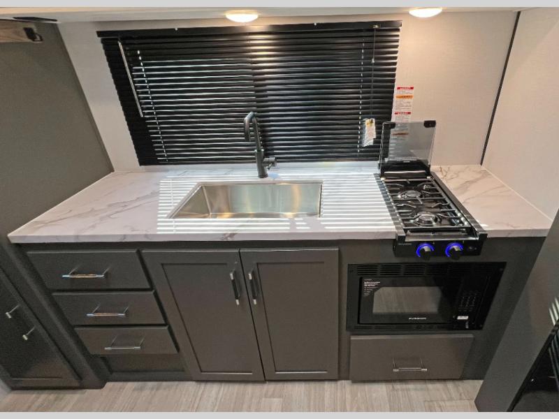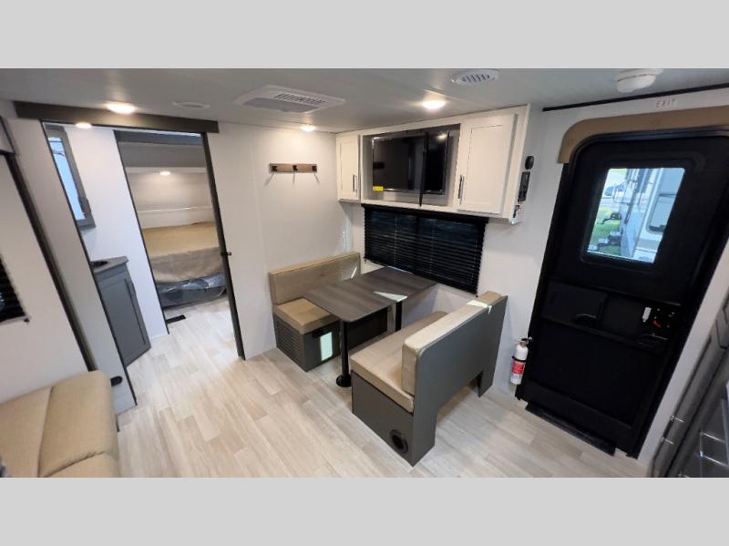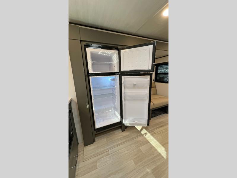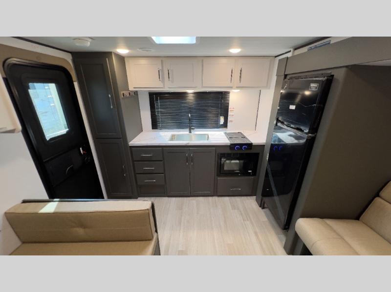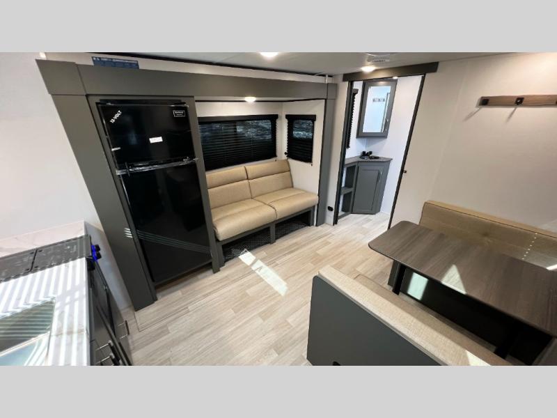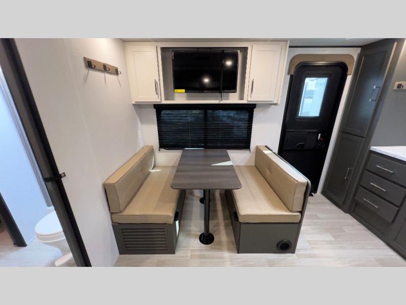 Perfect for road trips or camping excursions, this travel trailer is the safest bet! The rear kitchen is a highlight of the trailer, featuring a two-burner cooktop for preparing meals and a 12V refrigerator for keeping drinks and snacks fresh. Ample counter space and storage make meal prep a breeze. The booth dinette provides a cozy spot for meals and snacks, while the jackknife sofa offers a comfortable seating area that can be converted into a sleeping space. Enjoy your favorite shows on TV. In the heart of this RV, the walk-through bathroom is conveniently located and equipped with everything you need for a comfortable stay. And after a long day of adventures, sleep in the plush queen-sized bed and store all your personal items in the wardrobes and nightstands provided.