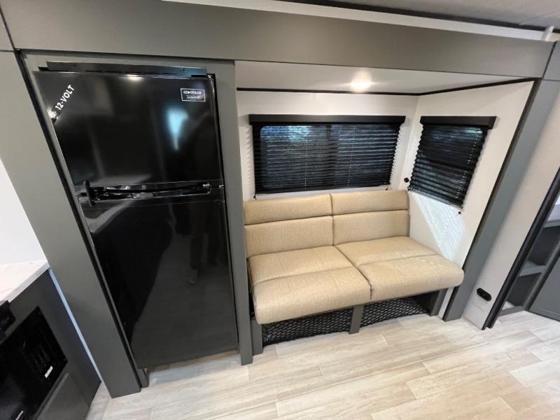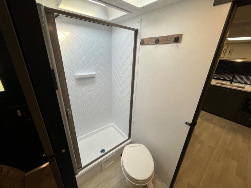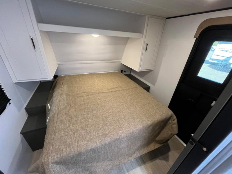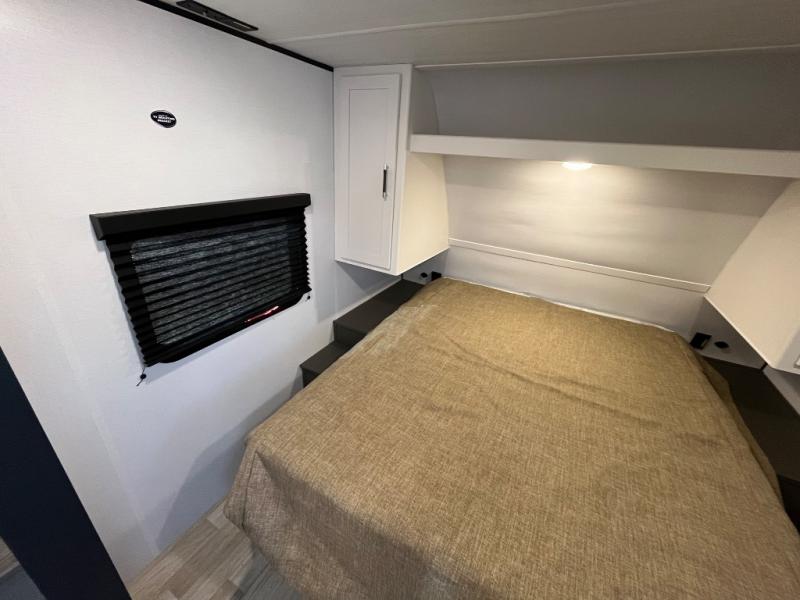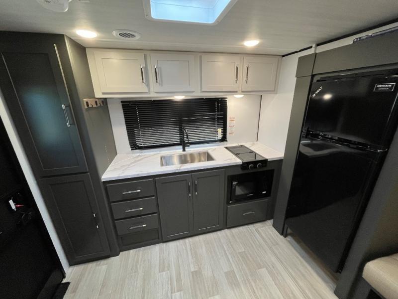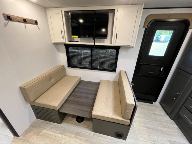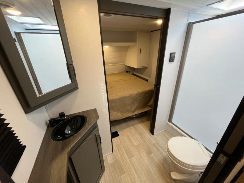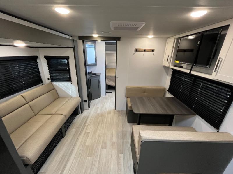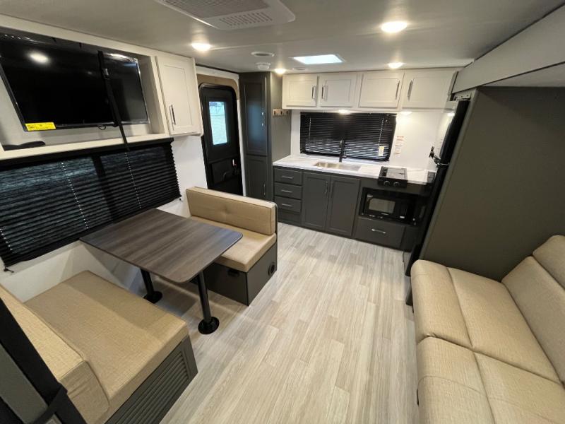 Perfect for road trips or camping excursions, this travel trailer is the safest bet! The rear kitchen is a highlight of the trailer, featuring a two-burner cooktop for preparing meals and a 12V refrigerator for keeping drinks and snacks fresh. Ample counter space and storage make meal prep a breeze. The booth dinette provides a cozy spot for meals and snacks, while the jackknife sofa offers a comfortable seating area that can be converted into a sleeping space. Enjoy your favorite shows on TV. In the heart of this RV, the walk-through bathroom is conveniently located and equipped with everything you need for a comfortable stay. And after a long day of adventures, sleep in the plush queen-sized bed and store all your personal items in the wardrobes and nightstands provided.