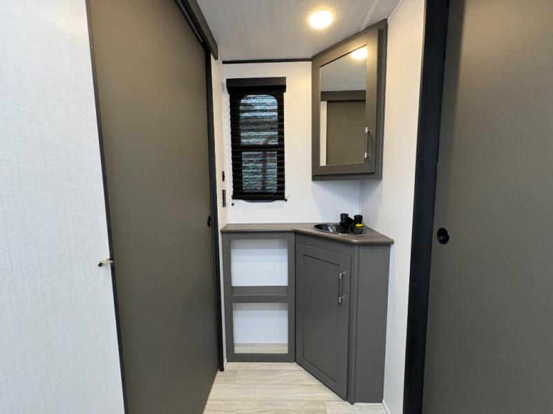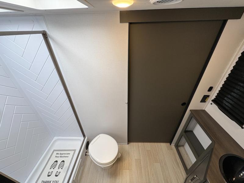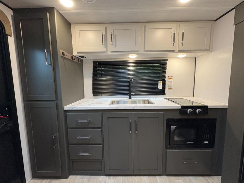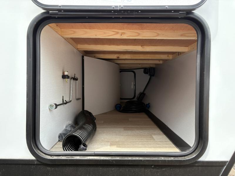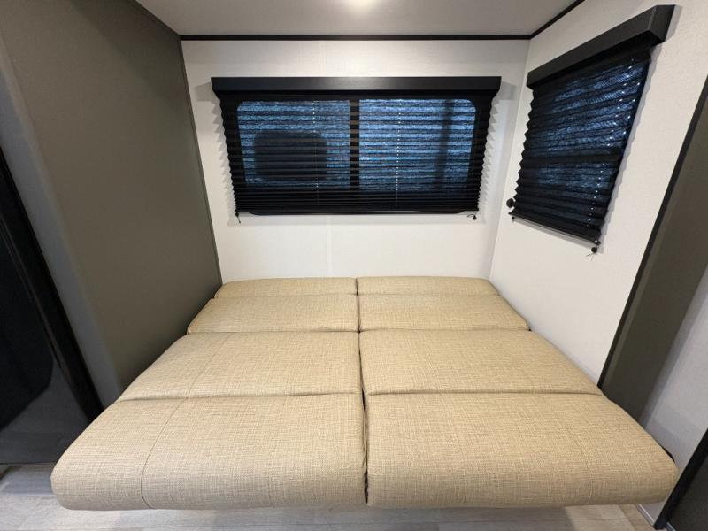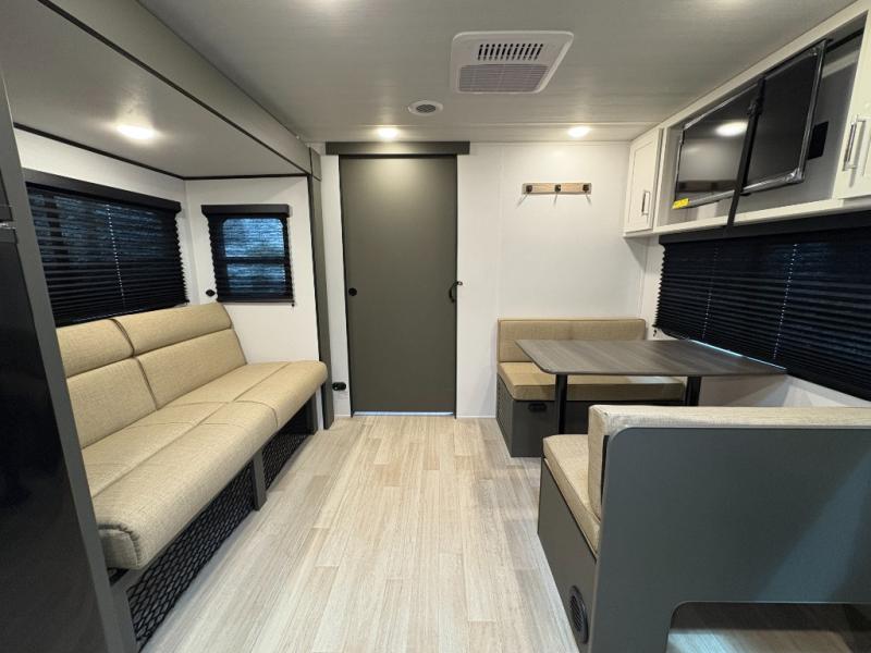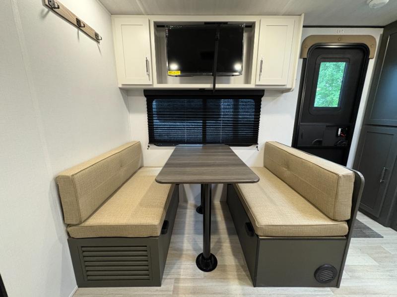 Perfect for road trips or camping excursions, this travel trailer is the safest bet! The rear kitchen is a highlight of the trailer, featuring a two-burner cooktop for preparing meals and a 12V refrigerator for keeping drinks and snacks fresh. Ample counter space and storage make meal prep a breeze. The booth dinette provides a cozy spot for meals and snacks, while the jackknife sofa offers a comfortable seating area that can be converted into a sleeping space. Enjoy your favorite shows on TV. In the heart of this RV, the walk-through bathroom is conveniently located and equipped with everything you need for a comfortable stay. And after a long day of adventures, sleep in the plush queen-sized bed and store all your personal items in the wardrobes and nightstands provided.