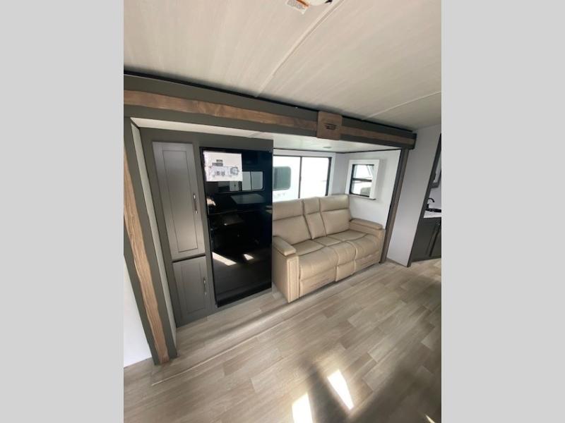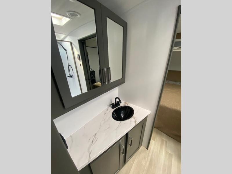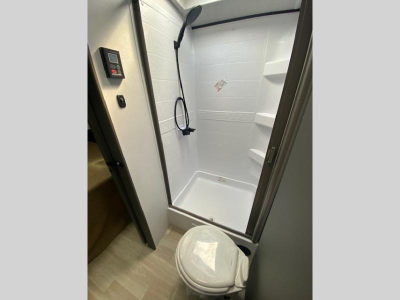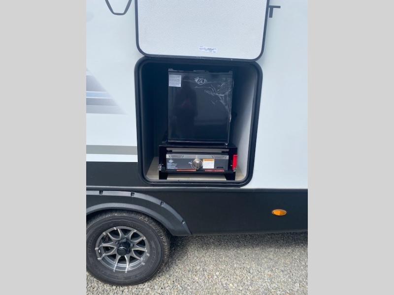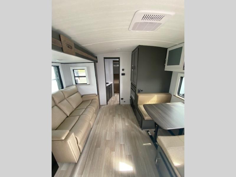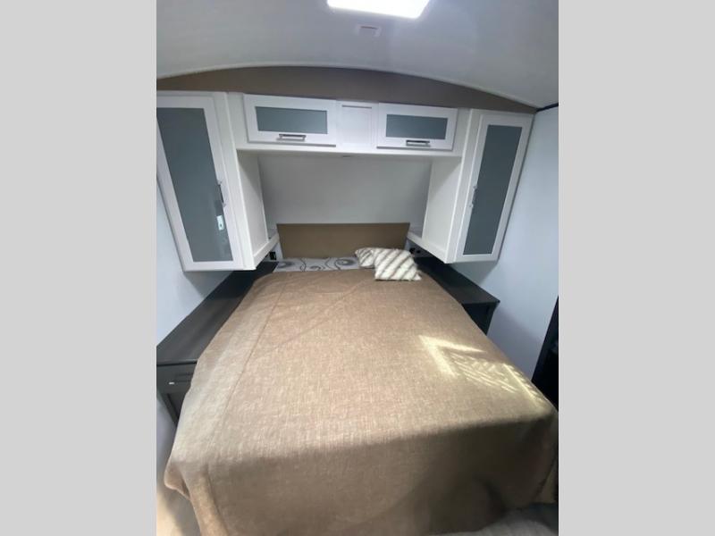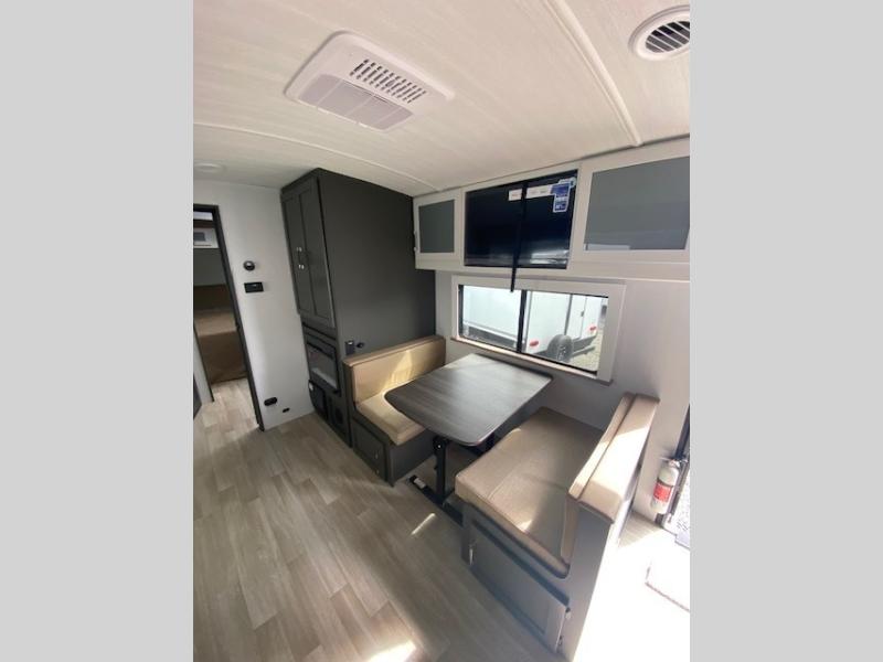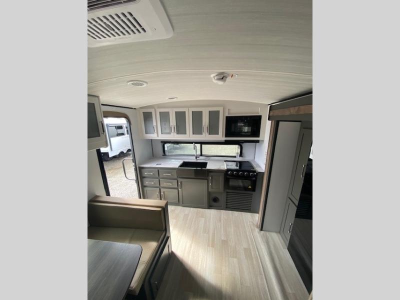 Perfect for road trips or camping excursions, this travel trailer is the safest bet! The rear kitchen is a highlight of the trailer, featuring a two-burner cooktop for preparing meals and a 12V refrigerator for keeping drinks and snacks fresh. Ample counter space and storage make meal prep a breeze. The booth dinette provides a cozy spot for meals and snacks, while the jackknife sofa offers a comfortable seating area that can be converted into a sleeping space. Enjoy your favorite shows on TV. In the heart of this RV, the walk-through bathroom is conveniently located and equipped with everything you need for a comfortable stay. And after a long day of adventures, sleep in the plush queen-sized bed and store all your personal items in the wardrobes and nightstands provided.