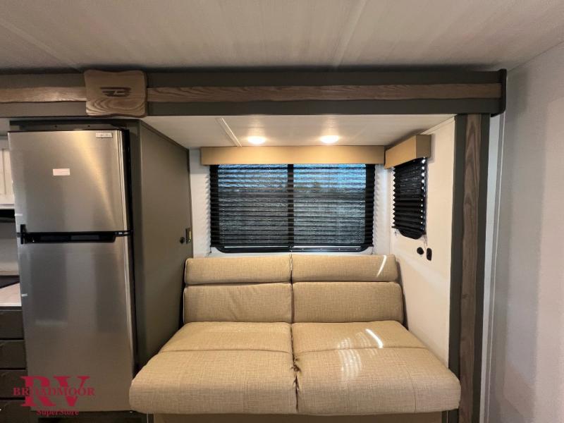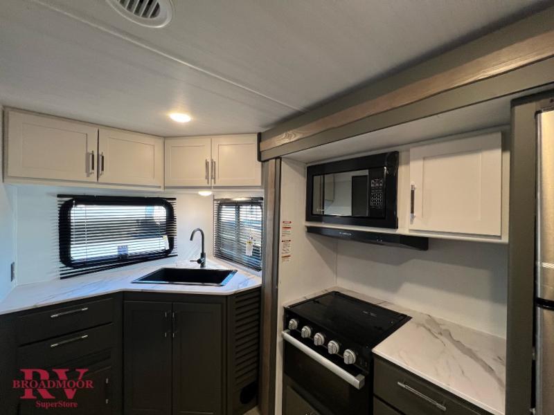 This travel trailer with a large slide out is sure to meet all your needs. When you arrive at the campground, you can put out the patio awning, unload the pass-thru storage, and relax in your camp chairs. The cooktop and microwave oven in the rear corner kitchen will let you make lunch for everyone, and the 8 cu. ft. refrigerator and pantry will help you keep food stocked. You will love having a queen bed to sleep on each night, and the booth dinette and jack knife sofa provide seating and sleeping space for guests!
