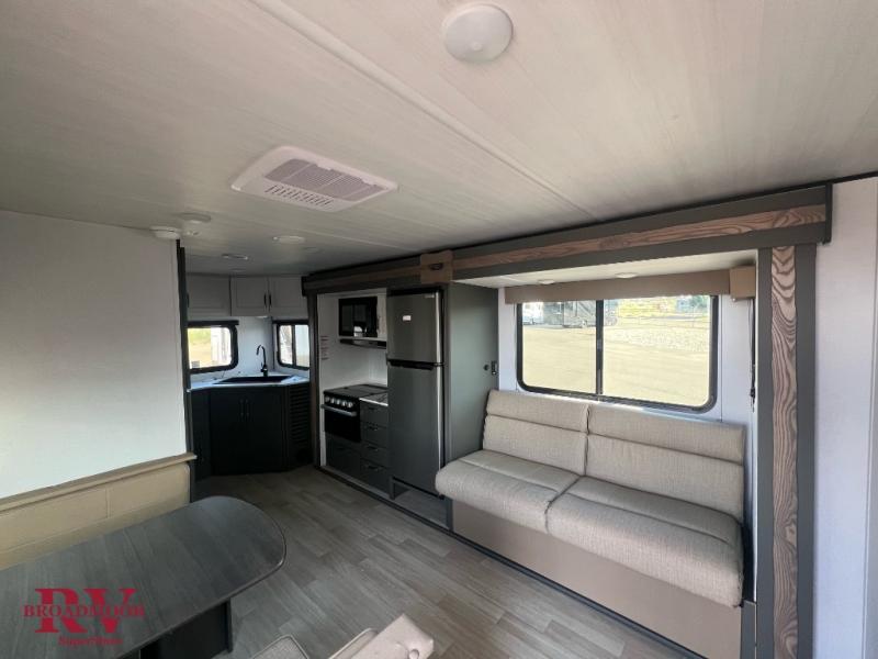 This travel trailer with a large slide out is sure to meet all your needs. When you arrive at the campground, you can put out the patio awning, unload the pass-thru storage, and relax in your camp chairs. The cooktop and microwave oven in the rear corner kitchen will let you make lunch for everyone, and the 8 cu. ft. refrigerator and pantry will help you keep food stocked. You will love having a queen bed to sleep on each night, and the booth dinette and jack knife sofa provide seating and sleeping space for guests!