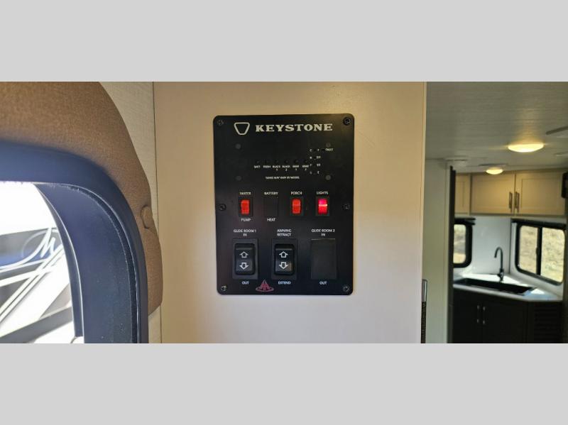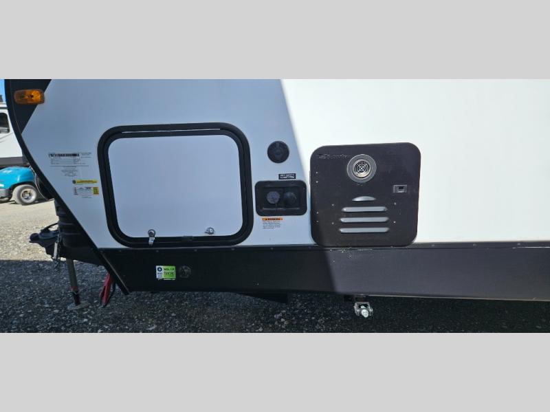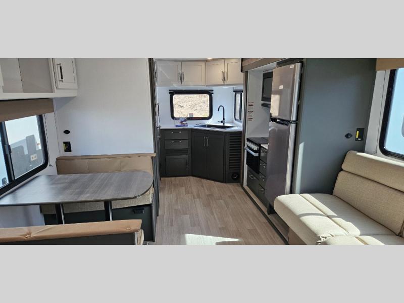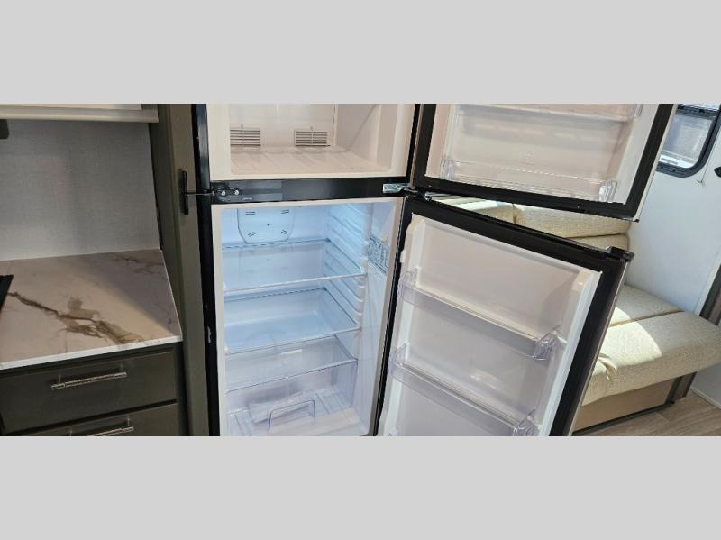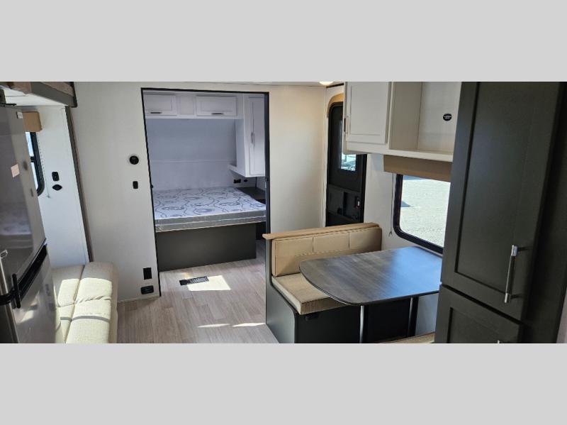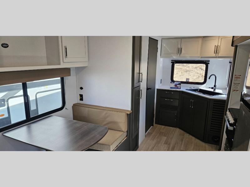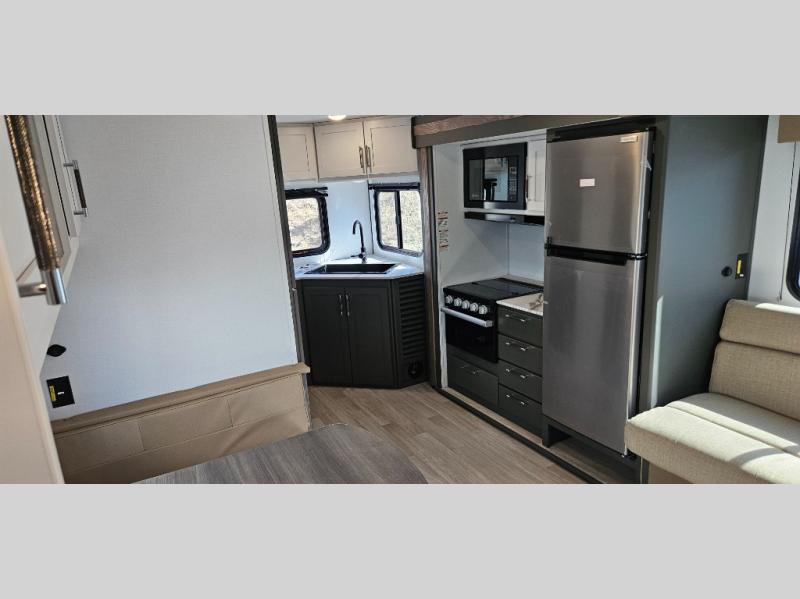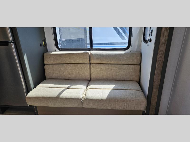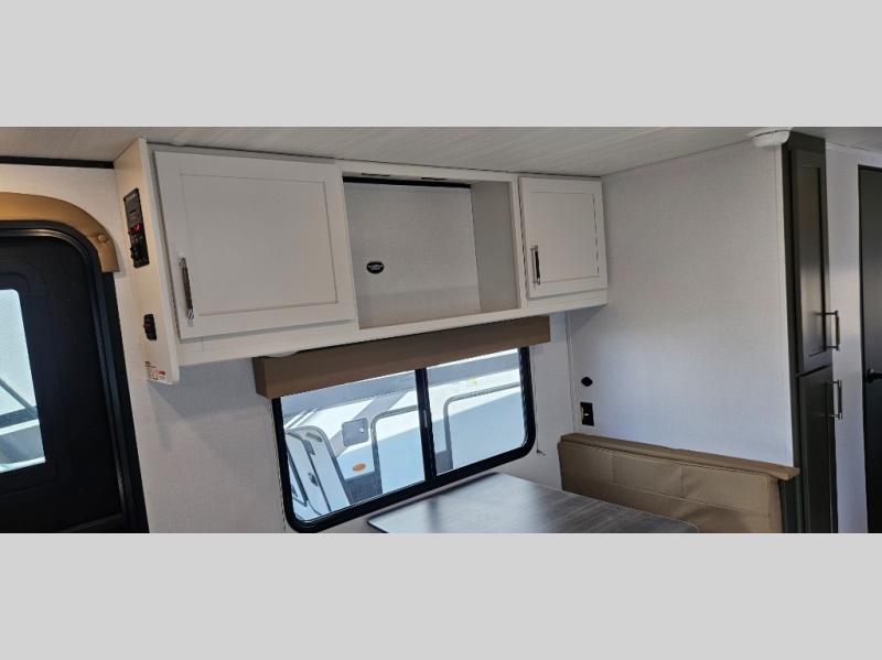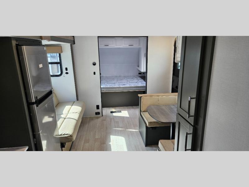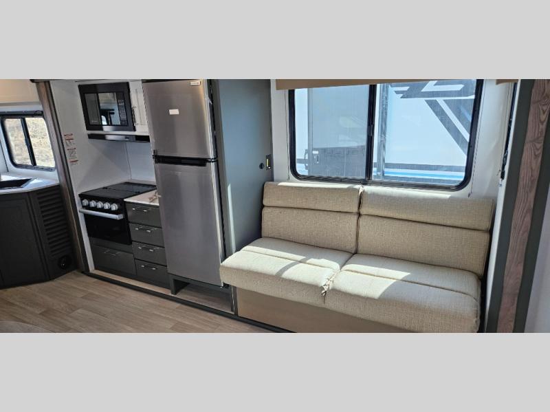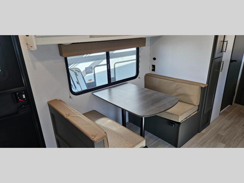 This travel trailer with a large slide out is sure to meet all your needs. When you arrive at the campground, you can put out the patio awning, unload the pass-thru storage, and relax in your camp chairs. The cooktop and microwave oven in the rear corner kitchen will let you make lunch for everyone, and the 8 cu. ft. refrigerator and pantry will help you keep food stocked. You will love having a queen bed to sleep on each night, and the booth dinette and jack knife sofa provide seating and sleeping space for guests!