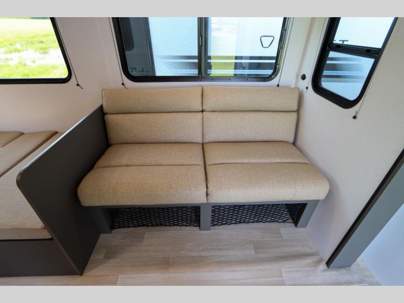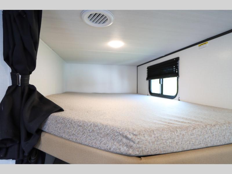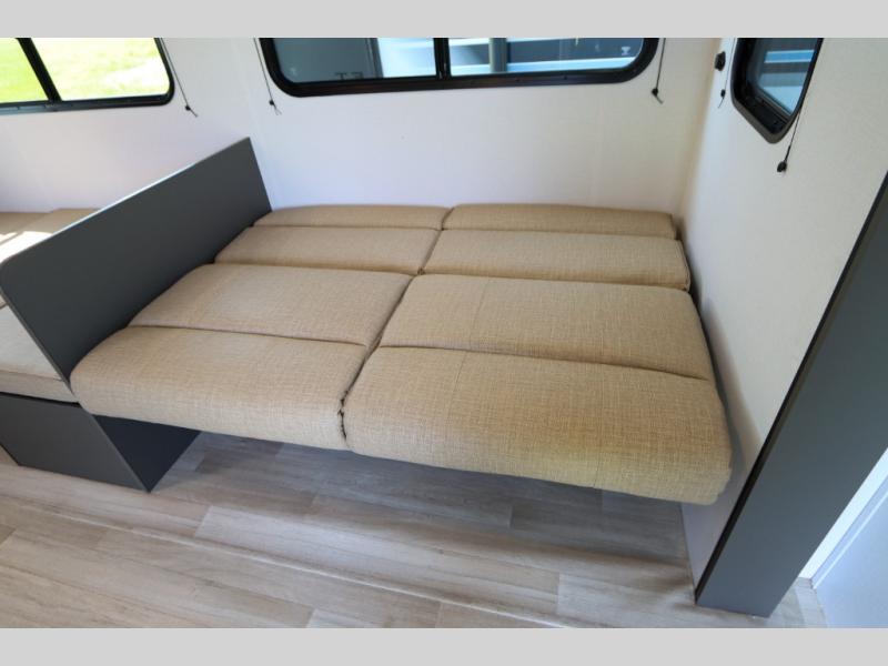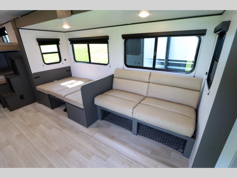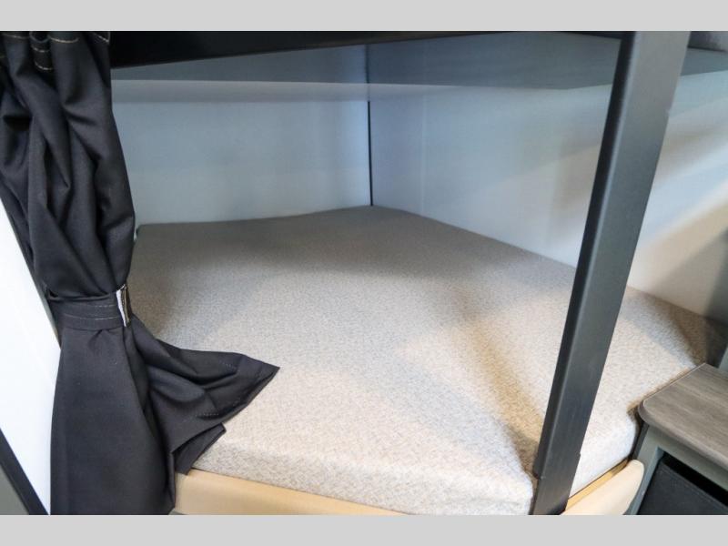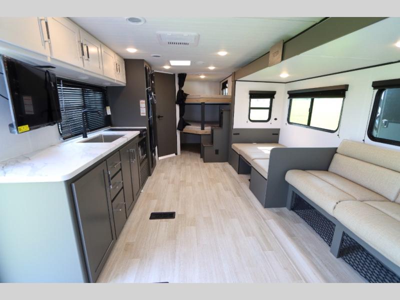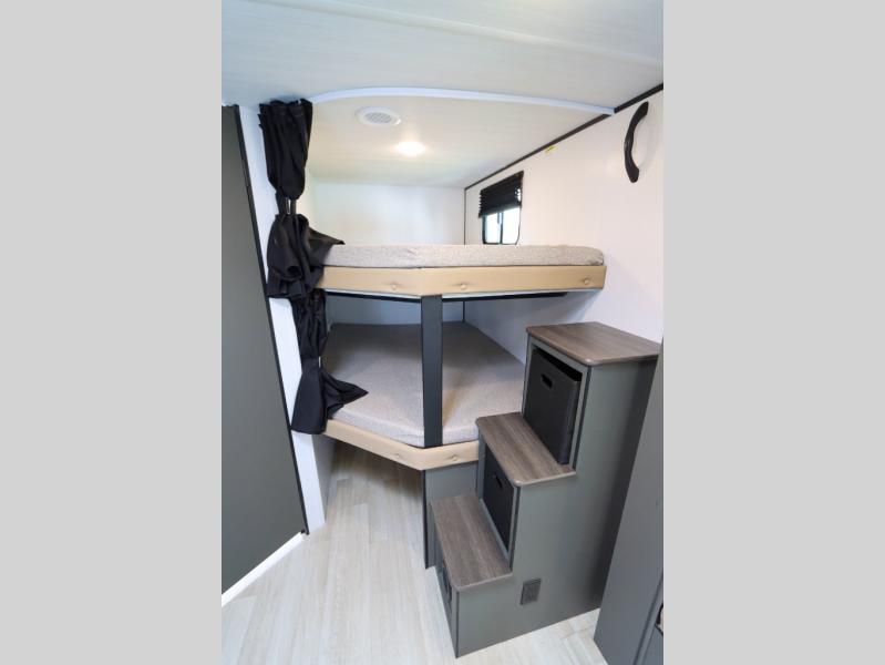 You can't go wrong with this travel trailer in tow! The double-size bunks feature a flip-up bunk for added storage, and they are right next to the full bath for easy nighttime use. You'll find the front semi-private bedroom to be accommodating with its queen bed and dual wardrobes to keep your things tidy. Head to the combined kitchen and living room to relax on the jack knife sofa or play a game around the U-shaped dinette, and these areas can even double as additional sleeping space if needed! The full kitchen includes a cooktop and microwave to make meals, plus an 8 cu.ft. refrigerator and pantry for food storage. And don't overlook the exterior with its patio awning and pass-thru storage!