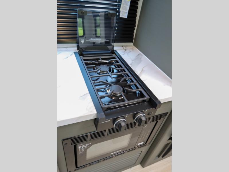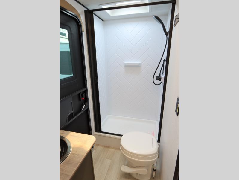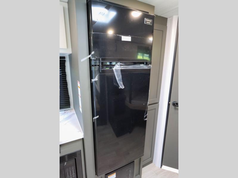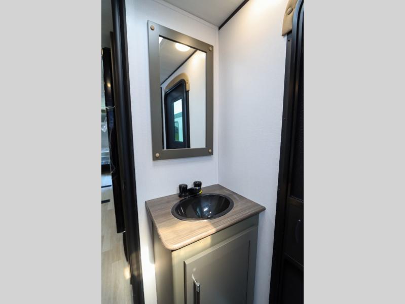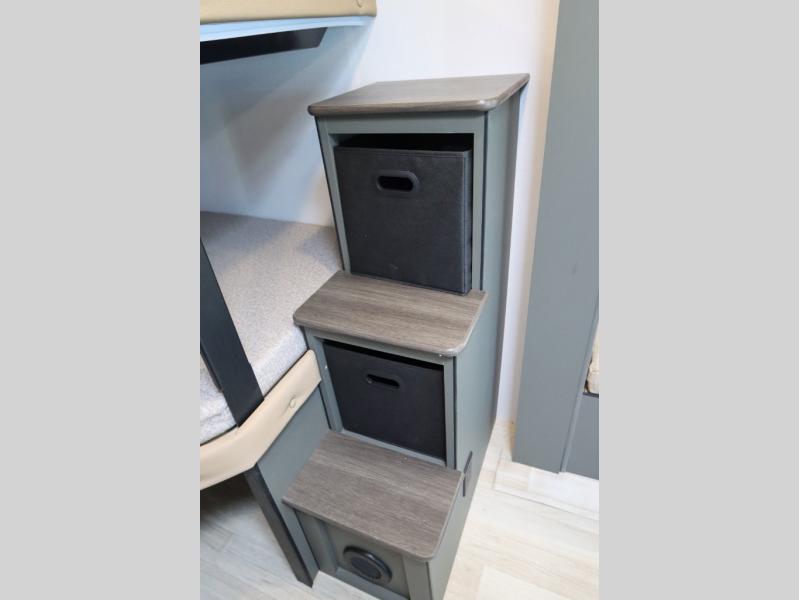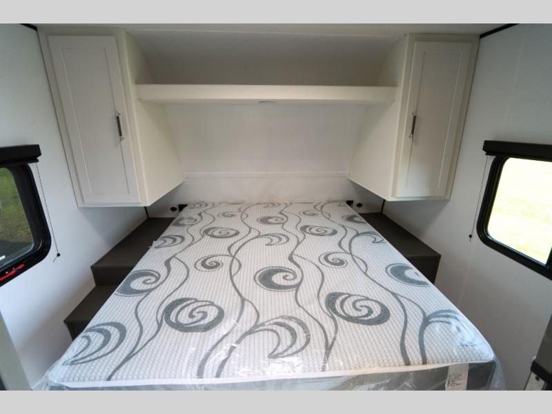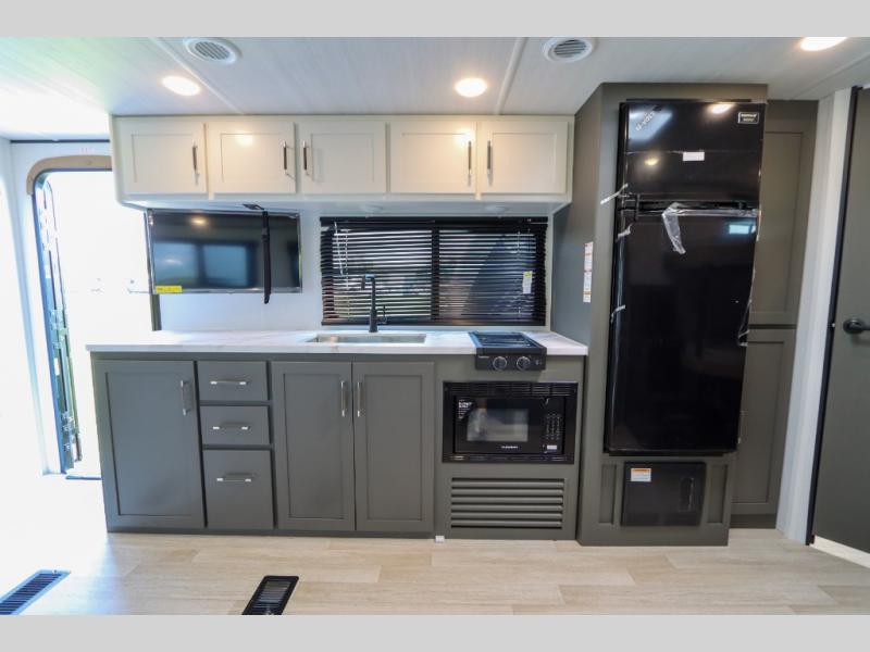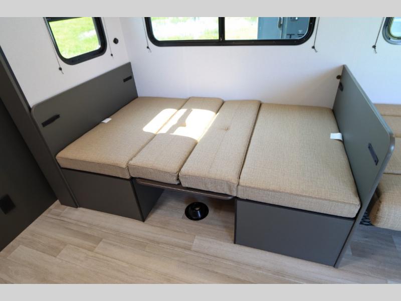 You can't go wrong with this travel trailer in tow! The double-size bunks feature a flip-up bunk for added storage, and they are right next to the full bath for easy nighttime use. You'll find the front semi-private bedroom to be accommodating with its queen bed and dual wardrobes to keep your things tidy. Head to the combined kitchen and living room to relax on the jack knife sofa or play a game around the U-shaped dinette, and these areas can even double as additional sleeping space if needed! The full kitchen includes a cooktop and microwave to make meals, plus an 8 cu.ft. refrigerator and pantry for food storage. And don't overlook the exterior with its patio awning and pass-thru storage!