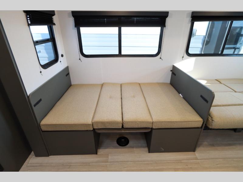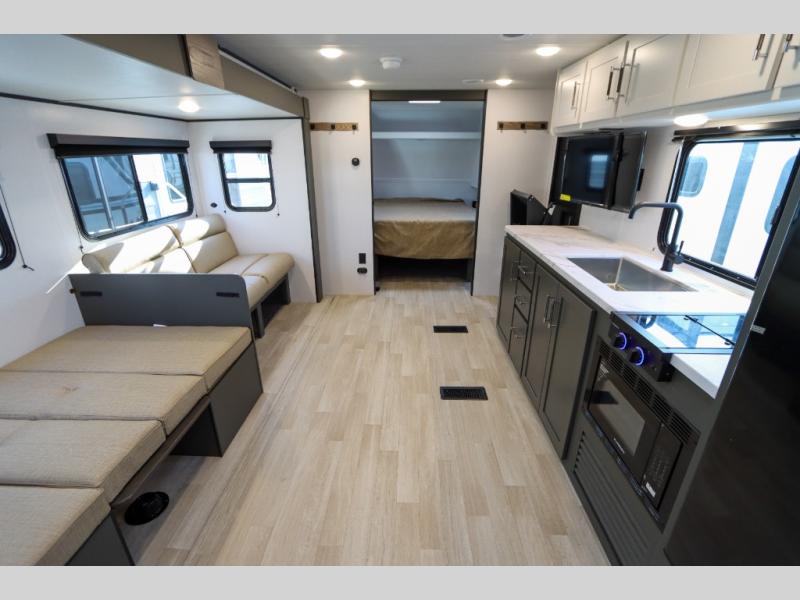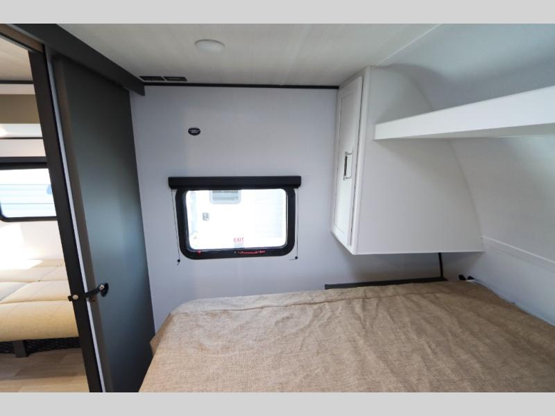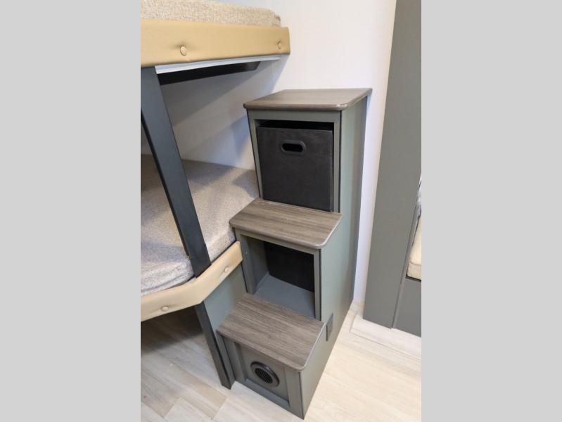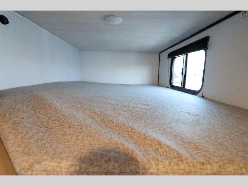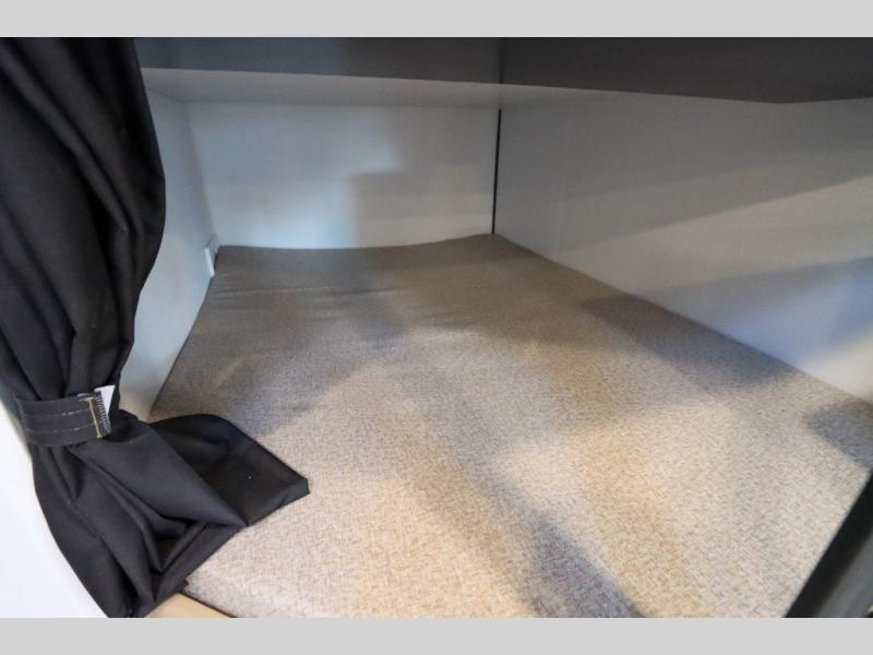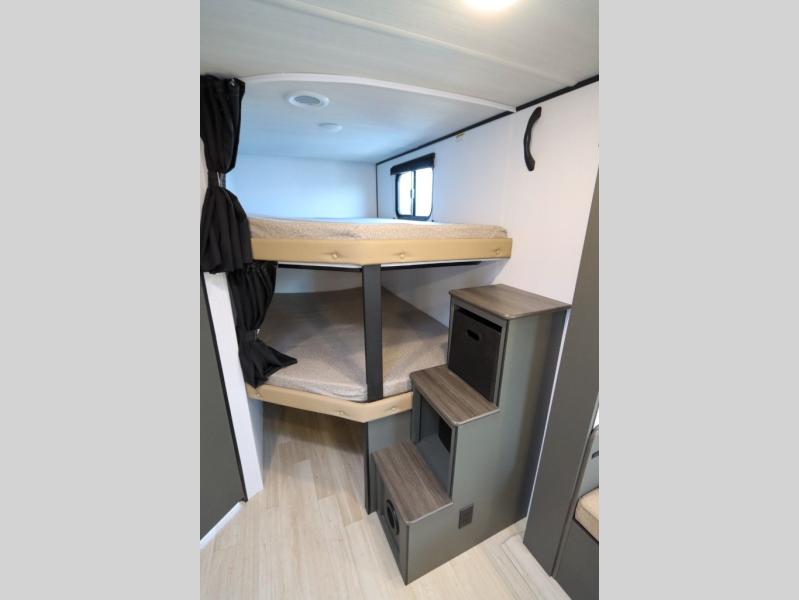 You can't go wrong with this travel trailer in tow! The double-size bunks feature a flip-up bunk for added storage, and they are right next to the full bath for easy nighttime use. You'll find the front semi-private bedroom to be accommodating with its queen bed and dual wardrobes to keep your things tidy. Head to the combined kitchen and living room to relax on the jack knife sofa or play a game around the U-shaped dinette, and these areas can even double as additional sleeping space if needed! The full kitchen includes a cooktop and microwave to make meals, plus an 8 cu.ft. refrigerator and pantry for food storage. And don't overlook the exterior with its patio awning and pass-thru storage!