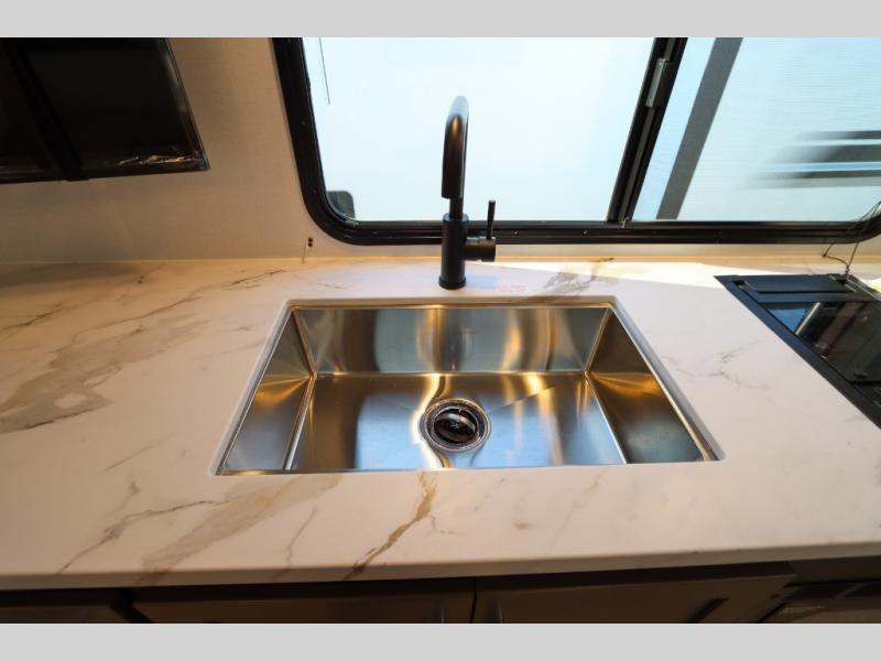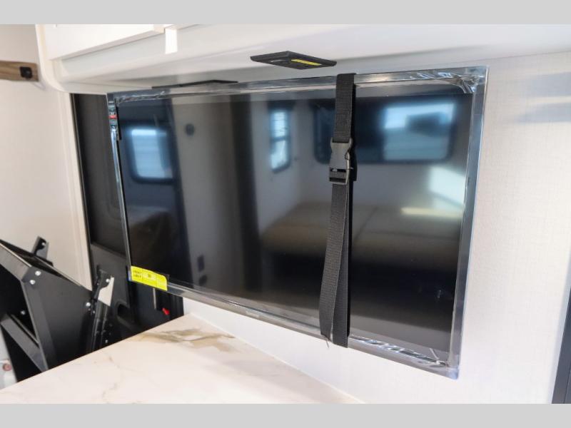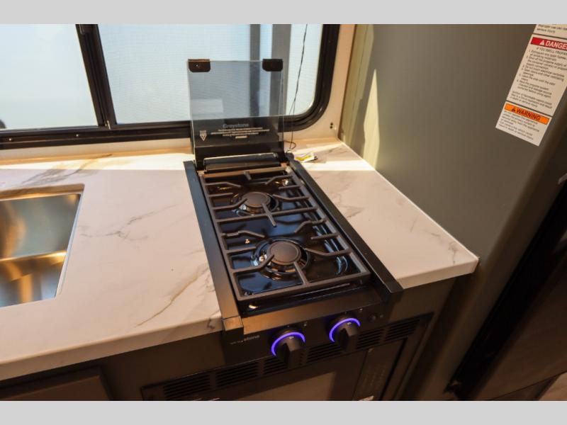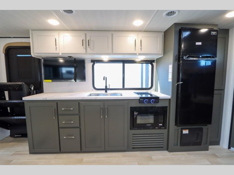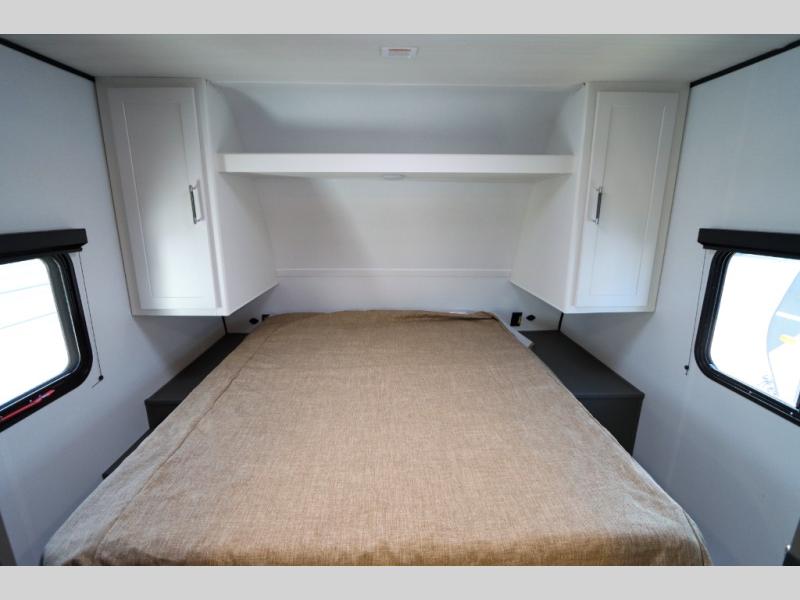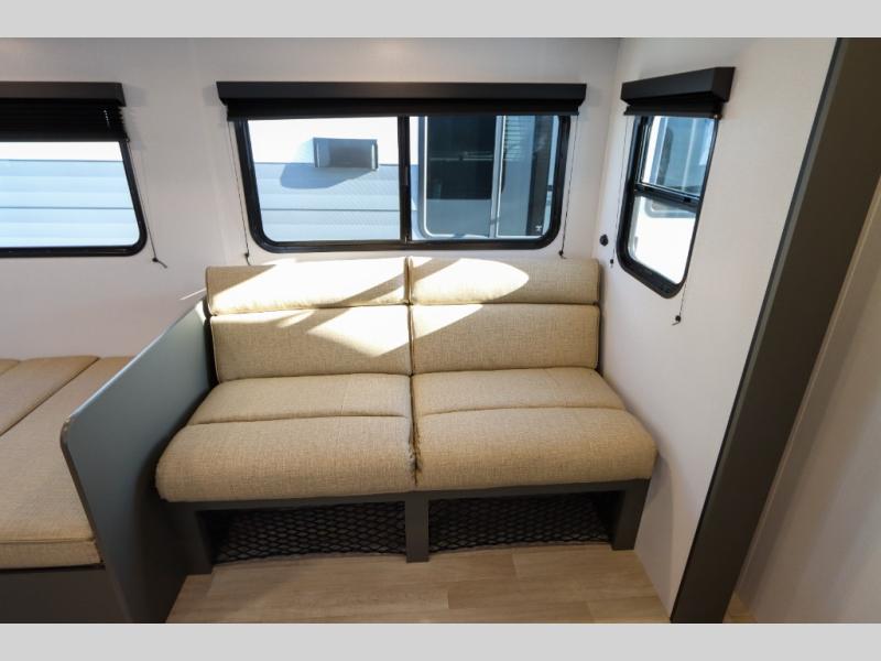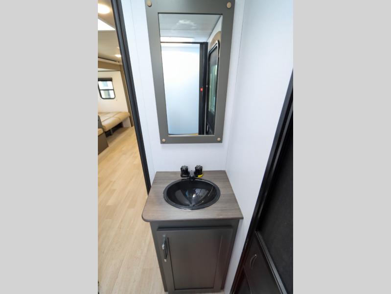 You can't go wrong with this travel trailer in tow! The double-size bunks feature a flip-up bunk for added storage, and they are right next to the full bath for easy nighttime use. You'll find the front semi-private bedroom to be accommodating with its queen bed and dual wardrobes to keep your things tidy. Head to the combined kitchen and living room to relax on the jack knife sofa or play a game around the U-shaped dinette, and these areas can even double as additional sleeping space if needed! The full kitchen includes a cooktop and microwave to make meals, plus an 8 cu.ft. refrigerator and pantry for food storage. And don't overlook the exterior with its patio awning and pass-thru storage!