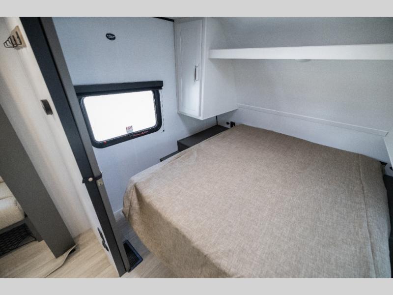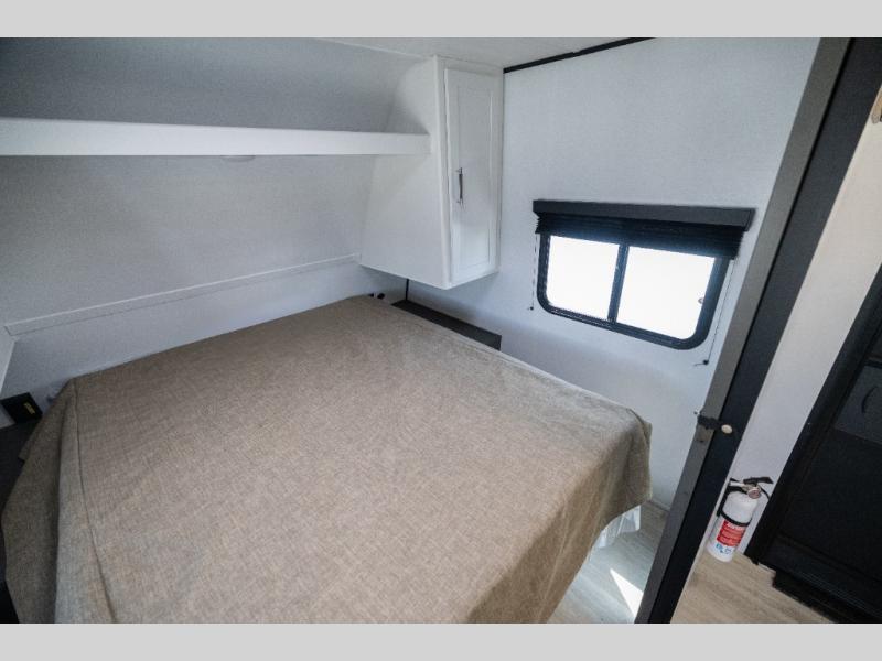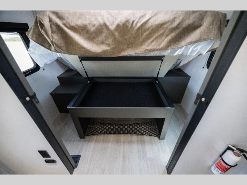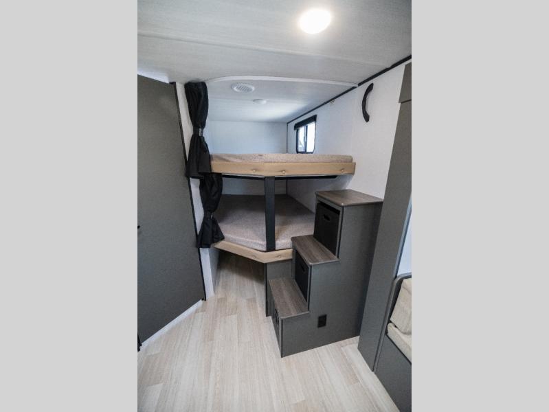 You can't go wrong with this travel trailer in tow! The double-size bunks feature a flip-up bunk for added storage, and they are right next to the full bath for easy nighttime use. You'll find the front semi-private bedroom to be accommodating with its queen bed and dual wardrobes to keep your things tidy. Head to the combined kitchen and living room to relax on the jack knife sofa or play a game around the U-shaped dinette, and these areas can even double as additional sleeping space if needed! The full kitchen includes a cooktop and microwave to make meals, plus an 8 cu.ft. refrigerator and pantry for food storage. And don't overlook the exterior with its patio awning and pass-thru storage!