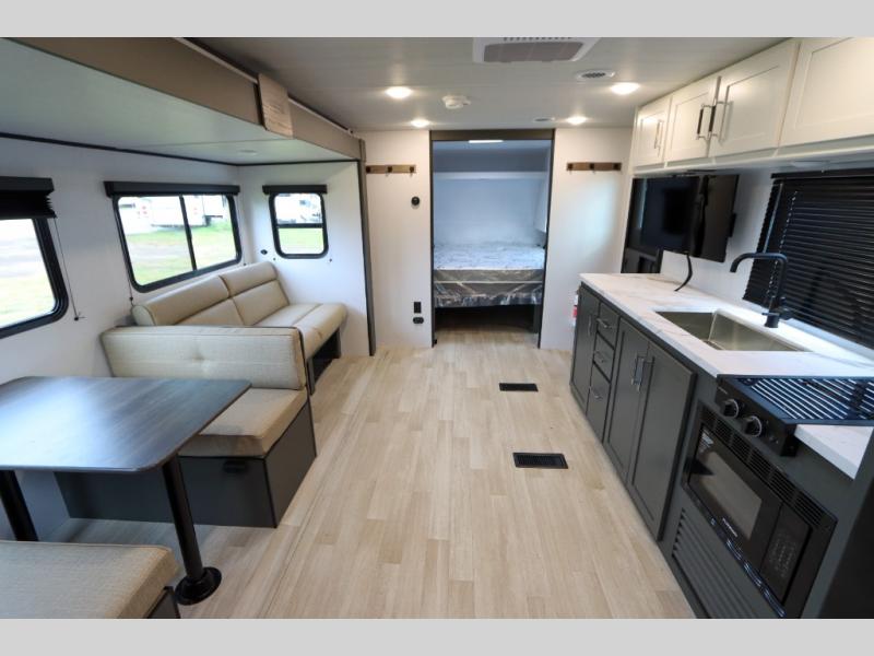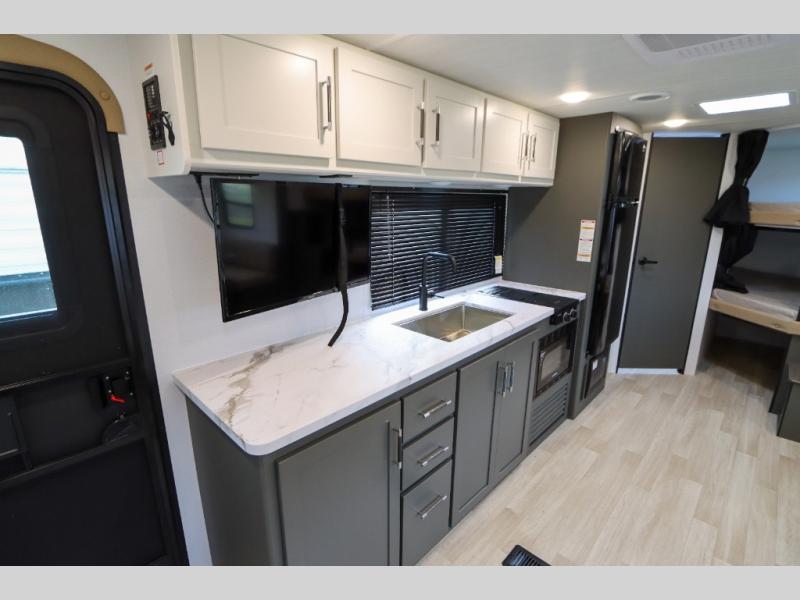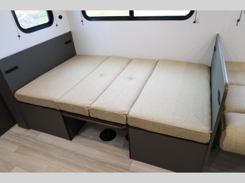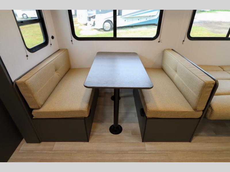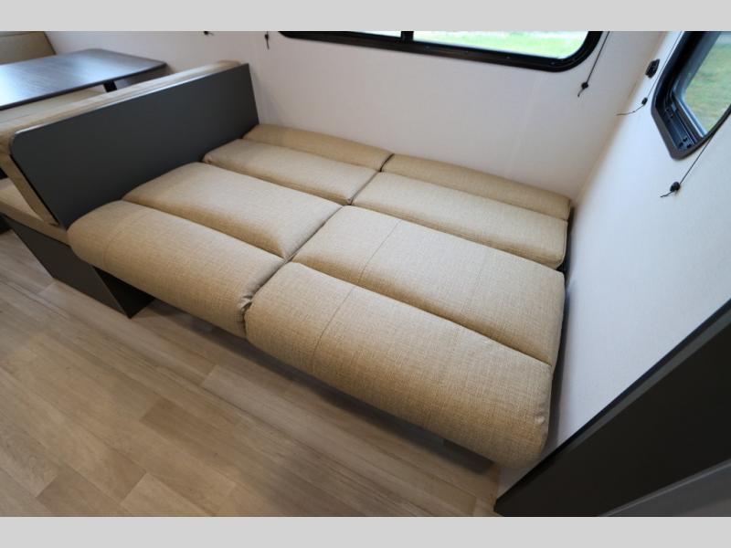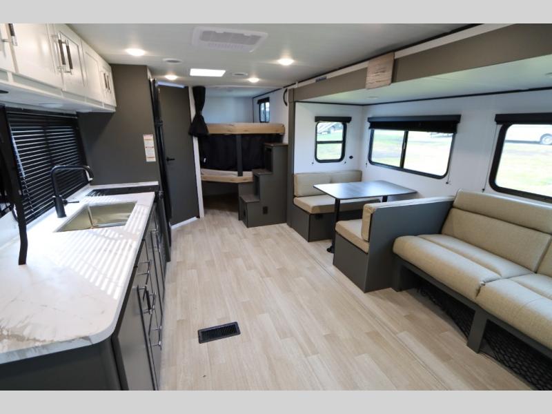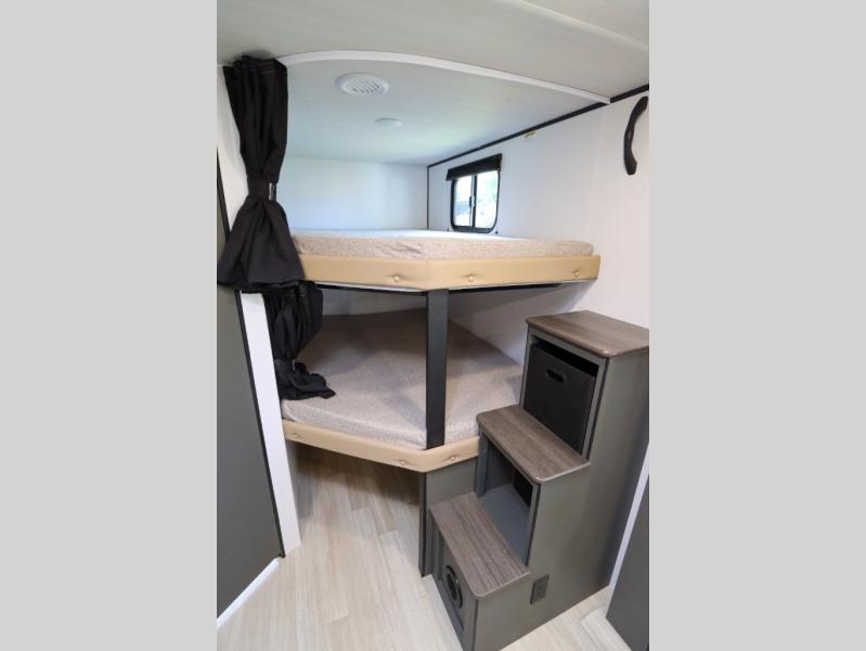You can't go wrong with this travel trailer in tow! The double-size bunks feature a flip-up bunk for added storage, and they are right next to the full bath for easy nighttime use. You'll find the front semi-private bedroom to be accommodating with its queen bed and dual wardrobes to keep your things tidy. Head to the combined kitchen and living room to relax on the jack knife sofa or play a game around the U-shaped dinette, and these areas can even double as additional sleeping space if needed! The full kitchen includes a cooktop and microwave to make meals, plus an 8 cu.ft. refrigerator and pantry for food storage. And don't overlook the exterior with its patio awning and pass-thru storage!