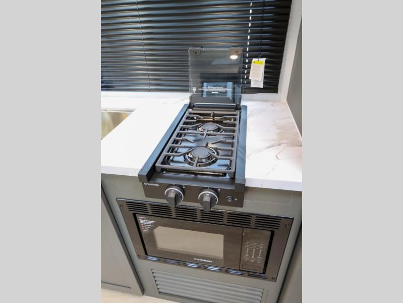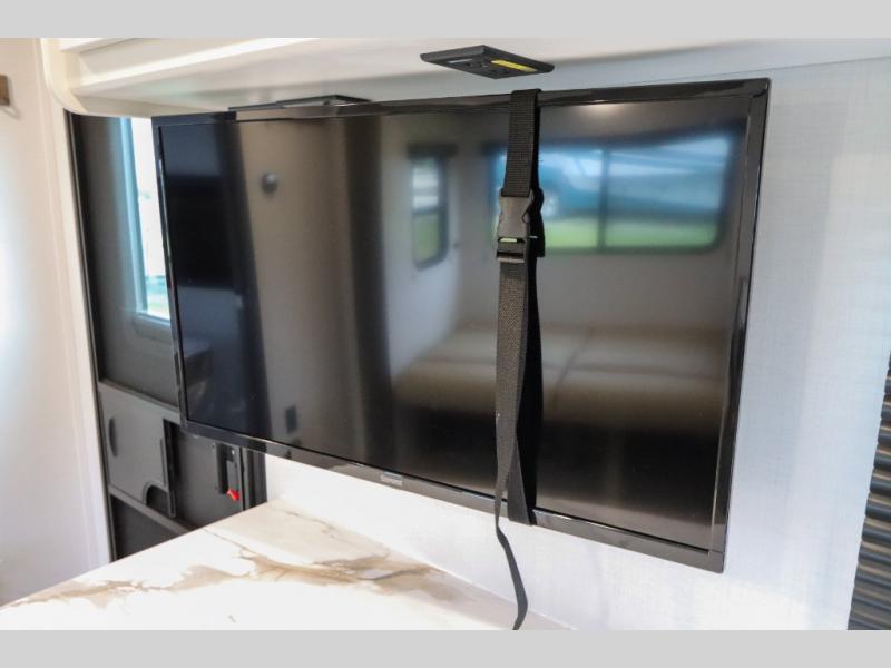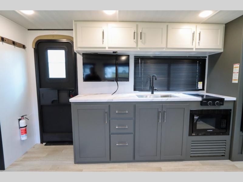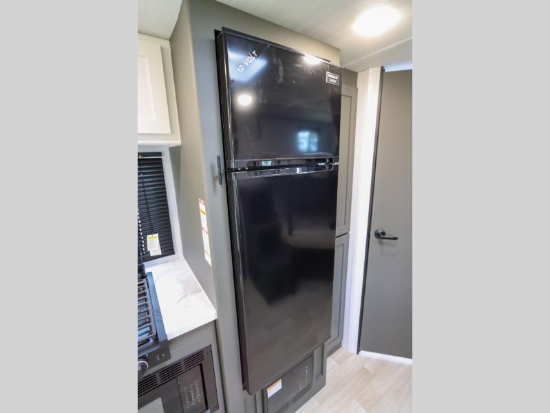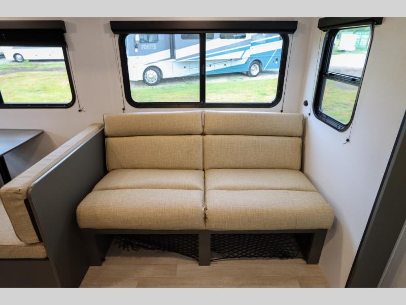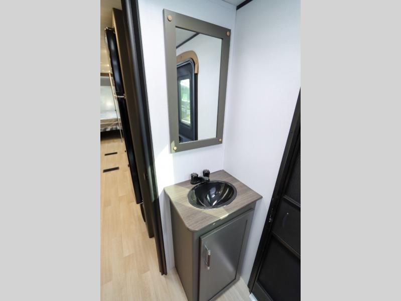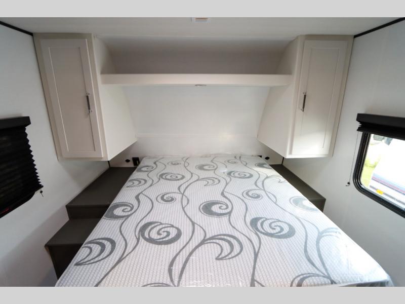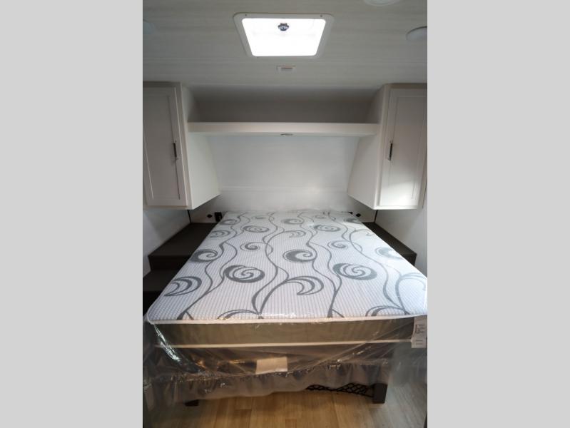 You can't go wrong with this travel trailer in tow! The double-size bunks feature a flip-up bunk for added storage, and they are right next to the full bath for easy nighttime use. You'll find the front semi-private bedroom to be accommodating with its queen bed and dual wardrobes to keep your things tidy. Head to the combined kitchen and living room to relax on the jack knife sofa or play a game around the U-shaped dinette, and these areas can even double as additional sleeping space if needed! The full kitchen includes a cooktop and microwave to make meals, plus an 8 cu.ft. refrigerator and pantry for food storage. And don't overlook the exterior with its patio awning and pass-thru storage!