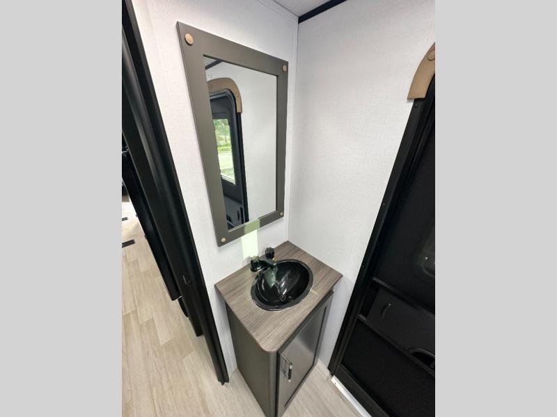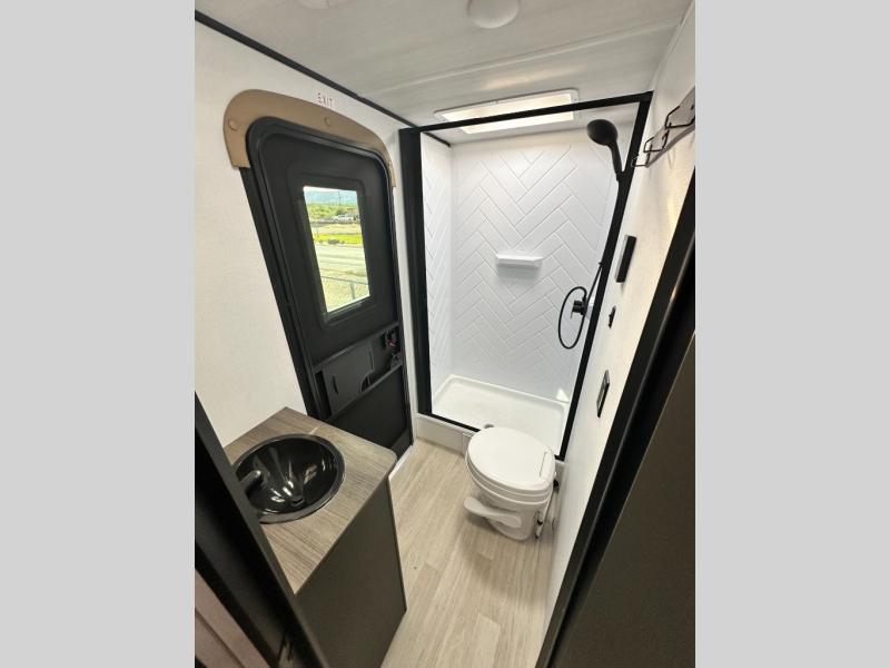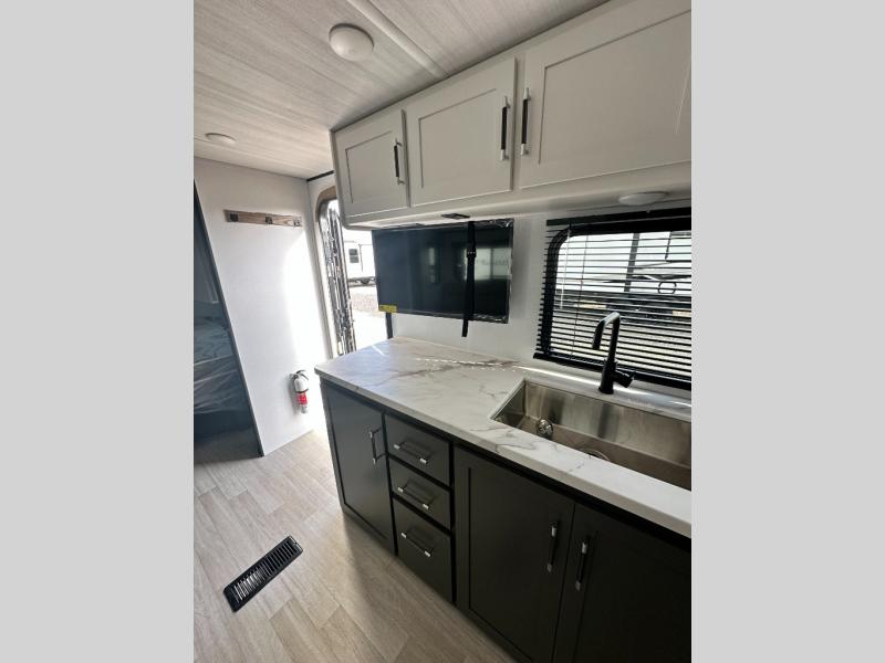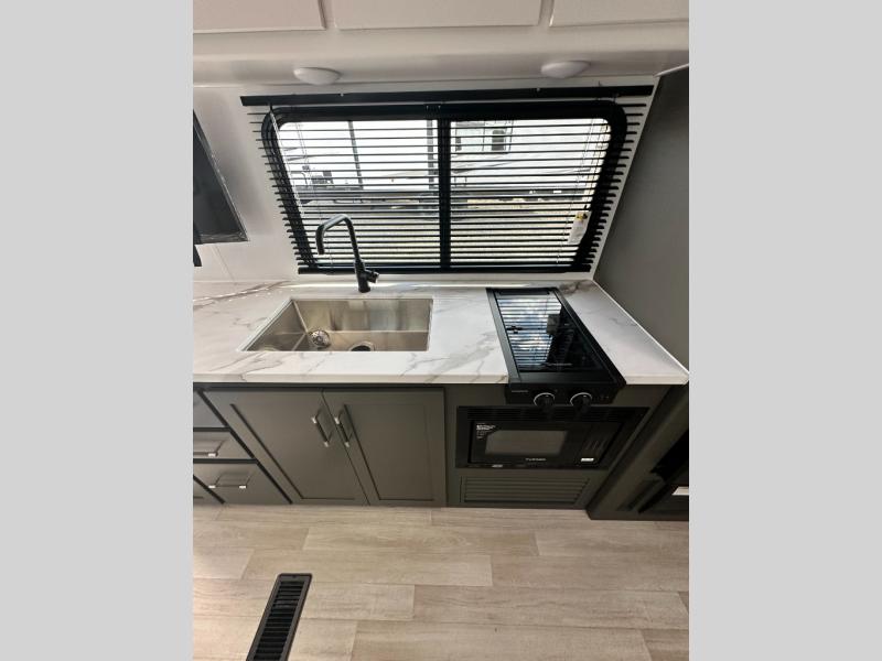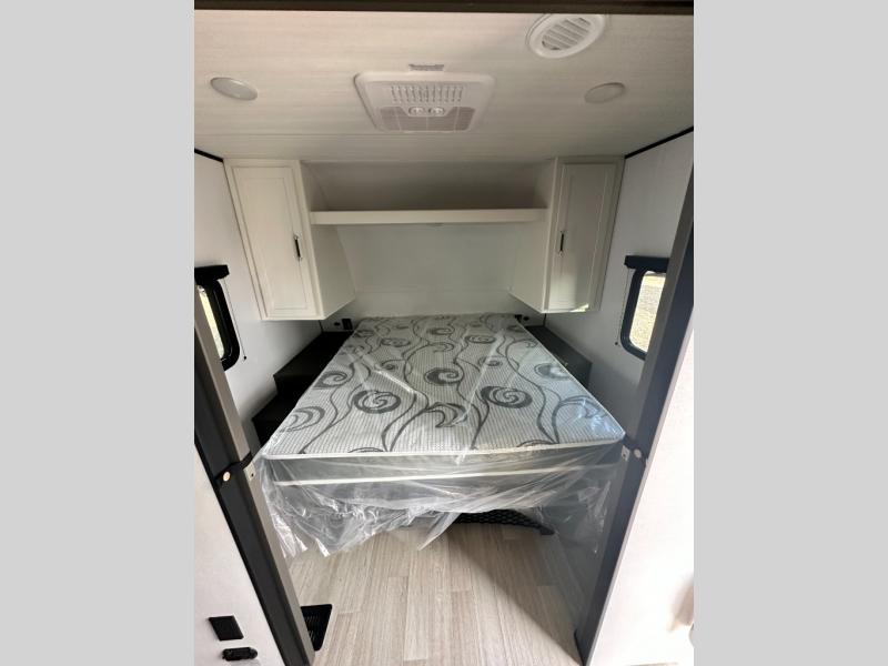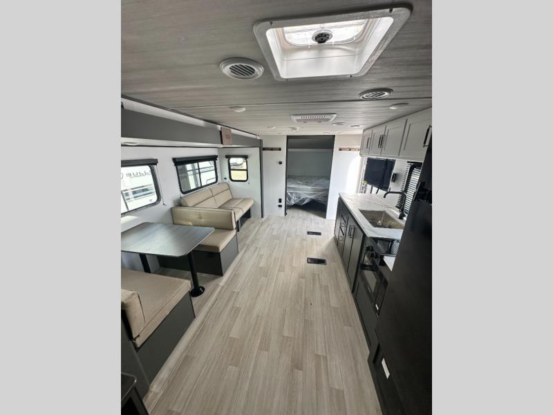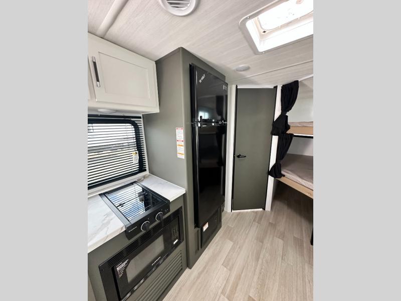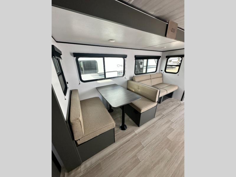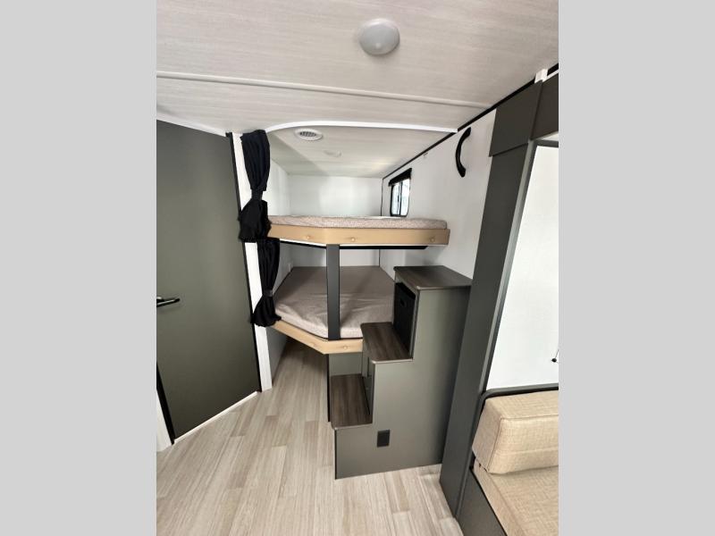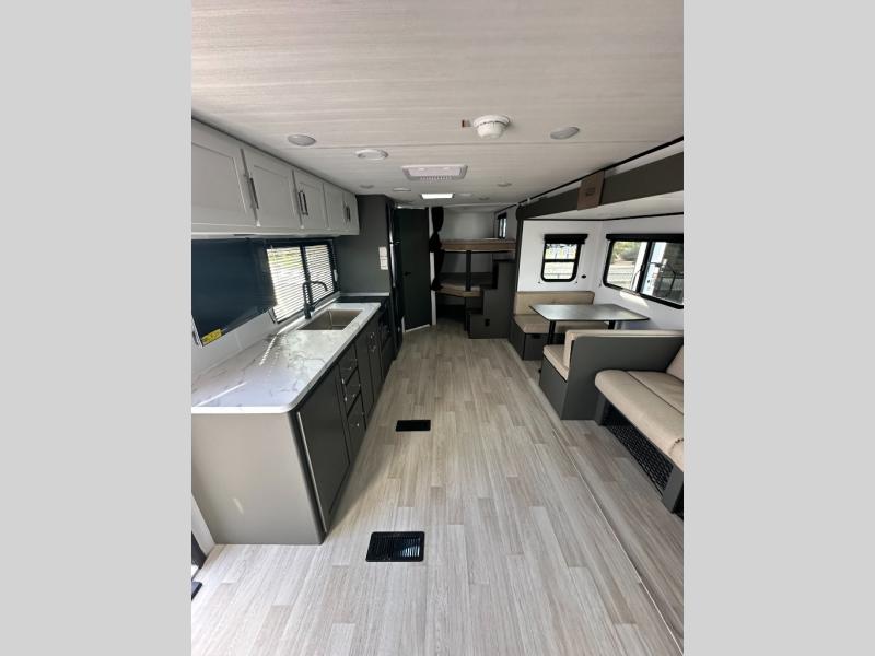 This travel trailer is designed for discerning families who crave adventure! The double-sized bunks provides a snug and inviting sleeping spot for kids, while the immaculately appointed full bathroom is thoughtfully designed for a refreshing stay. The kitchen is equipped with a generous pantry for storing gourmet ingredients, a high-performance refrigerator for keeping drinks and meals perfectly chilled, a rapid-cooking microwave, and a precision-crafted two-burner cooktop for preparing exquisite meals. Expansive overhead cabinets provide ample storage for fine china and cookware. The stylish booth dinette provides an intimate and convivial spot for meals and snacks, while the plush jackknife sofa offers a comfortable seating area that can be converted into a luxurious sleeping space. And after a long day in the woods, rest in the private front bedroom featuring a sumptuous queen-sized bed with a convenient nightstand and spacious dual wardrobes on each side.