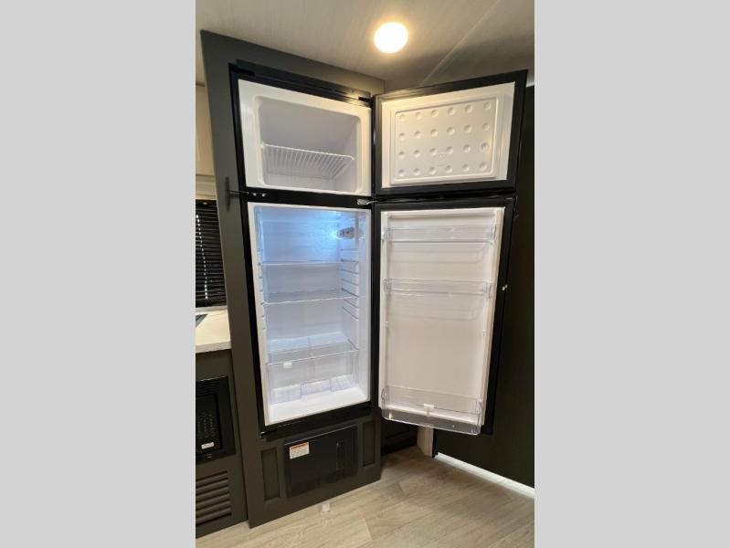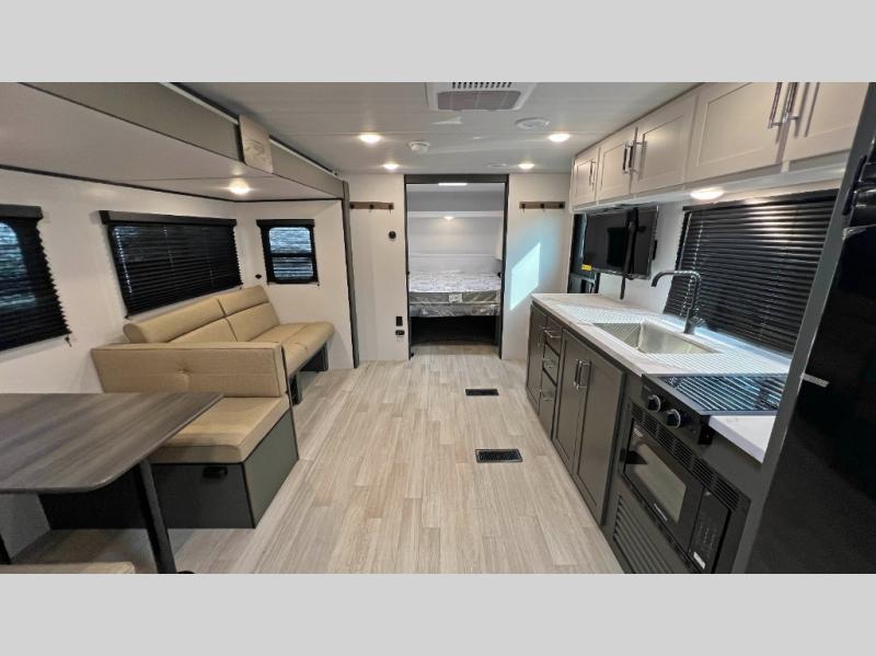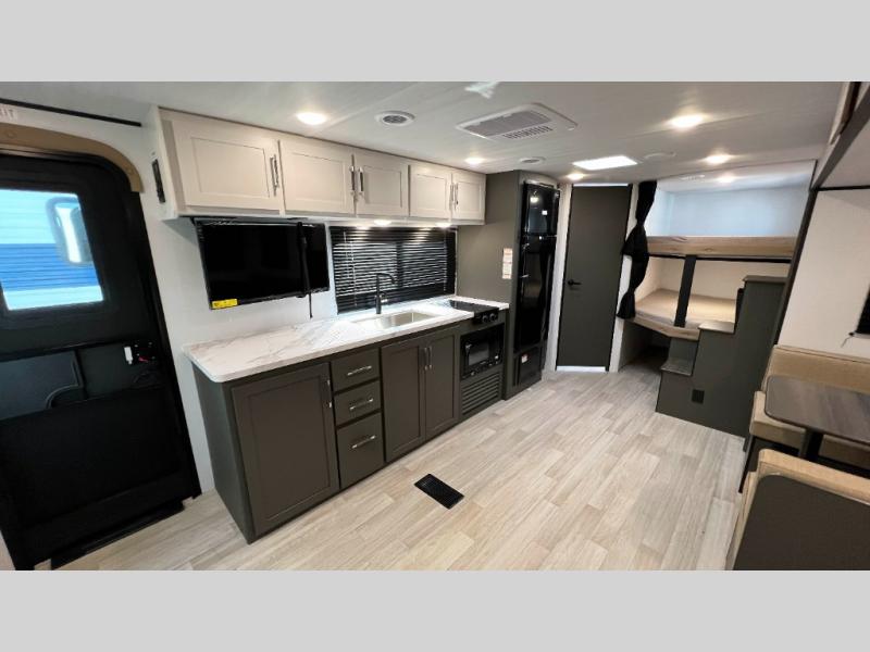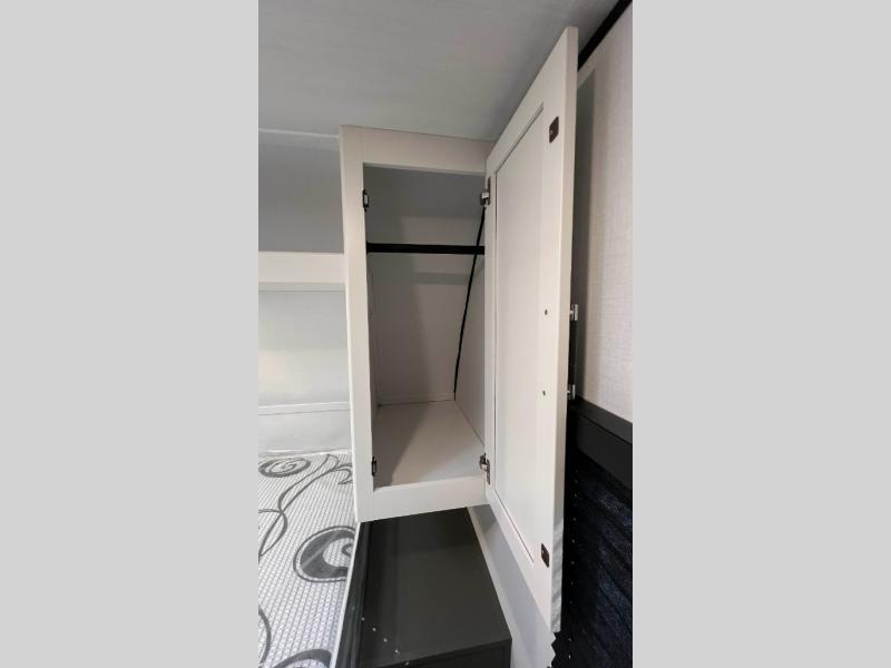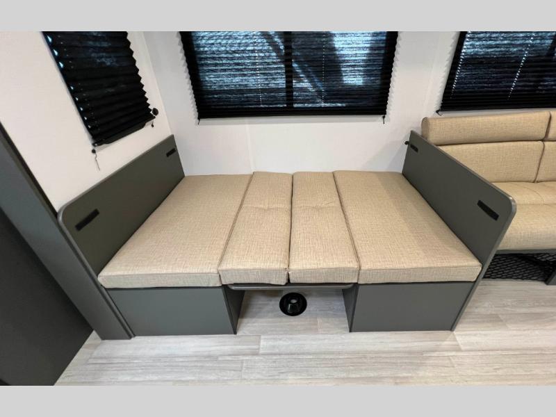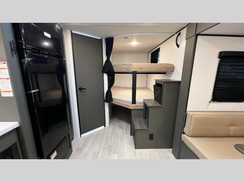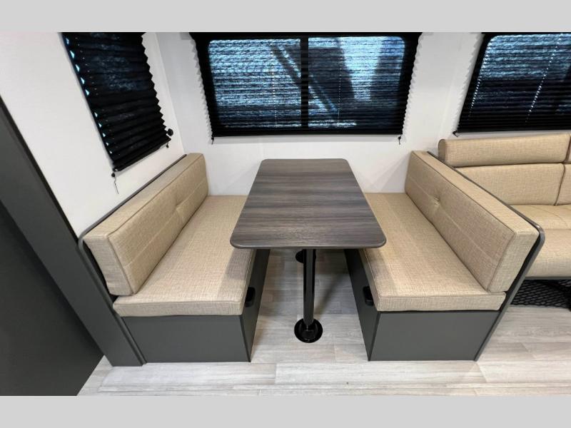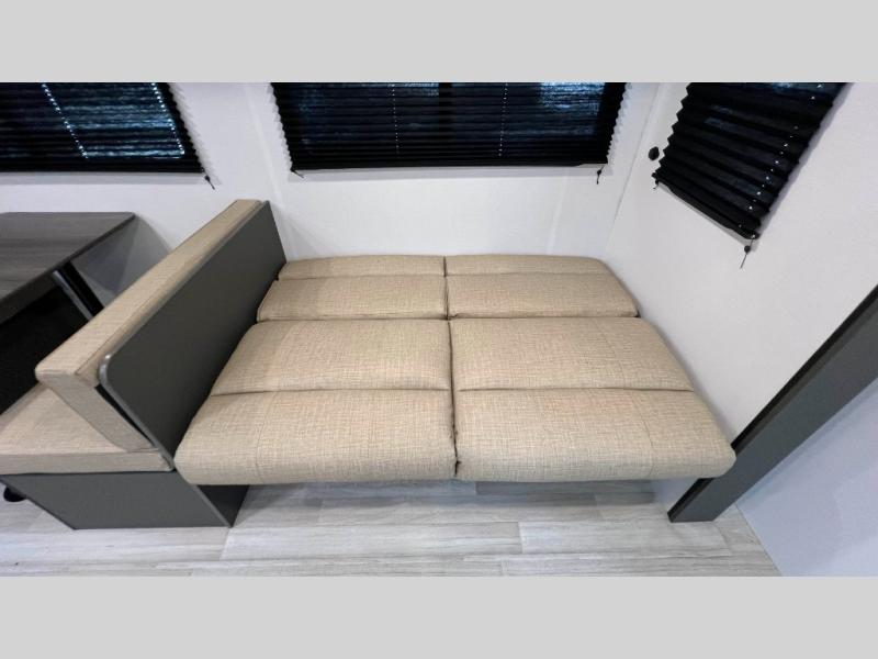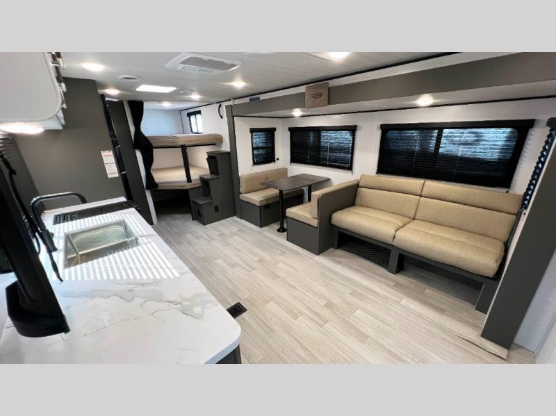 This travel trailer is designed for discerning families who crave adventure! The double-sized bunks provides a snug and inviting sleeping spot for kids, while the immaculately appointed full bathroom is thoughtfully designed for a refreshing stay. The kitchen is equipped with a generous pantry for storing gourmet ingredients, a high-performance refrigerator for keeping drinks and meals perfectly chilled, a rapid-cooking microwave, and a precision-crafted two-burner cooktop for preparing exquisite meals. Expansive overhead cabinets provide ample storage for fine china and cookware. The stylish booth dinette provides an intimate and convivial spot for meals and snacks, while the plush jackknife sofa offers a comfortable seating area that can be converted into a luxurious sleeping space. And after a long day in the woods, rest in the private front bedroom featuring a sumptuous queen-sized bed with a convenient nightstand and spacious dual wardrobes on each side.