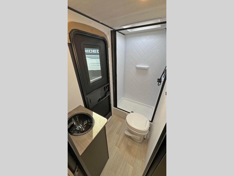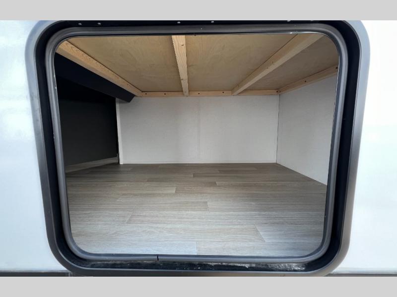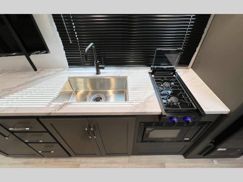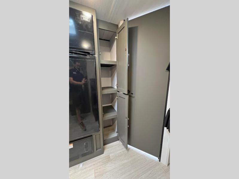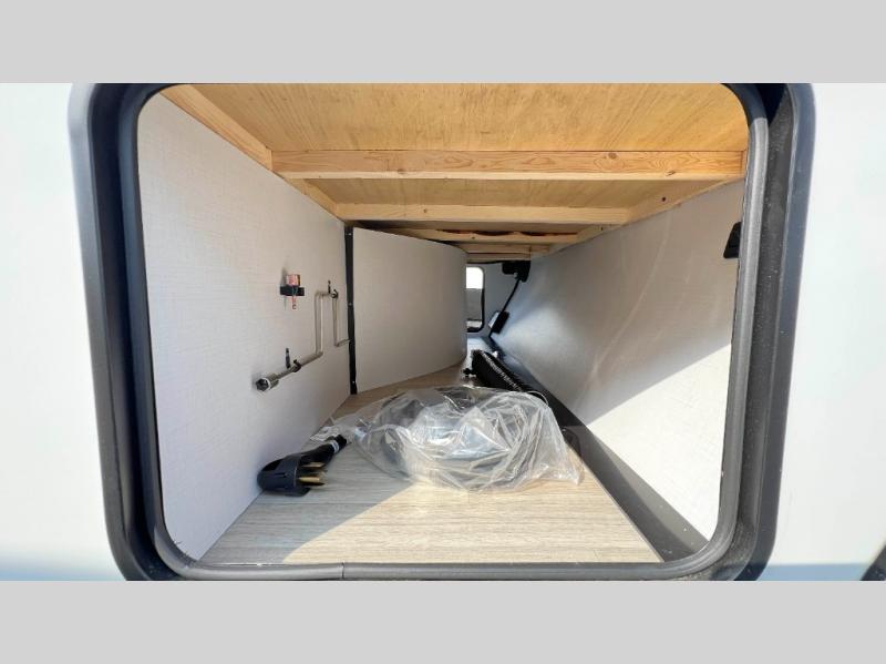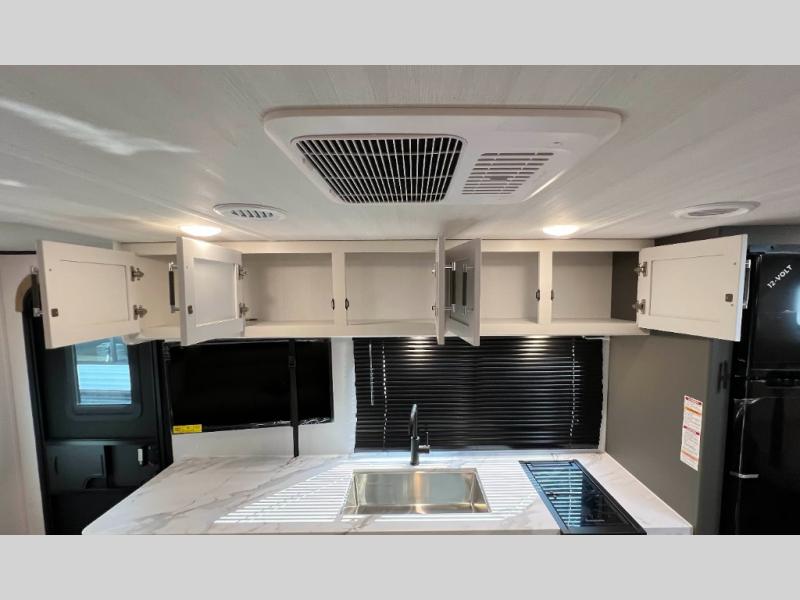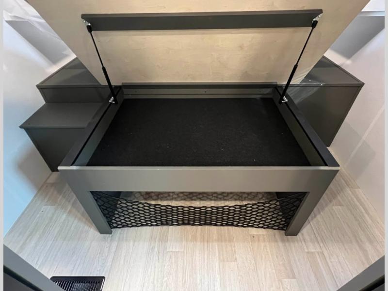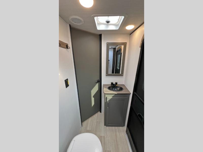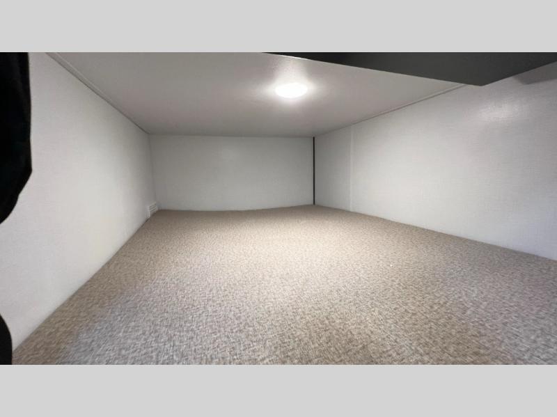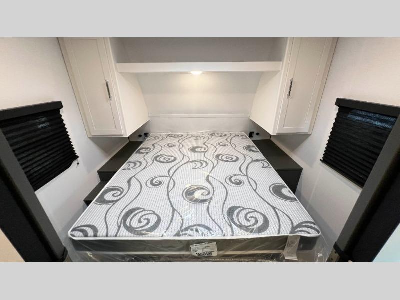 This travel trailer is designed for discerning families who crave adventure! The double-sized bunks provides a snug and inviting sleeping spot for kids, while the immaculately appointed full bathroom is thoughtfully designed for a refreshing stay. The kitchen is equipped with a generous pantry for storing gourmet ingredients, a high-performance refrigerator for keeping drinks and meals perfectly chilled, a rapid-cooking microwave, and a precision-crafted two-burner cooktop for preparing exquisite meals. Expansive overhead cabinets provide ample storage for fine china and cookware. The stylish booth dinette provides an intimate and convivial spot for meals and snacks, while the plush jackknife sofa offers a comfortable seating area that can be converted into a luxurious sleeping space. And after a long day in the woods, rest in the private front bedroom featuring a sumptuous queen-sized bed with a convenient nightstand and spacious dual wardrobes on each side.