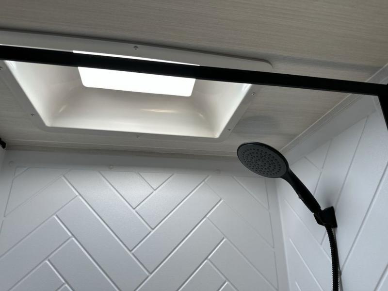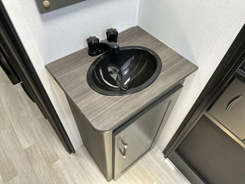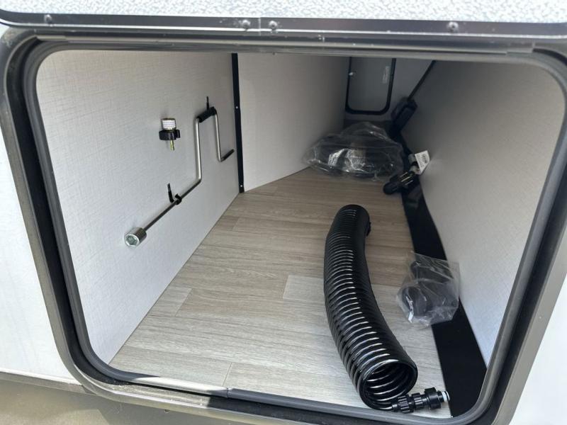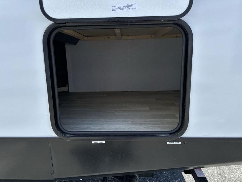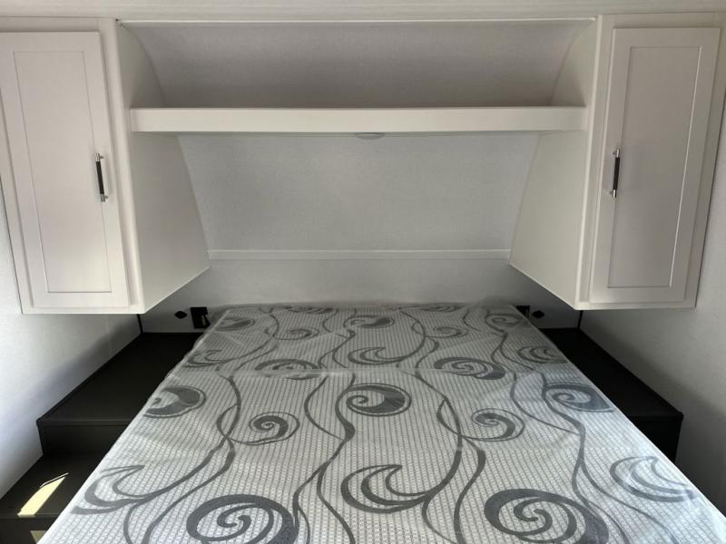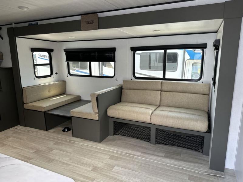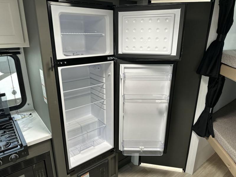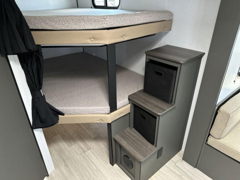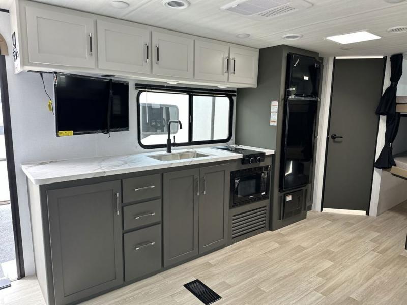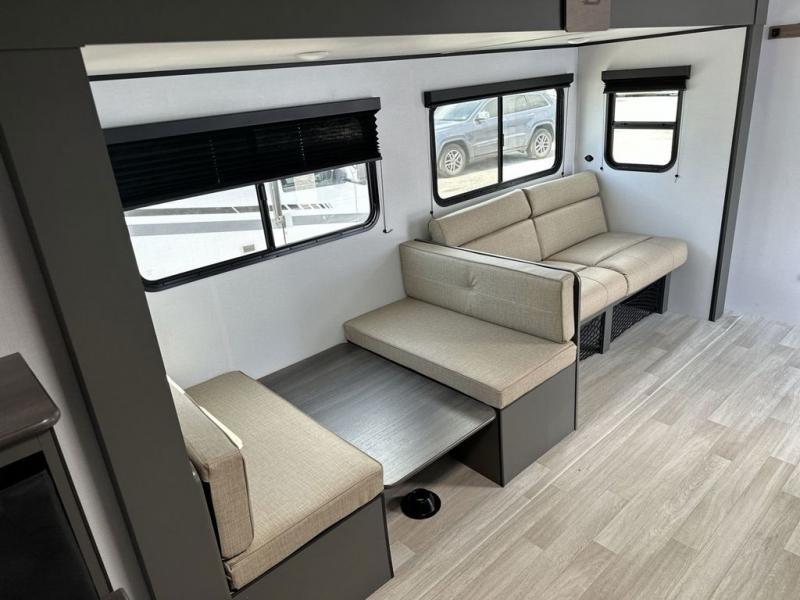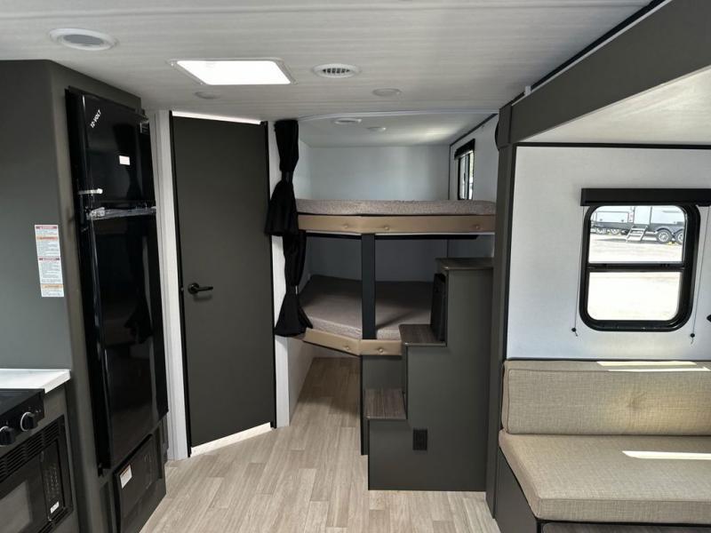 This travel trailer is designed for discerning families who crave adventure! The double-sized bunks provides a snug and inviting sleeping spot for kids, while the immaculately appointed full bathroom is thoughtfully designed for a refreshing stay. The kitchen is equipped with a generous pantry for storing gourmet ingredients, a high-performance refrigerator for keeping drinks and meals perfectly chilled, a rapid-cooking microwave, and a precision-crafted two-burner cooktop for preparing exquisite meals. Expansive overhead cabinets provide ample storage for fine china and cookware. The stylish booth dinette provides an intimate and convivial spot for meals and snacks, while the plush jackknife sofa offers a comfortable seating area that can be converted into a luxurious sleeping space. And after a long day in the woods, rest in the private front bedroom featuring a sumptuous queen-sized bed with a convenient nightstand and spacious dual wardrobes on each side.