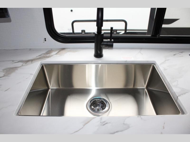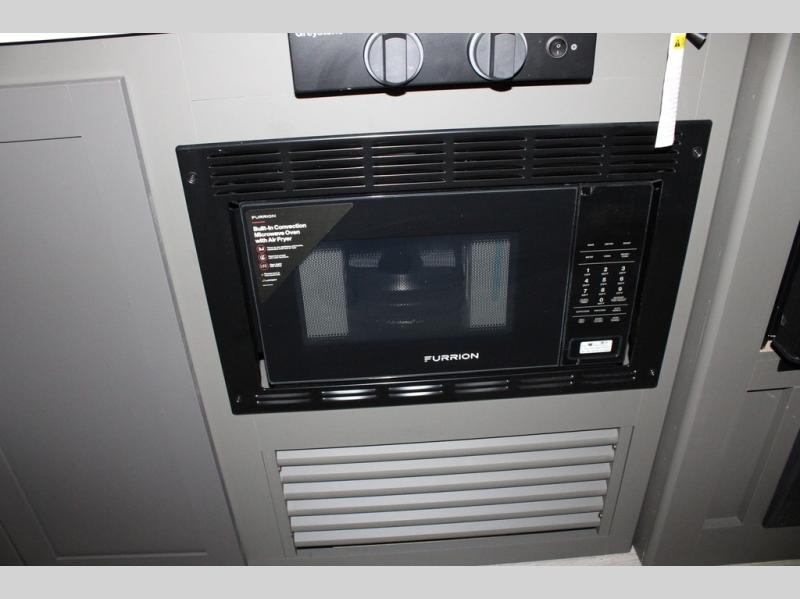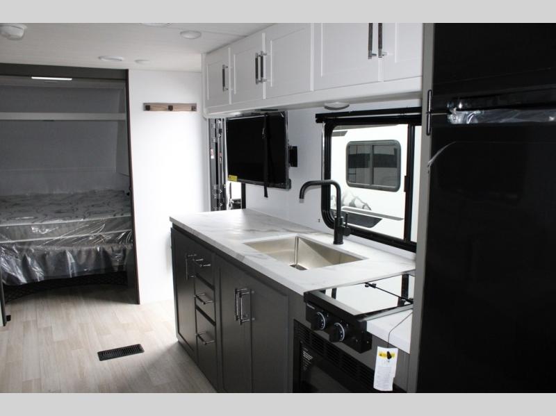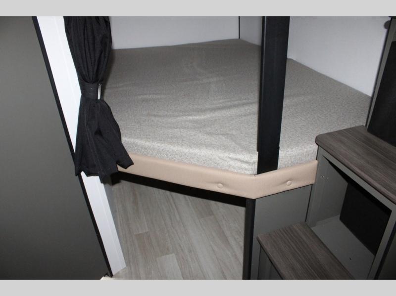 This travel trailer is designed for discerning families who crave adventure! The double-sized bunks provides a snug and inviting sleeping spot for kids, while the immaculately appointed full bathroom is thoughtfully designed for a refreshing stay. The kitchen is equipped with a generous pantry for storing gourmet ingredients, a high-performance refrigerator for keeping drinks and meals perfectly chilled, a rapid-cooking microwave, and a precision-crafted two-burner cooktop for preparing exquisite meals. Expansive overhead cabinets provide ample storage for fine china and cookware. The stylish booth dinette provides an intimate and convivial spot for meals and snacks, while the plush jackknife sofa offers a comfortable seating area that can be converted into a luxurious sleeping space. And after a long day in the woods, rest in the private front bedroom featuring a sumptuous queen-sized bed with a convenient nightstand and spacious dual wardrobes on each side.