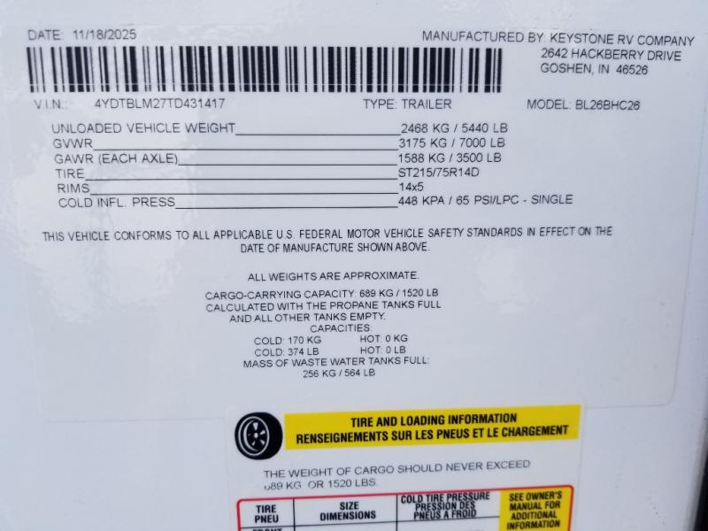 New 2026 Keystone RV Bullet Classic 26BHC Travel Trailer
