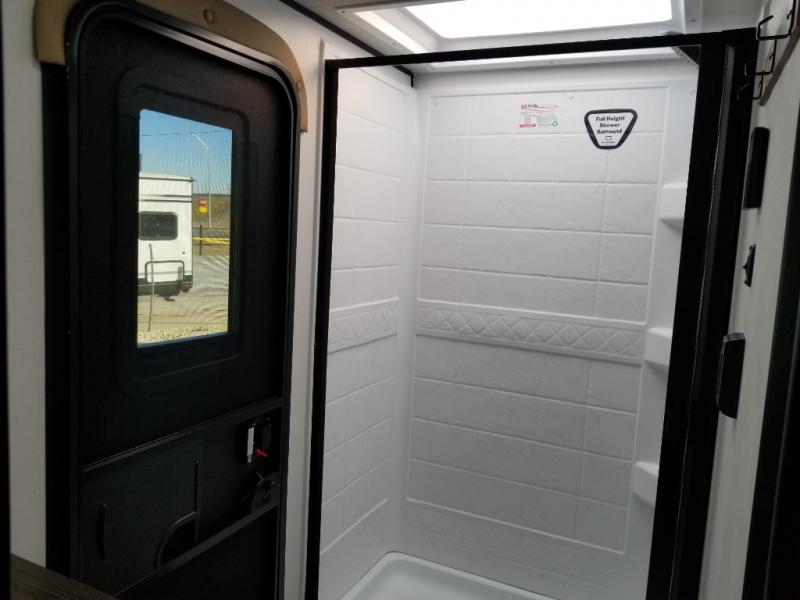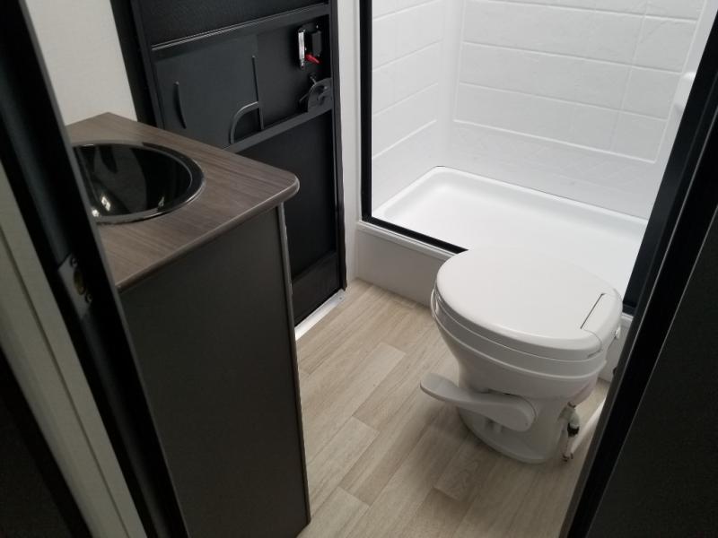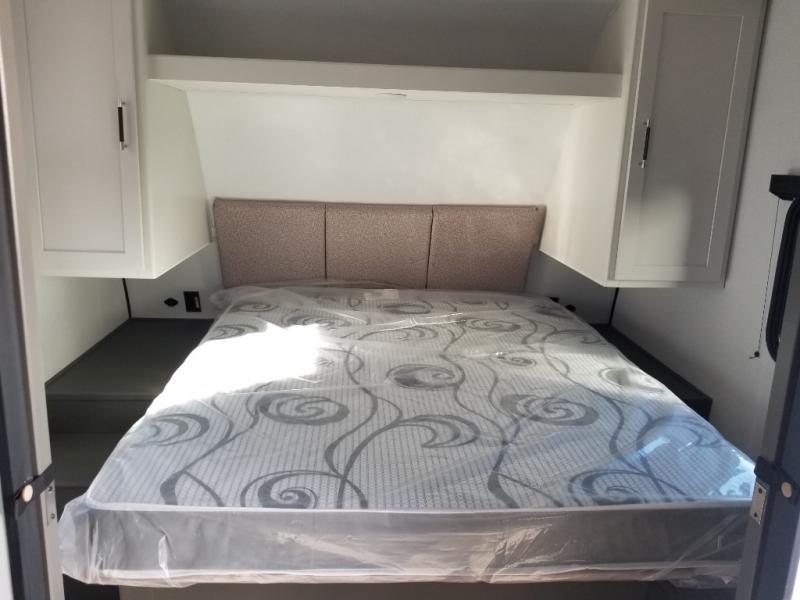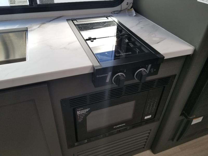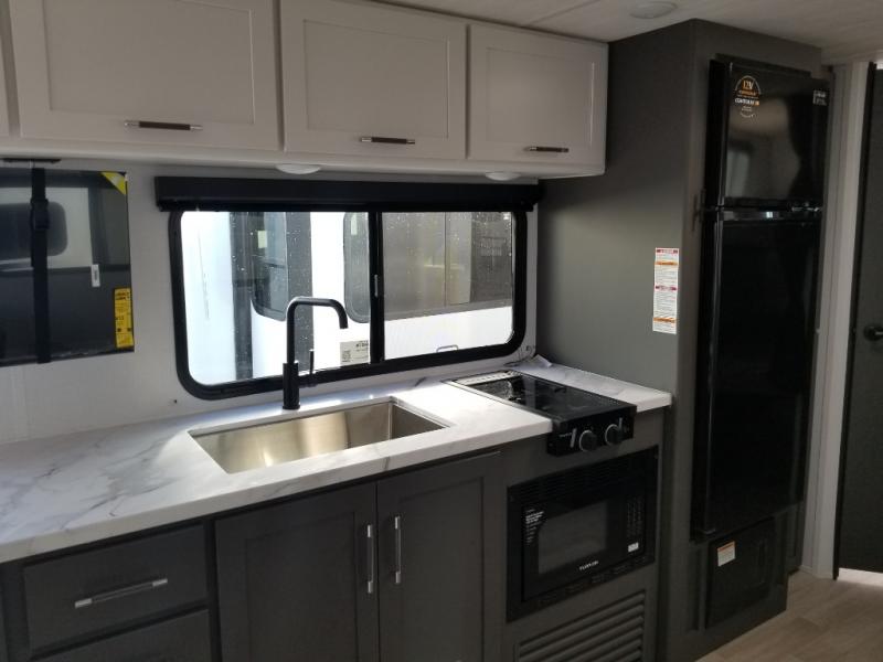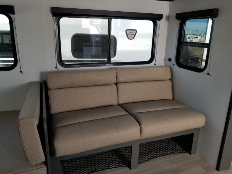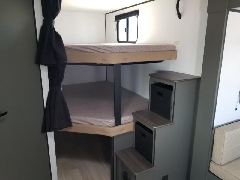 This travel trailer is designed for discerning families who crave adventure! The double-sized bunks provides a snug and inviting sleeping spot for kids, while the immaculately appointed full bathroom is thoughtfully designed for a refreshing stay. The kitchen is equipped with a generous pantry for storing gourmet ingredients, a high-performance refrigerator for keeping drinks and meals perfectly chilled, a rapid-cooking microwave, and a precision-crafted two-burner cooktop for preparing exquisite meals. Expansive overhead cabinets provide ample storage for fine china and cookware. The stylish booth dinette provides an intimate and convivial spot for meals and snacks, while the plush jackknife sofa offers a comfortable seating area that can be converted into a luxurious sleeping space. And after a long day in the woods, rest in the private front bedroom featuring a sumptuous queen-sized bed with a convenient nightstand and spacious dual wardrobes on each side.