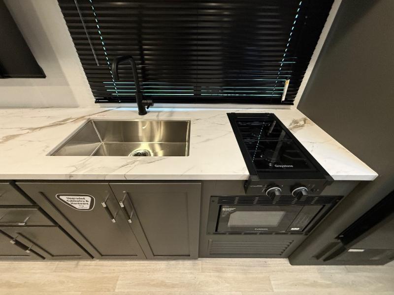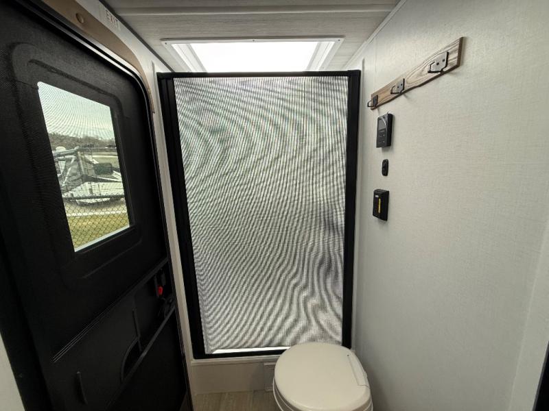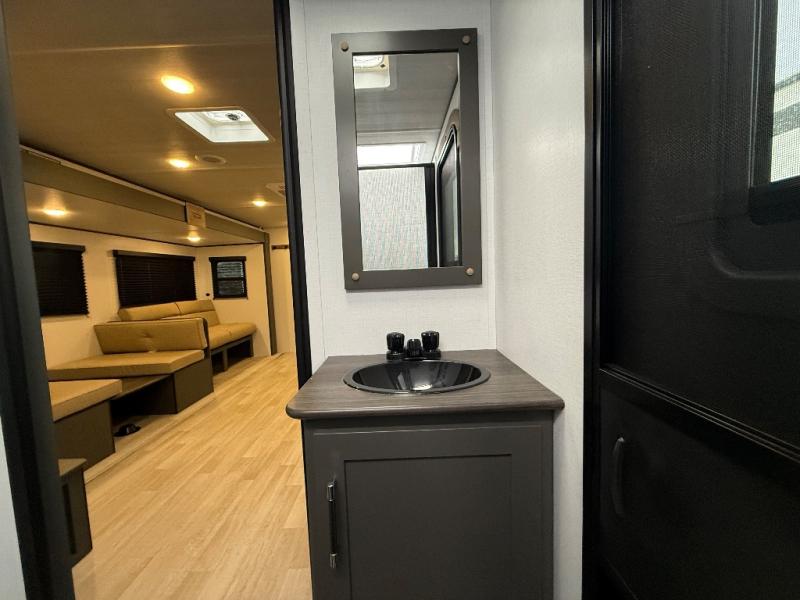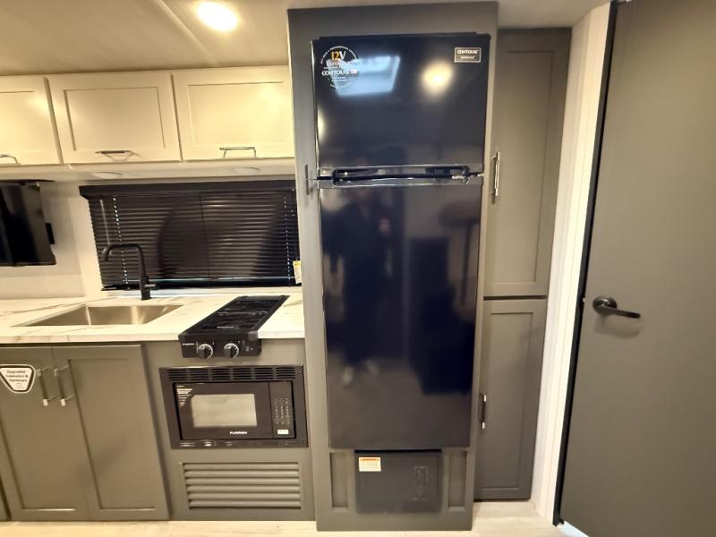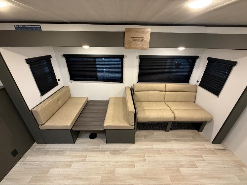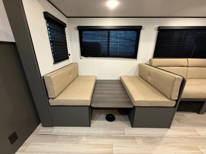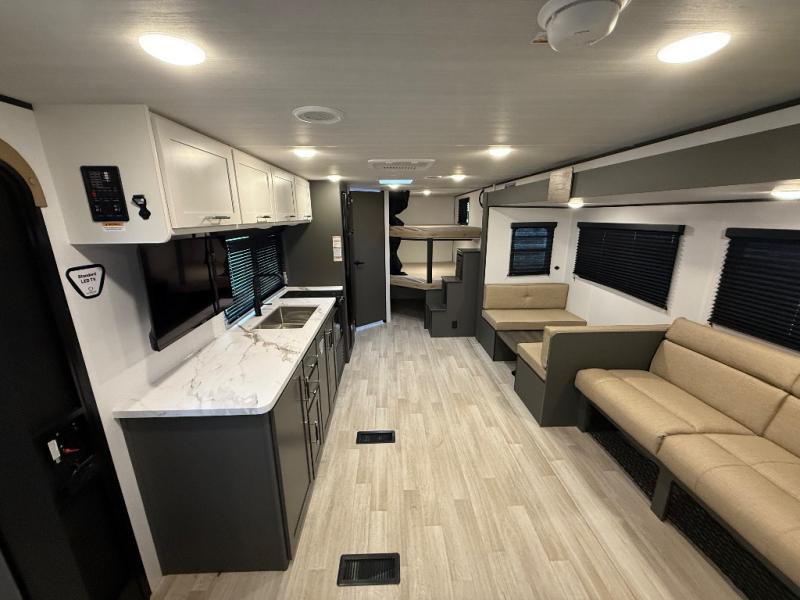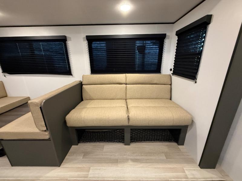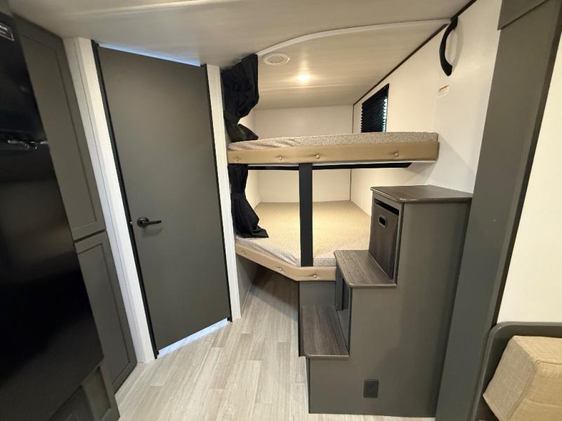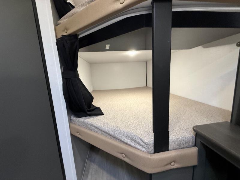 This travel trailer is designed for discerning families who crave adventure! The double-sized bunks provides a snug and inviting sleeping spot for kids, while the immaculately appointed full bathroom is thoughtfully designed for a refreshing stay. The kitchen is equipped with a generous pantry for storing gourmet ingredients, a high-performance refrigerator for keeping drinks and meals perfectly chilled, a rapid-cooking microwave, and a precision-crafted two-burner cooktop for preparing exquisite meals. Expansive overhead cabinets provide ample storage for fine china and cookware. The stylish booth dinette provides an intimate and convivial spot for meals and snacks, while the plush jackknife sofa offers a comfortable seating area that can be converted into a luxurious sleeping space. And after a long day in the woods, rest in the private front bedroom featuring a sumptuous queen-sized bed with a convenient nightstand and spacious dual wardrobes on each side.