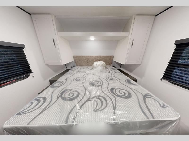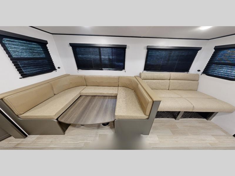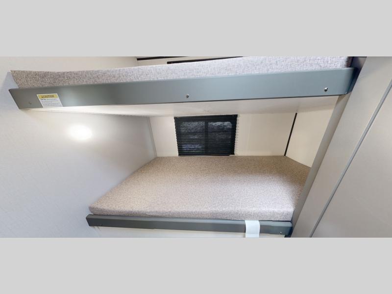 Perfect for epic road trips, serene camping excursions, or rejuvenating getaways! The trailer features four plush bunk beds, providing a cozy and inviting sleeping spot for kids or guests. A generous wardrobe offers ample storage for clothes and personal items. The full bathroom is impeccably designed and equipped with everything you need. Further, the spacious U-shaped dinette provides a warm and welcoming spot for meals and snacks, while the comfortable jackknife sofa offers a relaxing seating area that can be converted into a luxurious sleeping space. The high-performance 12V refrigerator keeps drinks and snacks perfectly chilled, and the rapid-cooking microwave provides quick reheating. Finally, after a long day of adventures, relax in the front bedroom featuring a sumptuous queen-sized bed with spacious wardrobes and convenient nightstands on each side, providing plenty of storage for your finest attire and personal items.